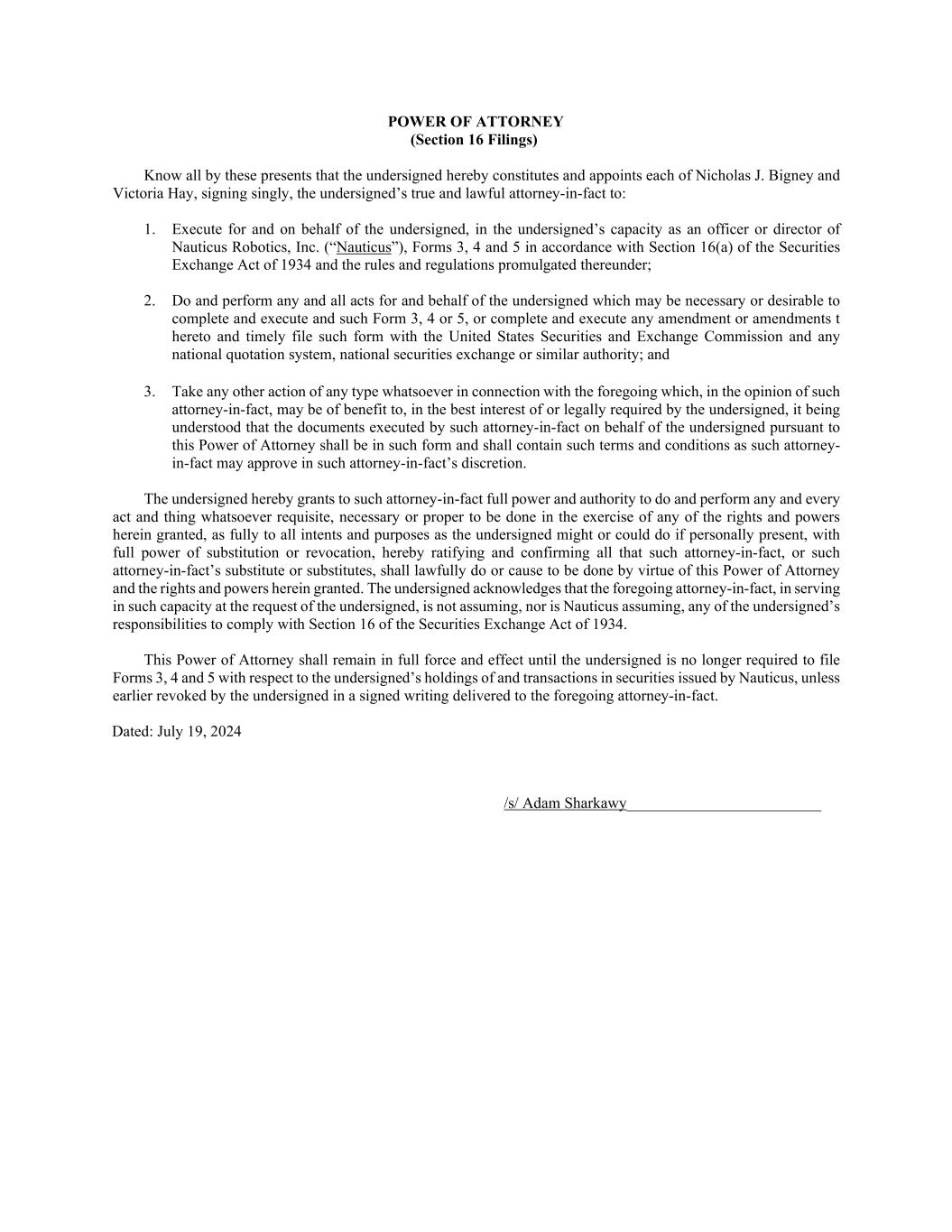 POWER OF ATTORNEY (Section 16 Filings) Know all by these presents that the undersigned hereby constitutes and appoints each of Nicholas J. Bigney and Victoria Hay, signing singly, the undersigned’s true and lawful attorney-in-fact to: 1. Execute for and on behalf of the undersigned, in the undersigned’s capacity as an officer or director of Nauticus Robotics, Inc. (“Nauticus”), Forms 3, 4 and 5 in accordance with Section 16(a) of the Securities Exchange Act of 1934 and the rules and regulations promulgated thereunder; 2. Do and perform any and all acts for and behalf of the undersigned which may be necessary or desirable to complete and execute and such Form 3, 4 or 5, or complete and execute any amendment or amendments t hereto and timely file such form with the United States Securities and Exchange Commission and any national quotation system, national securities exchange or similar authority; and 3. Take any other action of any type whatsoever in connection with the foregoing which, in the opinion of such attorney-in-fact, may be of benefit to, in the best interest of or legally required by the undersigned, it being understood that the documents executed by such attorney-in-fact on behalf of the undersigned pursuant to this Power of Attorney shall be in such form and shall contain such terms and conditions as such attorney- in-fact may approve in such attorney-in-fact’s discretion. The undersigned hereby grants to such attorney-in-fact full power and authority to do and perform any and every act and thing whatsoever requisite, necessary or proper to be done in the exercise of any of the rights and powers herein granted, as fully to all intents and purposes as the undersigned might or could do if personally present, with full power of substitution or revocation, hereby ratifying and confirming all that such attorney-in-fact, or such attorney-in-fact’s substitute or substitutes, shall lawfully do or cause to be done by virtue of this Power of Attorney and the rights and powers herein granted. The undersigned acknowledges that the foregoing attorney-in-fact, in serving in such capacity at the request of the undersigned, is not assuming, nor is Nauticus assuming, any of the undersigned’s responsibilities to comply with Section 16 of the Securities Exchange Act of 1934. This Power of Attorney shall remain in full force and effect until the undersigned is no longer required to file Forms 3, 4 and 5 with respect to the undersigned’s holdings of and transactions in securities issued by Nauticus, unless earlier revoked by the undersigned in a signed writing delivered to the foregoing attorney-in-fact. Dated: July 19, 2024 /s/ Adam Sharkawy_________________________