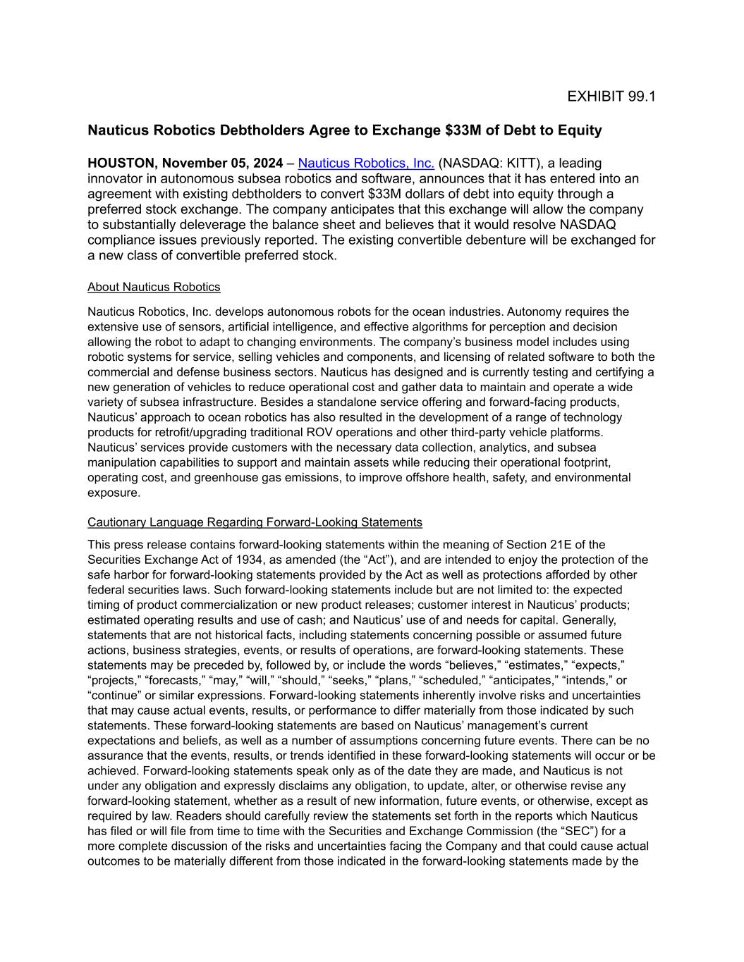 EXHIBIT 99.1 Nauticus Robotics Debtholders Agree to Exchange $33M of Debt to Equity HOUSTON, November 05, 2024 – Nauticus Robotics, Inc. (NASDAQ: KITT), a leading innovator in autonomous subsea robotics and software, announces that it has entered into an agreement with existing debtholders to convert $33M dollars of debt into equity through a preferred stock exchange. The company anticipates that this exchange will allow the company to substantially deleverage the balance sheet and believes that it would resolve NASDAQ compliance issues previously reported. The existing convertible debenture will be exchanged for a new class of convertible preferred stock. About Nauticus Robotics Nauticus Robotics, Inc. develops autonomous robots for the ocean industries. Autonomy requires the extensive use of sensors, artificial intelligence, and effective algorithms for perception and decision allowing the robot to adapt to changing environments. The company’s business model includes using robotic systems for service, selling vehicles and components, and licensing of related software to both the commercial and defense business sectors. Nauticus has designed and is currently testing and certifying a new generation of vehicles to reduce operational cost and gather data to maintain and operate a wide variety of subsea infrastructure. Besides a standalone service offering and forward-facing products, Nauticus’ approach to ocean robotics has also resulted in the development of a range of technology products for retrofit/upgrading traditional ROV operations and other third-party vehicle platforms. Nauticus’ services provide customers with the necessary data collection, analytics, and subsea manipulation capabilities to support and maintain assets while reducing their operational footprint, operating cost, and greenhouse gas emissions, to improve offshore health, safety, and environmental exposure. Cautionary Language Regarding Forward-Looking Statements This press release contains forward-looking statements within the meaning of Section 21E of the Securities Exchange Act of 1934, as amended (the “Act”), and are intended to enjoy the protection of the safe harbor for forward-looking statements provided by the Act as well as protections afforded by other federal securities laws. Such forward-looking statements include but are not limited to: the expected timing of product commercialization or new product releases; customer interest in Nauticus’ products; estimated operating results and use of cash; and Nauticus’ use of and needs for capital. Generally, statements that are not historical facts, including statements concerning possible or assumed future actions, business strategies, events, or results of operations, are forward-looking statements. These statements may be preceded by, followed by, or include the words “believes,” “estimates,” “expects,” “projects,” “forecasts,” “may,” “will,” “should,” “seeks,” “plans,” “scheduled,” “anticipates,” “intends,” or “continue” or similar expressions. Forward-looking statements inherently involve risks and uncertainties that may cause actual events, results, or performance to differ materially from those indicated by such statements. These forward-looking statements are based on Nauticus’ management’s current expectations and beliefs, as well as a number of assumptions concerning future events. There can be no assurance that the events, results, or trends identified in these forward-looking statements will occur or be achieved. Forward-looking statements speak only as of the date they are made, and Nauticus is not under any obligation and expressly disclaims any obligation, to update, alter, or otherwise revise any forward-looking statement, whether as a result of new information, future events, or otherwise, except as required by law. Readers should carefully review the statements set forth in the reports which Nauticus has filed or will file from time to time with the Securities and Exchange Commission (the “SEC”) for a more complete discussion of the risks and uncertainties facing the Company and that could cause actual outcomes to be materially different from those indicated in the forward-looking statements made by the
