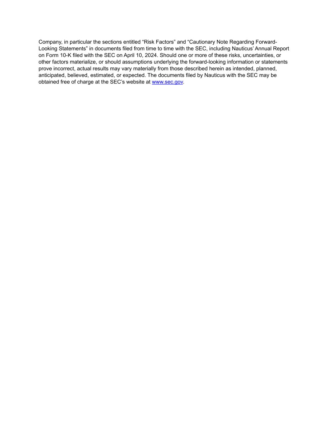 Company, in particular the sections entitled “Risk Factors” and “Cautionary Note Regarding Forward- Looking Statements” in documents filed from time to time with the SEC, including Nauticus’ Annual Report on Form 10-K filed with the SEC on April 10, 2024. Should one or more of these risks, uncertainties, or other factors materialize, or should assumptions underlying the forward-looking information or statements prove incorrect, actual results may vary materially from those described herein as intended, planned, anticipated, believed, estimated, or expected. The documents filed by Nauticus with the SEC may be obtained free of charge at the SEC’s website at www.sec.gov.