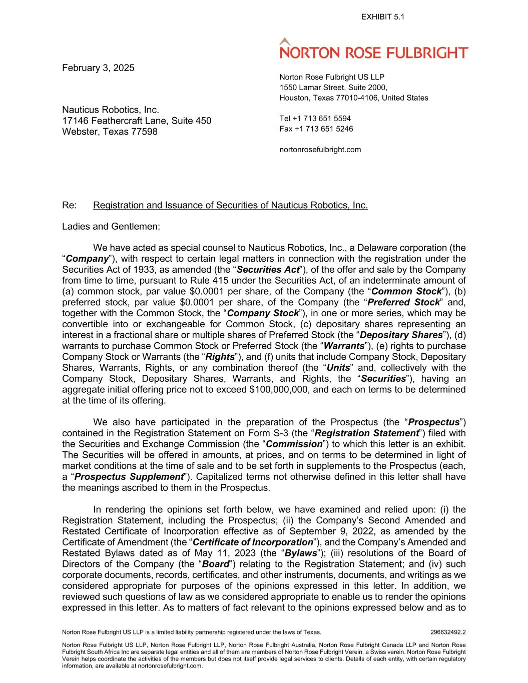 296632492.2 Norton Rose Fulbright US LLP 1550 Lamar Street, Suite 2000, Houston, Texas 77010-4106, United States Tel +1 713 651 5594 Fax +1 713 651 5246 nortonrosefulbright.com Norton Rose Fulbright US LLP is a limited liability partnership registered under the laws of Texas. Norton Rose Fulbright US LLP, Norton Rose Fulbright LLP, Norton Rose Fulbright Australia, Norton Rose Fulbright Canada LLP and Norton Rose Fulbright South Africa Inc are separate legal entities and all of them are members of Norton Rose Fulbright Verein, a Swiss verein. Norton Rose Fulbright Verein helps coordinate the activities of the members but does not itself provide legal services to clients. Details of each entity, with certain regulatory information, are available at nortonrosefulbright.com. February 3, 2025 Nauticus Robotics, Inc. 17146 Feathercraft Lane, Suite 450 Webster, Texas 77598 Re: Registration and Issuance of Securities of Nauticus Robotics, Inc. Ladies and Gentlemen: We have acted as special counsel to Nauticus Robotics, Inc., a Delaware corporation (the “Company”), with respect to certain legal matters in connection with the registration under the Securities Act of 1933, as amended (the “Securities Act”), of the offer and sale by the Company from time to time, pursuant to Rule 415 under the Securities Act, of an indeterminate amount of (a) common stock, par value $0.0001 per share, of the Company (the “Common Stock”), (b) preferred stock, par value $0.0001 per share, of the Company (the “Preferred Stock” and, together with the Common Stock, the “Company Stock”), in one or more series, which may be convertible into or exchangeable for Common Stock, (c) depositary shares representing an interest in a fractional share or multiple shares of Preferred Stock (the “Depositary Shares”), (d) warrants to purchase Common Stock or Preferred Stock (the “Warrants”), (e) rights to purchase Company Stock or Warrants (the “Rights”), and (f) units that include Company Stock, Depositary Shares, Warrants, Rights, or any combination thereof (the “Units” and, collectively with the Company Stock, Depositary Shares, Warrants, and Rights, the “Securities”), having an aggregate initial offering price not to exceed $100,000,000, and each on terms to be determined at the time of its offering. We also have participated in the preparation of the Prospectus (the “Prospectus”) contained in the Registration Statement on Form S-3 (the “Registration Statement”) filed with the Securities and Exchange Commission (the “Commission”) to which this letter is an exhibit. The Securities will be offered in amounts, at prices, and on terms to be determined in light of market conditions at the time of sale and to be set forth in supplements to the Prospectus (each, a “Prospectus Supplement”). Capitalized terms not otherwise defined in this letter shall have the meanings ascribed to them in the Prospectus. In rendering the opinions set forth below, we have examined and relied upon: (i) the Registration Statement, including the Prospectus; (ii) the Company’s Second Amended and Restated Certificate of Incorporation effective as of September 9, 2022, as amended by the Certificate of Amendment (the “Certificate of Incorporation”), and the Company’s Amended and Restated Bylaws dated as of May 11, 2023 (the “Bylaws”); (iii) resolutions of the Board of Directors of the Company (the “Board”) relating to the Registration Statement; and (iv) such corporate documents, records, certificates, and other instruments, documents, and writings as we considered appropriate for purposes of the opinions expressed in this letter. In addition, we reviewed such questions of law as we considered appropriate to enable us to render the opinions expressed in this letter. As to matters of fact relevant to the opinions expressed below and as to EXHIBIT 5.1