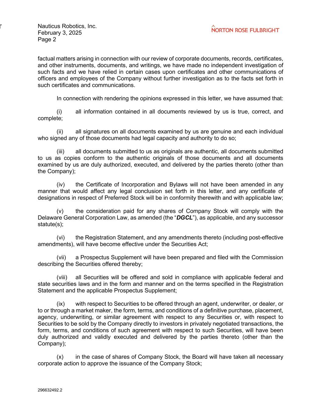 Nauticus Robotics, Inc. February 3, 2025 Page 2 296632492.2 factual matters arising in connection with our review of corporate documents, records, certificates, and other instruments, documents, and writings, we have made no independent investigation of such facts and we have relied in certain cases upon certificates and other communications of officers and employees of the Company without further investigation as to the facts set forth in such certificates and communications. In connection with rendering the opinions expressed in this letter, we have assumed that: (i) all information contained in all documents reviewed by us is true, correct, and complete; (ii) all signatures on all documents examined by us are genuine and each individual who signed any of those documents had legal capacity and authority to do so; (iii) all documents submitted to us as originals are authentic, all documents submitted to us as copies conform to the authentic originals of those documents and all documents examined by us are duly authorized, executed, and delivered by the parties thereto (other than the Company); (iv) the Certificate of Incorporation and Bylaws will not have been amended in any manner that would affect any legal conclusion set forth in this letter, and any certificate of designations in respect of Preferred Stock will be in conformity therewith and with applicable law; (v) the consideration paid for any shares of Company Stock will comply with the Delaware General Corporation Law, as amended (the “DGCL”), as applicable, and any successor statute(s); (vi) the Registration Statement, and any amendments thereto (including post-effective amendments), will have become effective under the Securities Act; (vii) a Prospectus Supplement will have been prepared and filed with the Commission describing the Securities offered thereby; (viii) all Securities will be offered and sold in compliance with applicable federal and state securities laws and in the form and manner and on the terms specified in the Registration Statement and the applicable Prospectus Supplement; (ix) with respect to Securities to be offered through an agent, underwriter, or dealer, or to or through a market maker, the form, terms, and conditions of a definitive purchase, placement, agency, underwriting, or similar agreement with respect to any Securities or, with respect to Securities to be sold by the Company directly to investors in privately negotiated transactions, the form, terms, and conditions of such agreement with respect to such Securities, will have been duly authorized and validly executed and delivered by the parties thereto (other than the Company); (x) in the case of shares of Company Stock, the Board will have taken all necessary corporate action to approve the issuance of the Company Stock;