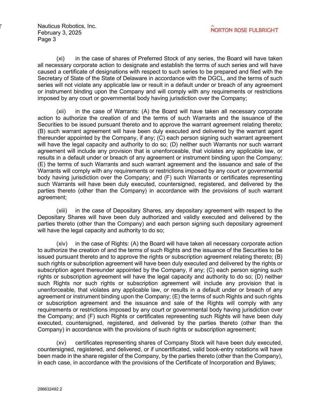 Nauticus Robotics, Inc. February 3, 2025 Page 3 296632492.2 (xi) in the case of shares of Preferred Stock of any series, the Board will have taken all necessary corporate action to designate and establish the terms of such series and will have caused a certificate of designations with respect to such series to be prepared and filed with the Secretary of State of the State of Delaware in accordance with the DGCL, and the terms of such series will not violate any applicable law or result in a default under or breach of any agreement or instrument binding upon the Company and will comply with any requirements or restrictions imposed by any court or governmental body having jurisdiction over the Company; (xii) in the case of Warrants: (A) the Board will have taken all necessary corporate action to authorize the creation of and the terms of such Warrants and the issuance of the Securities to be issued pursuant thereto and to approve the warrant agreement relating thereto; (B) such warrant agreement will have been duly executed and delivered by the warrant agent thereunder appointed by the Company, if any; (C) each person signing such warrant agreement will have the legal capacity and authority to do so; (D) neither such Warrants nor such warrant agreement will include any provision that is unenforceable, that violates any applicable law, or results in a default under or breach of any agreement or instrument binding upon the Company; (E) the terms of such Warrants and such warrant agreement and the issuance and sale of the Warrants will comply with any requirements or restrictions imposed by any court or governmental body having jurisdiction over the Company; and (F) such Warrants or certificates representing such Warrants will have been duly executed, countersigned, registered, and delivered by the parties thereto (other than the Company) in accordance with the provisions of such warrant agreement; (xiii) in the case of Depositary Shares, any depositary agreement with respect to the Depositary Shares will have been duly authorized and validly executed and delivered by the parties thereto (other than the Company) and each person signing such depositary agreement will have the legal capacity and authority to do so; (xiv) in the case of Rights: (A) the Board will have taken all necessary corporate action to authorize the creation of and the terms of such Rights and the issuance of the Securities to be issued pursuant thereto and to approve the rights or subscription agreement relating thereto; (B) such rights or subscription agreement will have been duly executed and delivered by the rights or subscription agent thereunder appointed by the Company, if any; (C) each person signing such rights or subscription agreement will have the legal capacity and authority to do so; (D) neither such Rights nor such rights or subscription agreement will include any provision that is unenforceable, that violates any applicable law, or results in a default under or breach of any agreement or instrument binding upon the Company; (E) the terms of such Rights and such rights or subscription agreement and the issuance and sale of the Rights will comply with any requirements or restrictions imposed by any court or governmental body having jurisdiction over the Company; and (F) such Rights or certificates representing such Rights will have been duly executed, countersigned, registered, and delivered by the parties thereto (other than the Company) in accordance with the provisions of such rights or subscription agreement; (xv) certificates representing shares of Company Stock will have been duly executed, countersigned, registered, and delivered, or if uncertificated, valid book-entry notations will have been made in the share register of the Company, by the parties thereto (other than the Company), in each case, in accordance with the provisions of the Certificate of Incorporation and Bylaws;