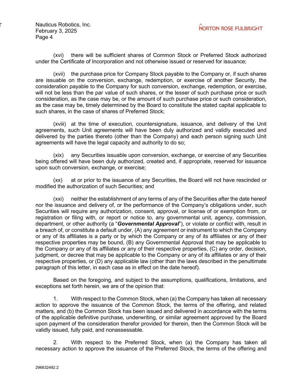 Nauticus Robotics, Inc. February 3, 2025 Page 4 296632492.2 (xvi) there will be sufficient shares of Common Stock or Preferred Stock authorized under the Certificate of Incorporation and not otherwise issued or reserved for issuance; (xvii) the purchase price for Company Stock payable to the Company or, if such shares are issuable on the conversion, exchange, redemption, or exercise of another Security, the consideration payable to the Company for such conversion, exchange, redemption, or exercise, will not be less than the par value of such shares, or the lesser of such purchase price or such consideration, as the case may be, or the amount of such purchase price or such consideration, as the case may be, timely determined by the Board to constitute the stated capital applicable to such shares, in the case of shares of Preferred Stock; (xviii) at the time of execution, countersignature, issuance, and delivery of the Unit agreements, such Unit agreements will have been duly authorized and validly executed and delivered by the parties thereto (other than the Company) and each person signing such Unit agreements will have the legal capacity and authority to do so; (xix) any Securities issuable upon conversion, exchange, or exercise of any Securities being offered will have been duly authorized, created and, if appropriate, reserved for issuance upon such conversion, exchange, or exercise; (xx) at or prior to the issuance of any Securities, the Board will not have rescinded or modified the authorization of such Securities; and (xxi) neither the establishment of any terms of any of the Securities after the date hereof nor the issuance and delivery of, or the performance of the Company’s obligations under, such Securities will require any authorization, consent, approval, or license of or exemption from, or registration or filing with, or report or notice to, any governmental unit, agency, commission, department, or other authority (a “Governmental Approval”), or violate or conflict with, result in a breach of, or constitute a default under, (A) any agreement or instrument to which the Company or any of its affiliates is a party or by which the Company or any of its affiliates or any of their respective properties may be bound, (B) any Governmental Approval that may be applicable to the Company or any of its affiliates or any of their respective properties, (C) any order, decision, judgment, or decree that may be applicable to the Company or any of its affiliates or any of their respective properties, or (D) any applicable law (other than the laws described in the penultimate paragraph of this letter, in each case as in effect on the date hereof). Based on the foregoing, and subject to the assumptions, qualifications, limitations, and exceptions set forth herein, we are of the opinion that: 1. With respect to the Common Stock, when (a) the Company has taken all necessary action to approve the issuance of the Common Stock, the terms of the offering, and related matters, and (b) the Common Stock has been issued and delivered in accordance with the terms of the applicable definitive purchase, underwriting, or similar agreement approved by the Board upon payment of the consideration therefor provided for therein, then the Common Stock will be validly issued, fully paid, and nonassessable. 2. With respect to the Preferred Stock, when (a) the Company has taken all necessary action to approve the issuance of the Preferred Stock, the terms of the offering and