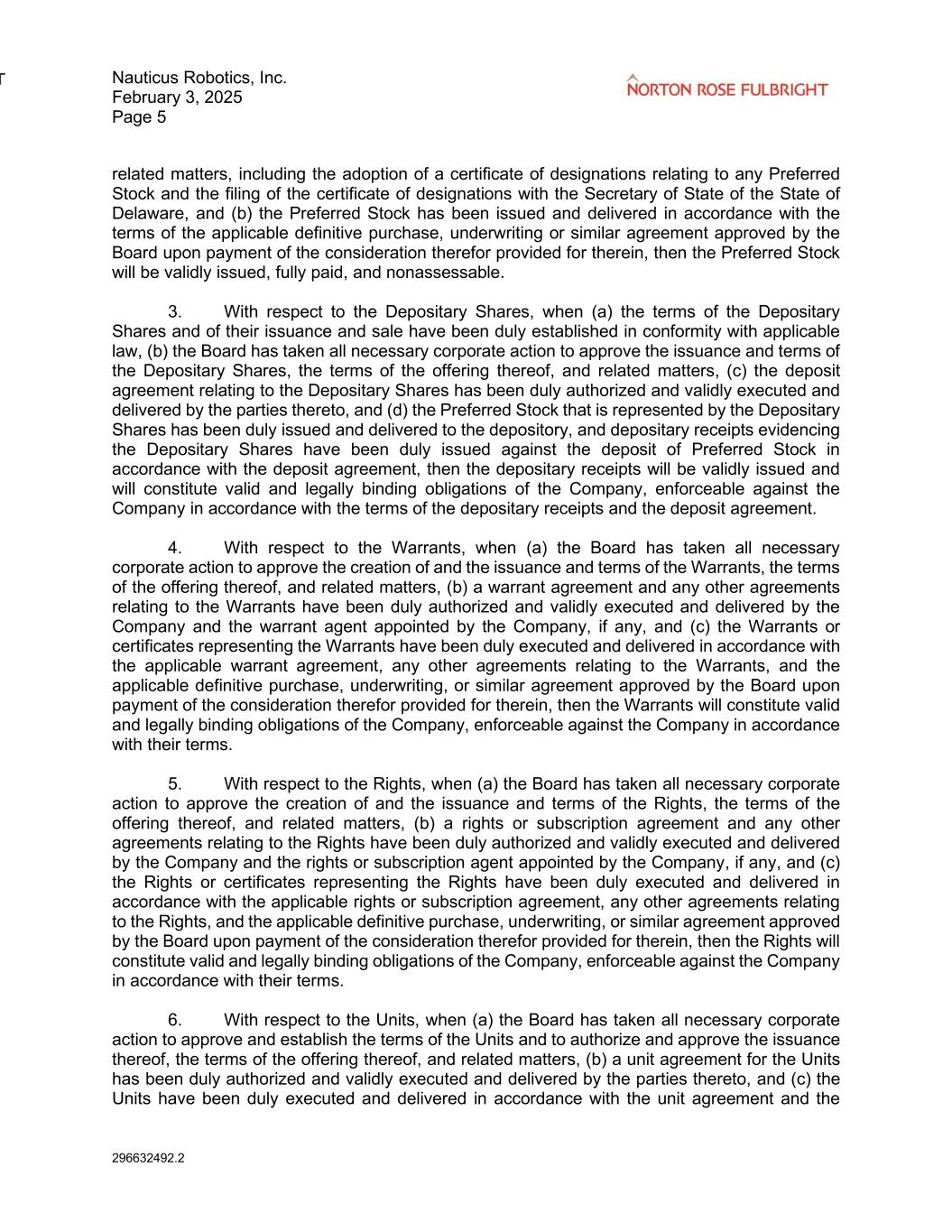 Nauticus Robotics, Inc. February 3, 2025 Page 5 296632492.2 related matters, including the adoption of a certificate of designations relating to any Preferred Stock and the filing of the certificate of designations with the Secretary of State of the State of Delaware, and (b) the Preferred Stock has been issued and delivered in accordance with the terms of the applicable definitive purchase, underwriting or similar agreement approved by the Board upon payment of the consideration therefor provided for therein, then the Preferred Stock will be validly issued, fully paid, and nonassessable. 3. With respect to the Depositary Shares, when (a) the terms of the Depositary Shares and of their issuance and sale have been duly established in conformity with applicable law, (b) the Board has taken all necessary corporate action to approve the issuance and terms of the Depositary Shares, the terms of the offering thereof, and related matters, (c) the deposit agreement relating to the Depositary Shares has been duly authorized and validly executed and delivered by the parties thereto, and (d) the Preferred Stock that is represented by the Depositary Shares has been duly issued and delivered to the depository, and depositary receipts evidencing the Depositary Shares have been duly issued against the deposit of Preferred Stock in accordance with the deposit agreement, then the depositary receipts will be validly issued and will constitute valid and legally binding obligations of the Company, enforceable against the Company in accordance with the terms of the depositary receipts and the deposit agreement. 4. With respect to the Warrants, when (a) the Board has taken all necessary corporate action to approve the creation of and the issuance and terms of the Warrants, the terms of the offering thereof, and related matters, (b) a warrant agreement and any other agreements relating to the Warrants have been duly authorized and validly executed and delivered by the Company and the warrant agent appointed by the Company, if any, and (c) the Warrants or certificates representing the Warrants have been duly executed and delivered in accordance with the applicable warrant agreement, any other agreements relating to the Warrants, and the applicable definitive purchase, underwriting, or similar agreement approved by the Board upon payment of the consideration therefor provided for therein, then the Warrants will constitute valid and legally binding obligations of the Company, enforceable against the Company in accordance with their terms. 5. With respect to the Rights, when (a) the Board has taken all necessary corporate action to approve the creation of and the issuance and terms of the Rights, the terms of the offering thereof, and related matters, (b) a rights or subscription agreement and any other agreements relating to the Rights have been duly authorized and validly executed and delivered by the Company and the rights or subscription agent appointed by the Company, if any, and (c) the Rights or certificates representing the Rights have been duly executed and delivered in accordance with the applicable rights or subscription agreement, any other agreements relating to the Rights, and the applicable definitive purchase, underwriting, or similar agreement approved by the Board upon payment of the consideration therefor provided for therein, then the Rights will constitute valid and legally binding obligations of the Company, enforceable against the Company in accordance with their terms. 6. With respect to the Units, when (a) the Board has taken all necessary corporate action to approve and establish the terms of the Units and to authorize and approve the issuance thereof, the terms of the offering thereof, and related matters, (b) a unit agreement for the Units has been duly authorized and validly executed and delivered by the parties thereto, and (c) the Units have been duly executed and delivered in accordance with the unit agreement and the