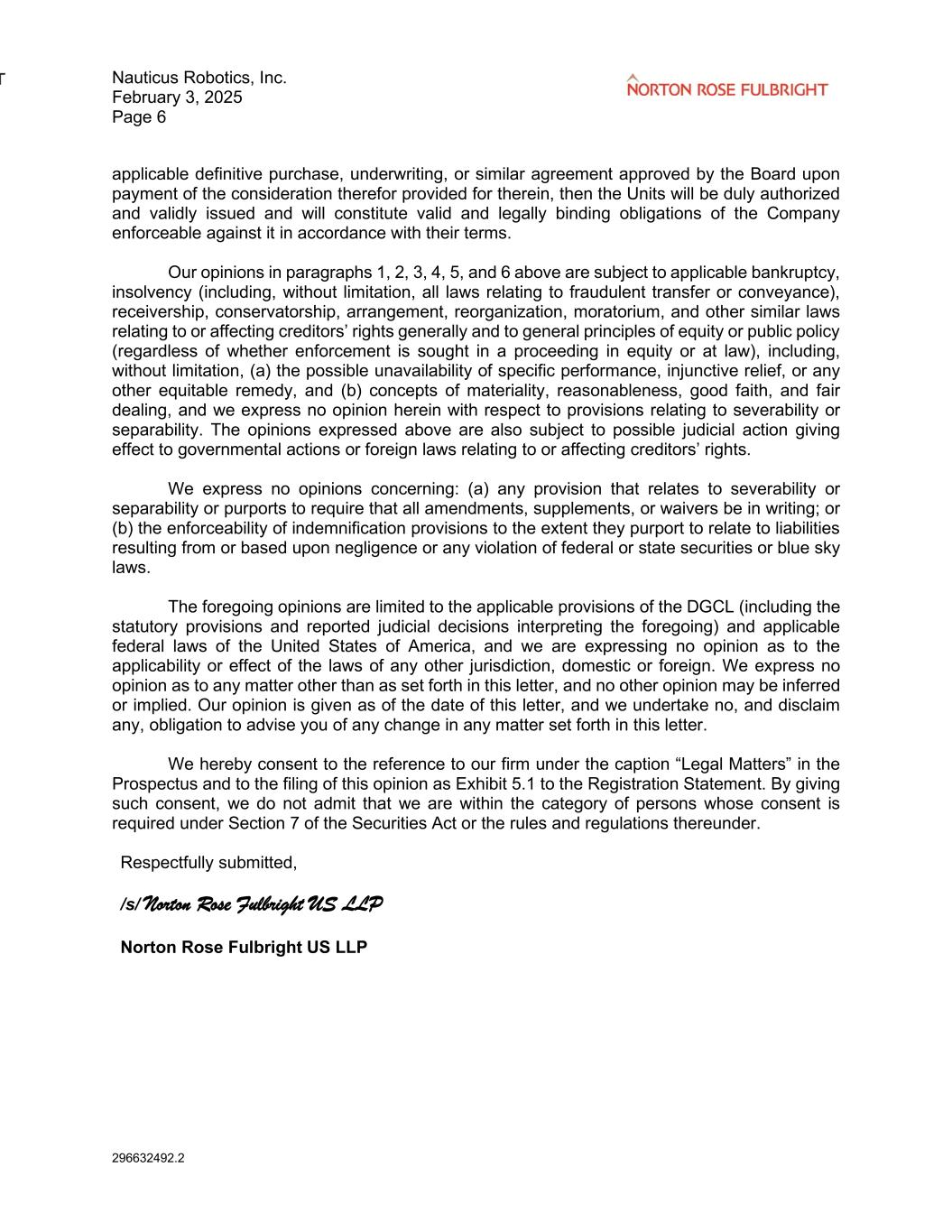 Nauticus Robotics, Inc. February 3, 2025 Page 6 296632492.2 applicable definitive purchase, underwriting, or similar agreement approved by the Board upon payment of the consideration therefor provided for therein, then the Units will be duly authorized and validly issued and will constitute valid and legally binding obligations of the Company enforceable against it in accordance with their terms. Our opinions in paragraphs 1, 2, 3, 4, 5, and 6 above are subject to applicable bankruptcy, insolvency (including, without limitation, all laws relating to fraudulent transfer or conveyance), receivership, conservatorship, arrangement, reorganization, moratorium, and other similar laws relating to or affecting creditors’ rights generally and to general principles of equity or public policy (regardless of whether enforcement is sought in a proceeding in equity or at law), including, without limitation, (a) the possible unavailability of specific performance, injunctive relief, or any other equitable remedy, and (b) concepts of materiality, reasonableness, good faith, and fair dealing, and we express no opinion herein with respect to provisions relating to severability or separability. The opinions expressed above are also subject to possible judicial action giving effect to governmental actions or foreign laws relating to or affecting creditors’ rights. We express no opinions concerning: (a) any provision that relates to severability or separability or purports to require that all amendments, supplements, or waivers be in writing; or (b) the enforceability of indemnification provisions to the extent they purport to relate to liabilities resulting from or based upon negligence or any violation of federal or state securities or blue sky laws. The foregoing opinions are limited to the applicable provisions of the DGCL (including the statutory provisions and reported judicial decisions interpreting the foregoing) and applicable federal laws of the United States of America, and we are expressing no opinion as to the applicability or effect of the laws of any other jurisdiction, domestic or foreign. We express no opinion as to any matter other than as set forth in this letter, and no other opinion may be inferred or implied. Our opinion is given as of the date of this letter, and we undertake no, and disclaim any, obligation to advise you of any change in any matter set forth in this letter. We hereby consent to the reference to our firm under the caption “Legal Matters” in the Prospectus and to the filing of this opinion as Exhibit 5.1 to the Registration Statement. By giving such consent, we do not admit that we are within the category of persons whose consent is required under Section 7 of the Securities Act or the rules and regulations thereunder. Respectfully submitted, /s/ Norton Rose Fulbright US LLP Norton Rose Fulbright US LLP