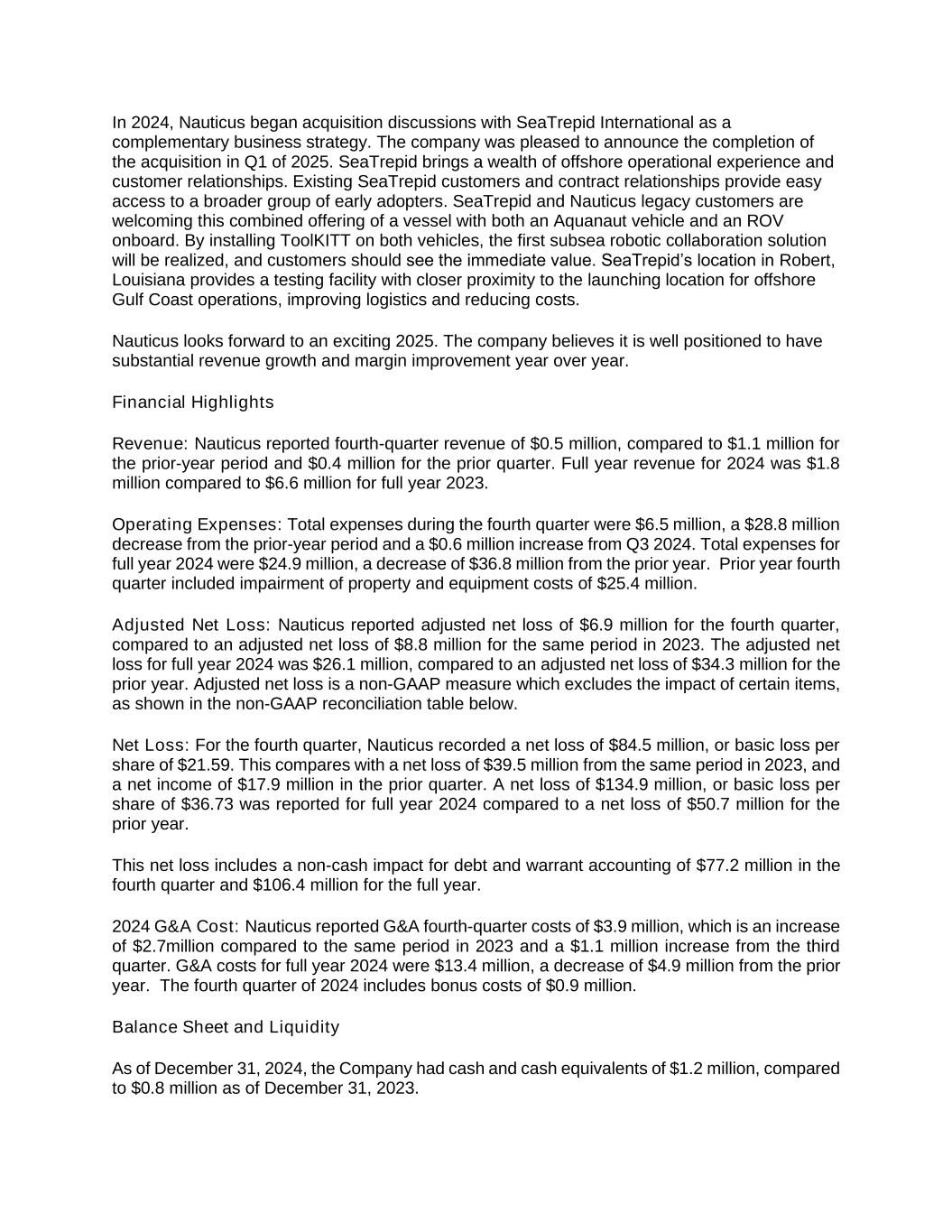 In 2024, Nauticus began acquisition discussions with SeaTrepid International as a complementary business strategy. The company was pleased to announce the completion of the acquisition in Q1 of 2025. SeaTrepid brings a wealth of offshore operational experience and customer relationships. Existing SeaTrepid customers and contract relationships provide easy access to a broader group of early adopters. SeaTrepid and Nauticus legacy customers are welcoming this combined offering of a vessel with both an Aquanaut vehicle and an ROV onboard. By installing ToolKITT on both vehicles, the first subsea robotic collaboration solution will be realized, and customers should see the immediate value. SeaTrepid’s location in Robert, Louisiana provides a testing facility with closer proximity to the launching location for offshore Gulf Coast operations, improving logistics and reducing costs. Nauticus looks forward to an exciting 2025. The company believes it is well positioned to have substantial revenue growth and margin improvement year over year. Financial Highlights Revenue: Nauticus reported fourth-quarter revenue of $0.5 million, compared to $1.1 million for the prior-year period and $0.4 million for the prior quarter. Full year revenue for 2024 was $1.8 million compared to $6.6 million for full year 2023. Operating Expenses: Total expenses during the fourth quarter were $6.5 million, a $28.8 million decrease from the prior-year period and a $0.6 million increase from Q3 2024. Total expenses for full year 2024 were $24.9 million, a decrease of $36.8 million from the prior year. Prior year fourth quarter included impairment of property and equipment costs of $25.4 million. Adjusted Net Loss: Nauticus reported adjusted net loss of $6.9 million for the fourth quarter, compared to an adjusted net loss of $8.8 million for the same period in 2023. The adjusted net loss for full year 2024 was $26.1 million, compared to an adjusted net loss of $34.3 million for the prior year. Adjusted net loss is a non-GAAP measure which excludes the impact of certain items, as shown in the non-GAAP reconciliation table below. Net Loss: For the fourth quarter, Nauticus recorded a net loss of $84.5 million, or basic loss per share of $21.59. This compares with a net loss of $39.5 million from the same period in 2023, and a net income of $17.9 million in the prior quarter. A net loss of $134.9 million, or basic loss per share of $36.73 was reported for full year 2024 compared to a net loss of $50.7 million for the prior year. This net loss includes a non-cash impact for debt and warrant accounting of $77.2 million in the fourth quarter and $106.4 million for the full year. 2024 G&A Cost: Nauticus reported G&A fourth-quarter costs of $3.9 million, which is an increase of $2.7million compared to the same period in 2023 and a $1.1 million increase from the third quarter. G&A costs for full year 2024 were $13.4 million, a decrease of $4.9 million from the prior year. The fourth quarter of 2024 includes bonus costs of $0.9 million. Balance Sheet and Liquidity As of December 31, 2024, the Company had cash and cash equivalents of $1.2 million, compared to $0.8 million as of December 31, 2023.