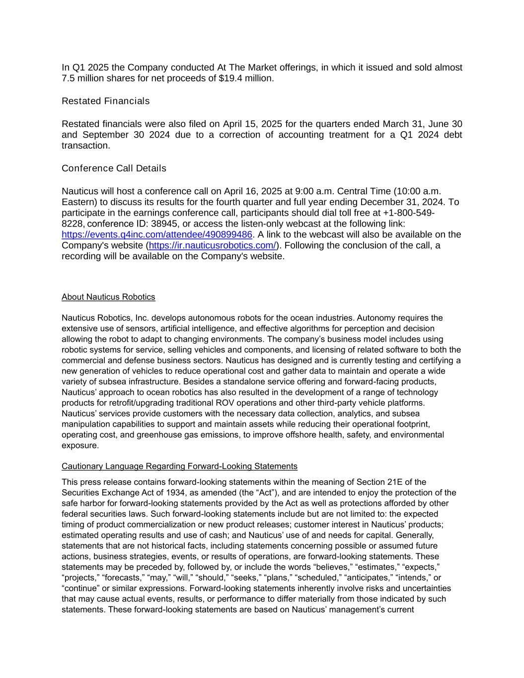 In Q1 2025 the Company conducted At The Market offerings, in which it issued and sold almost 7.5 million shares for net proceeds of $19.4 million. Restated Financials Restated financials were also filed on April 15, 2025 for the quarters ended March 31, June 30 and September 30 2024 due to a correction of accounting treatment for a Q1 2024 debt transaction. Conference Call Details Nauticus will host a conference call on April 16, 2025 at 9:00 a.m. Central Time (10:00 a.m. Eastern) to discuss its results for the fourth quarter and full year ending December 31, 2024. To participate in the earnings conference call, participants should dial toll free at +1-800-549- 8228, conference ID: 38945, or access the listen-only webcast at the following link: https://events.q4inc.com/attendee/490899486. A link to the webcast will also be available on the Company's website (https://ir.nauticusrobotics.com/). Following the conclusion of the call, a recording will be available on the Company's website. About Nauticus Robotics Nauticus Robotics, Inc. develops autonomous robots for the ocean industries. Autonomy requires the extensive use of sensors, artificial intelligence, and effective algorithms for perception and decision allowing the robot to adapt to changing environments. The company’s business model includes using robotic systems for service, selling vehicles and components, and licensing of related software to both the commercial and defense business sectors. Nauticus has designed and is currently testing and certifying a new generation of vehicles to reduce operational cost and gather data to maintain and operate a wide variety of subsea infrastructure. Besides a standalone service offering and forward-facing products, Nauticus’ approach to ocean robotics has also resulted in the development of a range of technology products for retrofit/upgrading traditional ROV operations and other third-party vehicle platforms. Nauticus’ services provide customers with the necessary data collection, analytics, and subsea manipulation capabilities to support and maintain assets while reducing their operational footprint, operating cost, and greenhouse gas emissions, to improve offshore health, safety, and environmental exposure. Cautionary Language Regarding Forward-Looking Statements This press release contains forward-looking statements within the meaning of Section 21E of the Securities Exchange Act of 1934, as amended (the “Act”), and are intended to enjoy the protection of the safe harbor for forward-looking statements provided by the Act as well as protections afforded by other federal securities laws. Such forward-looking statements include but are not limited to: the expected timing of product commercialization or new product releases; customer interest in Nauticus’ products; estimated operating results and use of cash; and Nauticus’ use of and needs for capital. Generally, statements that are not historical facts, including statements concerning possible or assumed future actions, business strategies, events, or results of operations, are forward-looking statements. These statements may be preceded by, followed by, or include the words “believes,” “estimates,” “expects,” “projects,” “forecasts,” “may,” “will,” “should,” “seeks,” “plans,” “scheduled,” “anticipates,” “intends,” or “continue” or similar expressions. Forward-looking statements inherently involve risks and uncertainties that may cause actual events, results, or performance to differ materially from those indicated by such statements. These forward-looking statements are based on Nauticus’ management’s current