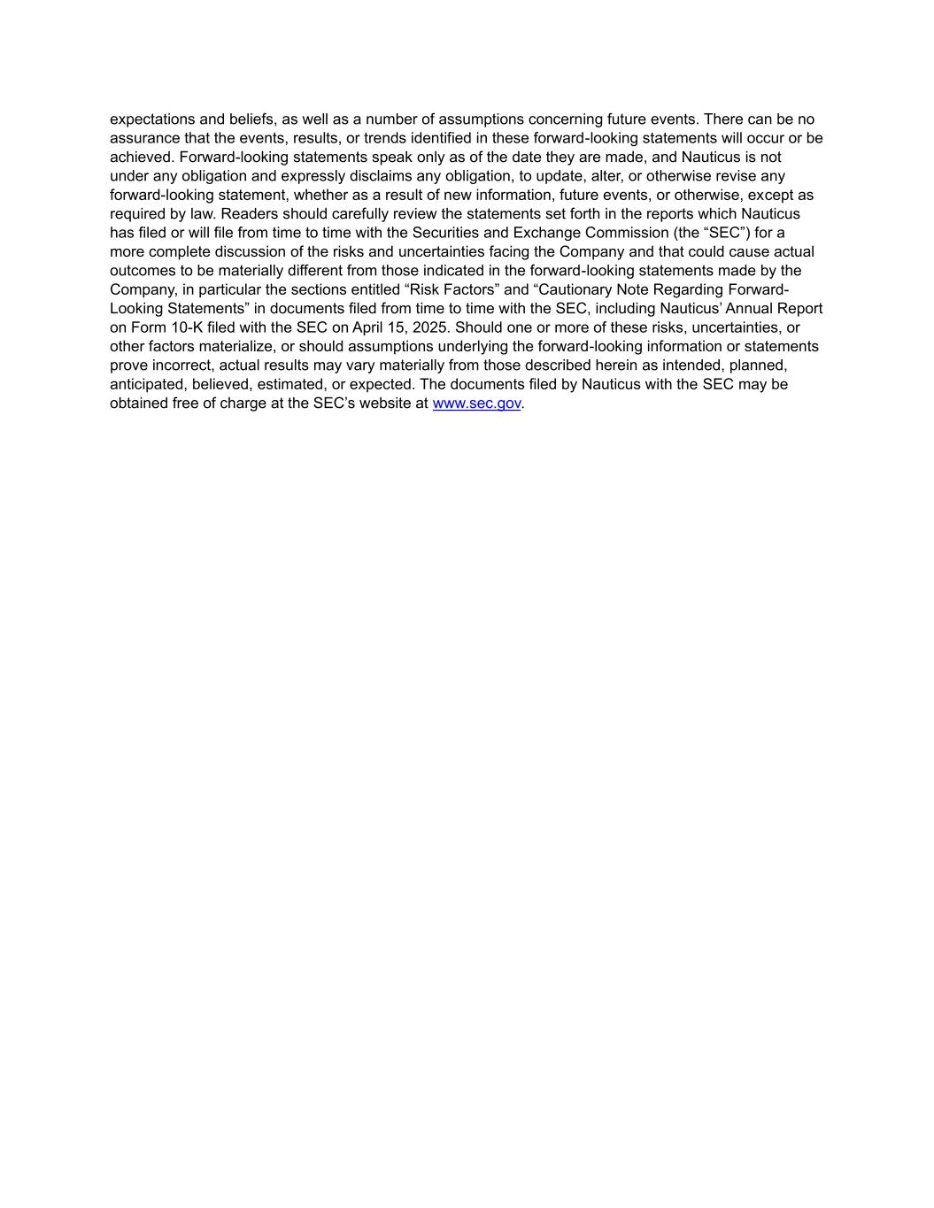 expectations and beliefs, as well as a number of assumptions concerning future events. There can be no assurance that the events, results, or trends identified in these forward-looking statements will occur or be achieved. Forward-looking statements speak only as of the date they are made, and Nauticus is not under any obligation and expressly disclaims any obligation, to update, alter, or otherwise revise any forward-looking statement, whether as a result of new information, future events, or otherwise, except as required by law. Readers should carefully review the statements set forth in the reports which Nauticus has filed or will file from time to time with the Securities and Exchange Commission (the “SEC”) for a more complete discussion of the risks and uncertainties facing the Company and that could cause actual outcomes to be materially different from those indicated in the forward-looking statements made by the Company, in particular the sections entitled “Risk Factors” and “Cautionary Note Regarding Forward- Looking Statements” in documents filed from time to time with the SEC, including Nauticus’ Annual Report on Form 10-K filed with the SEC on April 15, 2025. Should one or more of these risks, uncertainties, or other factors materialize, or should assumptions underlying the forward-looking information or statements prove incorrect, actual results may vary materially from those described herein as intended, planned, anticipated, believed, estimated, or expected. The documents filed by Nauticus with the SEC may be obtained free of charge at the SEC’s website at www.sec.gov.