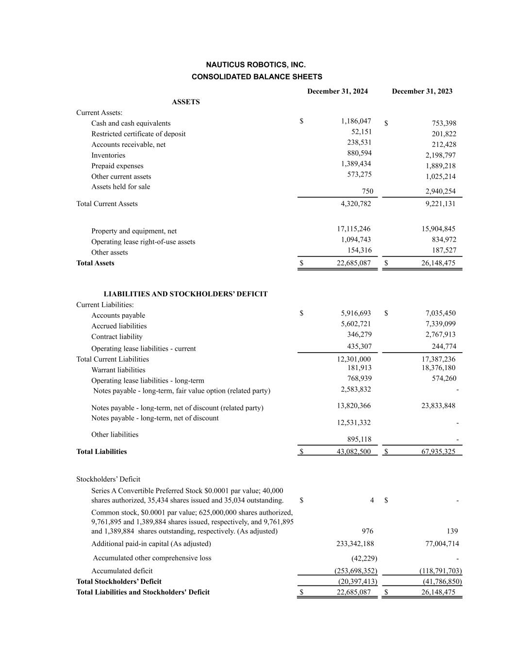 NAUTICUS ROBOTICS, INC. CONSOLIDATED BALANCE SHEETS December 31, 2024 December 31, 2023 ASSETS Current Assets: Cash and cash equivalents $ 1,186,047 $ 753,398 Restricted certificate of deposit 52,151 201,822 Accounts receivable, net 238,531 212,428 Inventories 880,594 2,198,797 Prepaid expenses 1,389,434 1,889,218 Other current assets 573,275 1,025,214 Assets held for sale 750 2,940,254 Total Current Assets 4,320,782 9,221,131 Property and equipment, net 17,115,246 15,904,845 Operating lease right-of-use assets 1,094,743 834,972 Other assets 154,316 187,527 Total Assets $ 22,685,087 $ 26,148,475 LIABILITIES AND STOCKHOLDERS’ DEFICIT Current Liabilities: Accounts payable $ 5,916,693 $ 7,035,450 Accrued liabilities 5,602,721 7,339,099 Contract liability 346,279 2,767,913 Operating lease liabilities - current 435,307 244,774 Total Current Liabilities 12,301,000 17,387,236 Warrant liabilities 181,913 18,376,180 Operating lease liabilities - long-term 768,939 574,260 Notes payable - long-term, fair value option (related party) 2,583,832 - Notes payable - long-term, net of discount (related party) 13,820,366 23,833,848 Notes payable - long-term, net of discount 12,531,332 - Other liabilities 895,118 - Total Liabilities $ 43,082,500 $ 67,935,325 Stockholders’ Deficit Series A Convertible Preferred Stock $0.0001 par value; 40,000 shares authorized, 35,434 shares issued and 35,034 outstanding. $ 4 $ - Common stock, $0.0001 par value; 625,000,000 shares authorized, 9,761,895 and 1,389,884 shares issued, respectively, and 9,761,895 and 1,389,884 shares outstanding, respectively. (As adjusted) 976 139 Additional paid-in capital (As adjusted) 233,342,188 77,004,714 Accumulated other comprehensive loss (42,229) - Accumulated deficit (253,698,352) (118,791,703) Total Stockholders’ Deficit (20,397,413) (41,786,850) Total Liabilities and Stockholders' Deficit $ 22,685,087 $ 26,148,475