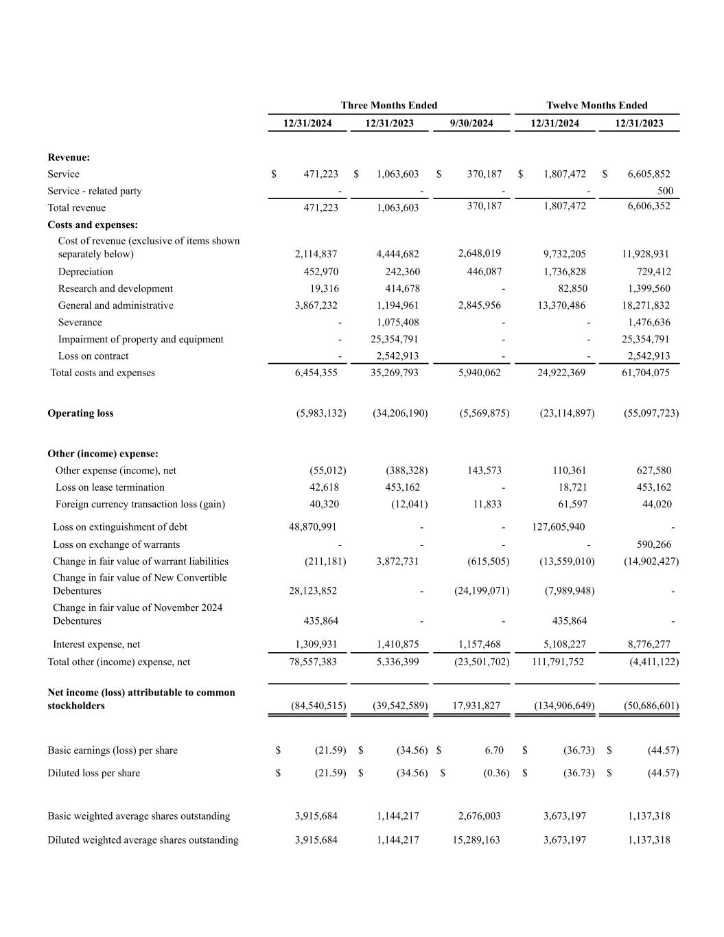Three Months Ended Twelve Months Ended 12/31/2024 12/31/2023 9/30/2024 12/31/2024 12/31/2023 Revenue: Service $ 471,223 $ 1,063,603 $ 370,187 $ 1,807,472 $ 6,605,852 Service - related party - - - - 500 Total revenue 471,223 1,063,603 370,187 1,807,472 6,606,352 Costs and expenses: Cost of revenue (exclusive of items shown separately below) 2,114,837 4,444,682 2,648,019 9,732,205 11,928,931 Depreciation 452,970 242,360 446,087 1,736,828 729,412 Research and development 19,316 414,678 - 82,850 1,399,560 General and administrative 3,867,232 1,194,961 2,845,956 13,370,486 18,271,832 Severance - 1,075,408 - - 1,476,636 Impairment of property and equipment - 25,354,791 - - 25,354,791 Loss on contract - 2,542,913 - - 2,542,913 Total costs and expenses 6,454,355 35,269,793 5,940,062 24,922,369 61,704,075 Operating loss (5,983,132) (34,206,190) (5,569,875) (23,114,897) (55,097,723) Other (income) expense: Other expense (income), net (55,012) (388,328) 143,573 110,361 627,580 Loss on lease termination 42,618 453,162 - 18,721 453,162 Foreign currency transaction loss (gain) 40,320 (12,041) 11,833 61,597 44,020 Loss on extinguishment of debt 48,870,991 - - 127,605,940 - Loss on exchange of warrants - - - - 590,266 Change in fair value of warrant liabilities (211,181) 3,872,731 (615,505) (13,559,010) (14,902,427) Change in fair value of New Convertible Debentures 28,123,852 - (24,199,071) (7,989,948) - Change in fair value of November 2024 Debentures 435,864 - - 435,864 - Interest expense, net 1,309,931 1,410,875 1,157,468 5,108,227 8,776,277 Total other (income) expense, net 78,557,383 5,336,399 (23,501,702) 111,791,752 (4,411,122) Net income (loss) attributable to common stockholders (84,540,515) (39,542,589) 17,931,827 (134,906,649) (50,686,601) Basic earnings (loss) per share $ (21.59) $ (34.56) $ 6.70 $ (36.73) $ (44.57) Diluted loss per share $ (21.59) $ (34.56) $ (0.36) $ (36.73) $ (44.57) Basic weighted average shares outstanding 3,915,684 1,144,217 2,676,003 3,673,197 1,137,318 Diluted weighted average shares outstanding 3,915,684 1,144,217 15,289,163 3,673,197 1,137,318