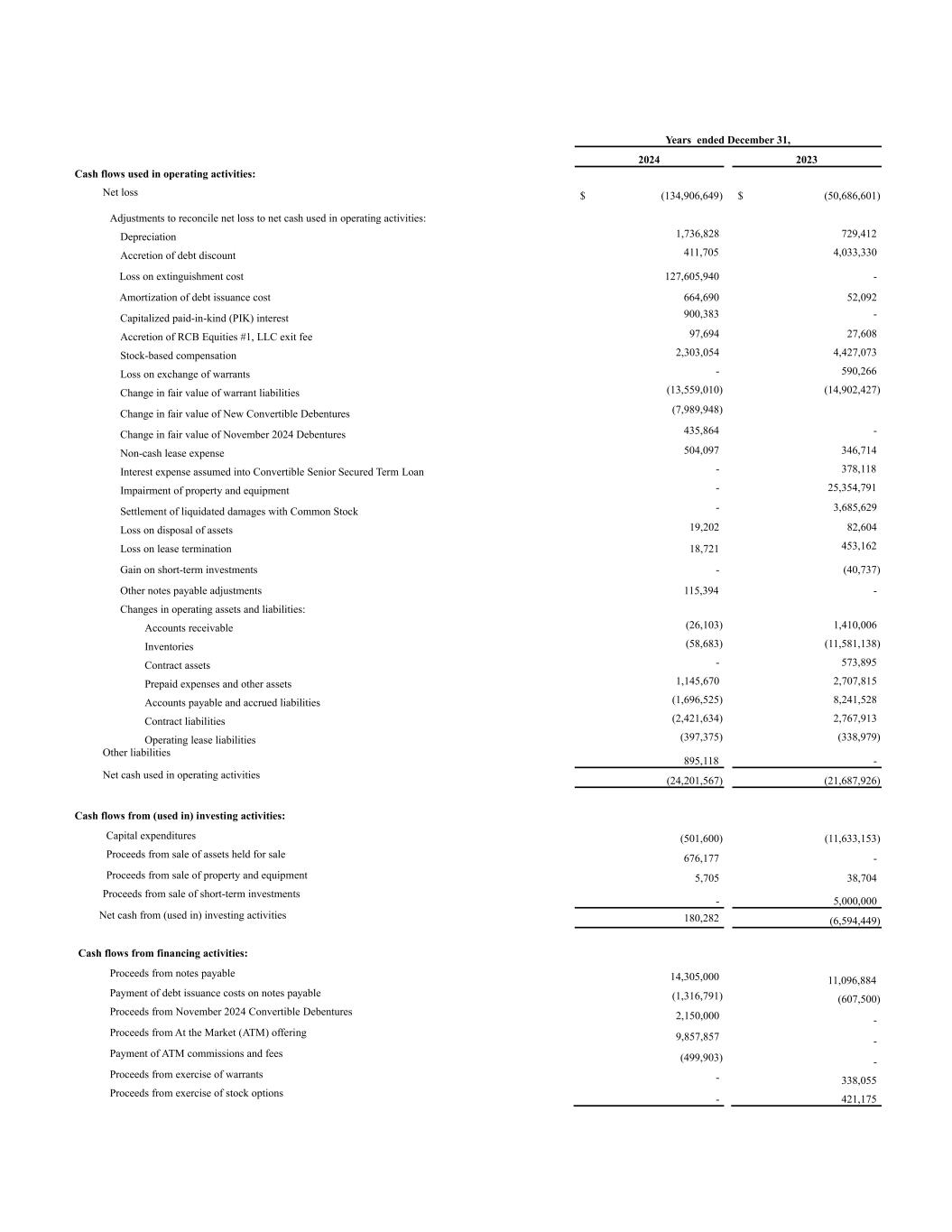 Years ended December 31, 2024 2023 Cash flows used in operating activities: Net loss $ (134,906,649) $ (50,686,601) Adjustments to reconcile net loss to net cash used in operating activities: Depreciation 1,736,828 729,412 Accretion of debt discount 411,705 4,033,330 Loss on extinguishment cost 127,605,940 - Amortization of debt issuance cost 664,690 52,092 Capitalized paid-in-kind (PIK) interest 900,383 - Accretion of RCB Equities #1, LLC exit fee 97,694 27,608 Stock-based compensation 2,303,054 4,427,073 Loss on exchange of warrants - 590,266 Change in fair value of warrant liabilities (13,559,010) (14,902,427) Change in fair value of New Convertible Debentures (7,989,948) Change in fair value of November 2024 Debentures 435,864 - Non-cash lease expense 504,097 346,714 Interest expense assumed into Convertible Senior Secured Term Loan - 378,118 Impairment of property and equipment - 25,354,791 Settlement of liquidated damages with Common Stock - 3,685,629 Loss on disposal of assets 19,202 82,604 Loss on lease termination 18,721 453,162 Gain on short-term investments - (40,737) Other notes payable adjustments 115,394 - Changes in operating assets and liabilities: Accounts receivable (26,103) 1,410,006 Inventories (58,683) (11,581,138) Contract assets - 573,895 Prepaid expenses and other assets 1,145,670 2,707,815 Accounts payable and accrued liabilities (1,696,525) 8,241,528 Contract liabilities (2,421,634) 2,767,913 Operating lease liabilities (397,375) (338,979) Other liabilities 895,118 - Net cash used in operating activities (24,201,567) (21,687,926) Cash flows from (used in) investing activities: Capital expenditures (501,600) (11,633,153) Proceeds from sale of assets held for sale 676,177 - Proceeds from sale of property and equipment 5,705 38,704 Proceeds from sale of short-term investments - 5,000,000 Net cash from (used in) investing activities 180,282 (6,594,449) Cash flows from financing activities: Proceeds from notes payable 14,305,000 11,096,884 Payment of debt issuance costs on notes payable (1,316,791) (607,500) Proceeds from November 2024 Convertible Debentures 2,150,000 - Proceeds from At the Market (ATM) offering 9,857,857 - Payment of ATM commissions and fees (499,903) - Proceeds from exercise of warrants - 338,055 Proceeds from exercise of stock options - 421,175