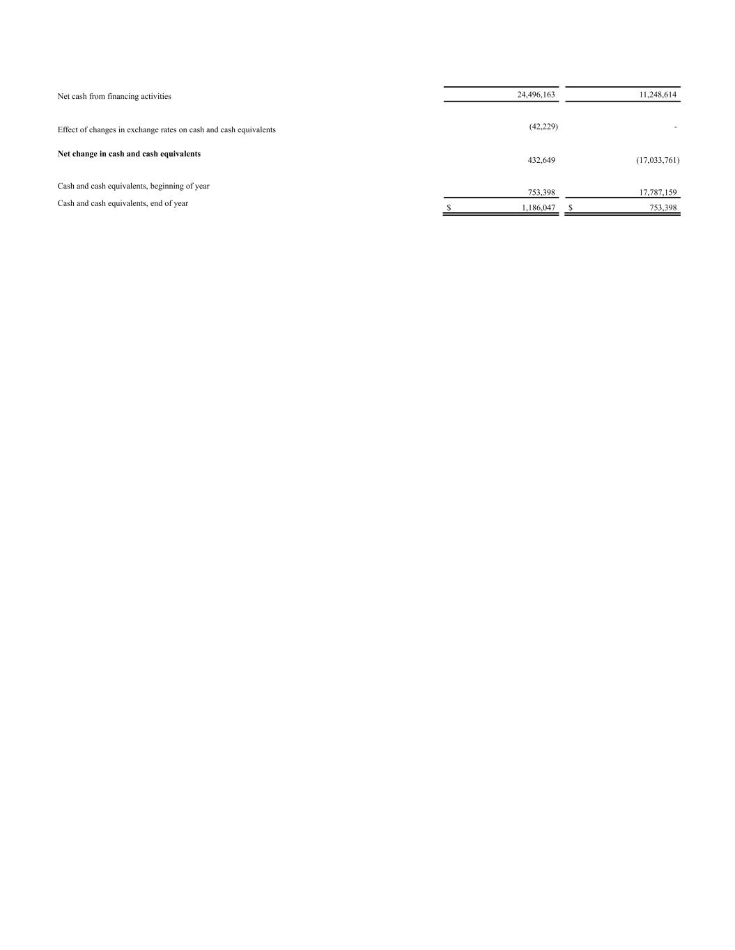 Net cash from financing activities 24,496,163 11,248,614 Effect of changes in exchange rates on cash and cash equivalents (42,229) - Net change in cash and cash equivalents 432,649 (17,033,761) Cash and cash equivalents, beginning of year 753,398 17,787,159 Cash and cash equivalents, end of year $ 1,186,047 $ 753,398