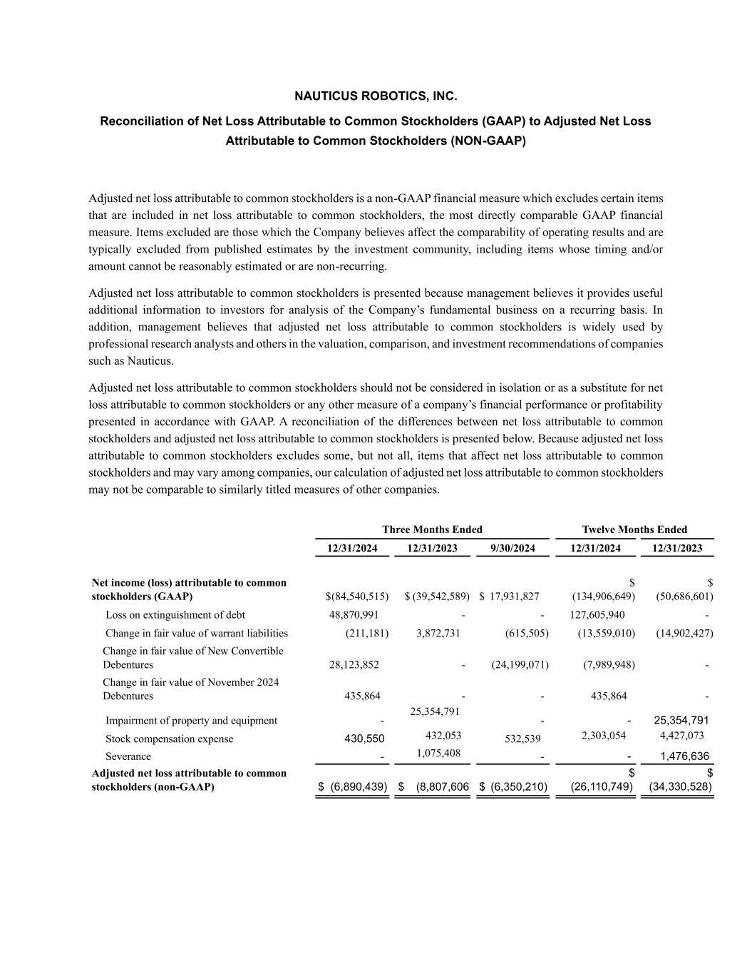 NAUTICUS ROBOTICS, INC. Reconciliation of Net Loss Attributable to Common Stockholders (GAAP) to Adjusted Net Loss Attributable to Common Stockholders (NON-GAAP) Adjusted net loss attributable to common stockholders is a non-GAAP financial measure which excludes certain items that are included in net loss attributable to common stockholders, the most directly comparable GAAP financial measure. Items excluded are those which the Company believes affect the comparability of operating results and are typically excluded from published estimates by the investment community, including items whose timing and/or amount cannot be reasonably estimated or are non-recurring. Adjusted net loss attributable to common stockholders is presented because management believes it provides useful additional information to investors for analysis of the Company’s fundamental business on a recurring basis. In addition, management believes that adjusted net loss attributable to common stockholders is widely used by professional research analysts and others in the valuation, comparison, and investment recommendations of companies such as Nauticus. Adjusted net loss attributable to common stockholders should not be considered in isolation or as a substitute for net loss attributable to common stockholders or any other measure of a company’s financial performance or profitability presented in accordance with GAAP. A reconciliation of the differences between net loss attributable to common stockholders and adjusted net loss attributable to common stockholders is presented below. Because adjusted net loss attributable to common stockholders excludes some, but not all, items that affect net loss attributable to common stockholders and may vary among companies, our calculation of adjusted net loss attributable to common stockholders may not be comparable to similarly titled measures of other companies. Three Months Ended Twelve Months Ended 12/31/2024 12/31/2023 9/30/2024 12/31/2024 12/31/2023 Net income (loss) attributable to common stockholders (GAAP) $ (84,540,515) $ (39,542,589) $ 17,931,827 $ (134,906,649) $ (50,686,601) Loss on extinguishment of debt 48,870,991 - - 127,605,940 - Change in fair value of warrant liabilities (211,181) 3,872,731 (615,505) (13,559,010) (14,902,427) Change in fair value of New Convertible Debentures 28,123,852 - (24,199,071) (7,989,948) - Change in fair value of November 2024 Debentures 435,864 - - 435,864 - Impairment of property and equipment - 25,354,791 - - 25,354,791 Stock compensation expense 430,550 432,053 532,539 2,303,054 4,427,073 Severance - 1,075,408 - - 1,476,636 Adjusted net loss attributable to common stockholders (non-GAAP) $ (6,890,439) $ (8,807,606) $ (6,350,210) $ (26,110,749) $ (34,330,528)
