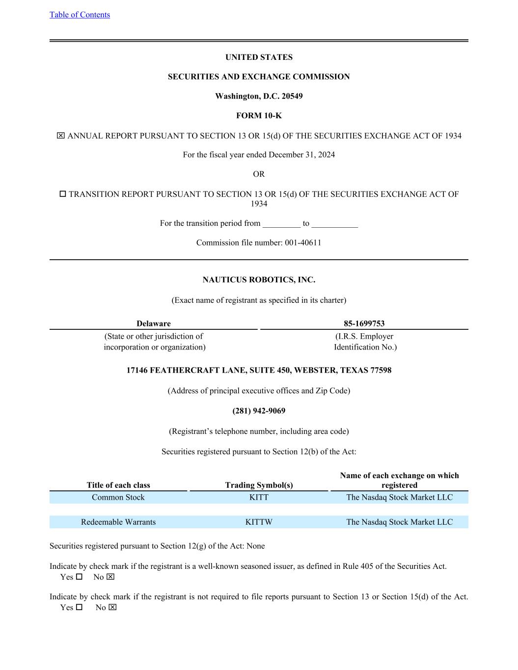 UNITED STATES SECURITIES AND EXCHANGE COMMISSION Washington, D.C. 20549 FORM 10-K x ANNUAL REPORT PURSUANT TO SECTION 13 OR 15(d) OF THE SECURITIES EXCHANGE ACT OF 1934 For the fiscal year ended December 31, 2024 OR o TRANSITION REPORT PURSUANT TO SECTION 13 OR 15(d) OF THE SECURITIES EXCHANGE ACT OF 1934 For the transition period from _________ to ___________ Commission file number: 001-40611 NAUTICUS ROBOTICS, INC. (Exact name of registrant as specified in its charter) Delaware 85-1699753 (State or other jurisdiction of incorporation or organization) (I.R.S. Employer Identification No.) 17146 FEATHERCRAFT LANE, SUITE 450, WEBSTER, TEXAS 77598 (Address of principal executive offices and Zip Code) (281) 942-9069 (Registrant’s telephone number, including area code) Securities registered pursuant to Section 12(b) of the Act: Title of each class Trading Symbol(s) Name of each exchange on which registered Common Stock KITT The Nasdaq Stock Market LLC Redeemable Warrants KITTW The Nasdaq Stock Market LLC Securities registered pursuant to Section 12(g) of the Act: None Indicate by check mark if the registrant is a well-known seasoned issuer, as defined in Rule 405 of the Securities Act. Yes o No x Indicate by check mark if the registrant is not required to file reports pursuant to Section 13 or Section 15(d) of the Act. Yes o No x Table of Contents