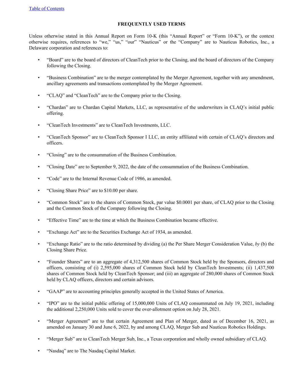 FREQUENTLY USED TERMS Unless otherwise stated in this Annual Report on Form 10-K (this “Annual Report” or “Form 10-K”), or the context otherwise requires, references to “we,” “us,” “our” “Nauticus” or the “Company” are to Nauticus Robotics, Inc., a Delaware corporation and references to: • “Board” are to the board of directors of CleanTech prior to the Closing, and the board of directors of the Company following the Closing. • “Business Combination” are to the merger contemplated by the Merger Agreement, together with any amendment, ancillary agreements and transactions contemplated by the Merger Agreement. • “CLAQ” and “CleanTech” are to the Company prior to the Closing. • “Chardan” are to Chardan Capital Markets, LLC, as representative of the underwriters in CLAQ’s initial public offering. • “CleanTech Investments” are to CleanTech Investments, LLC. • “CleanTech Sponsor” are to CleanTech Sponsor I LLC, an entity affiliated with certain of CLAQ’s directors and officers. • “Closing” are to the consummation of the Business Combination. • “Closing Date” are to September 9, 2022, the date of the consummation of the Business Combination. • “Code” are to the Internal Revenue Code of 1986, as amended. • “Closing Share Price” are to $10.00 per share. • “Common Stock” are to the shares of Common Stock, par value $0.0001 per share, of CLAQ prior to the Closing and the Common Stock of the Company following the Closing. • “Effective Time” are to the time at which the Business Combination became effective. • “Exchange Act” are to the Securities Exchange Act of 1934, as amended. • “Exchange Ratio” are to the ratio determined by dividing (a) the Per Share Merger Consideration Value, by (b) the Closing Share Price. • “Founder Shares” are to an aggregate of 4,312,500 shares of Common Stock held by the Sponsors, directors and officers, consisting of (i) 2,595,000 shares of Common Stock held by CleanTech Investments; (ii) 1,437,500 shares of Common Stock held by CleanTech Sponsor; and (iii) an aggregate of 280,000 shares of Common Stock held by CLAQ officers, directors and certain advisors. • “GAAP” are to accounting principles generally accepted in the United States of America. • “IPO” are to the initial public offering of 15,000,000 Units of CLAQ consummated on July 19, 2021, including the additional 2,250,000 Units sold to cover the over-allotment option on July 28, 2021. • “Merger Agreement” are to that certain Agreement and Plan of Merger, dated as of December 16, 2021, as amended on January 30 and June 6, 2022, by and among CLAQ, Merger Sub and Nauticus Robotics Holdings. • “Merger Sub” are to CleanTech Merger Sub, Inc., a Texas corporation and wholly owned subsidiary of CLAQ. • “Nasdaq” are to The Nasdaq Capital Market. Table of Contents
