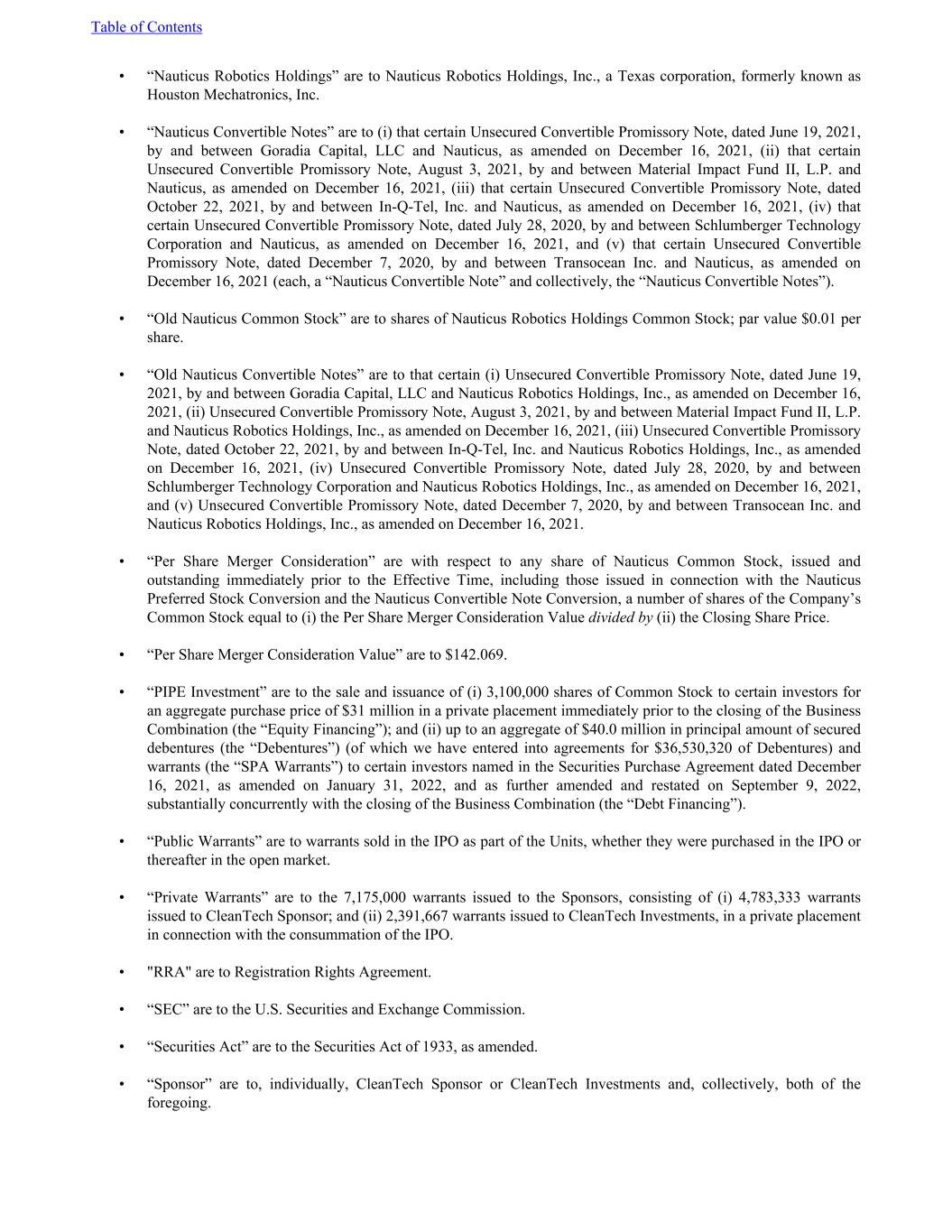 • “Nauticus Robotics Holdings” are to Nauticus Robotics Holdings, Inc., a Texas corporation, formerly known as Houston Mechatronics, Inc. • “Nauticus Convertible Notes” are to (i) that certain Unsecured Convertible Promissory Note, dated June 19, 2021, by and between Goradia Capital, LLC and Nauticus, as amended on December 16, 2021, (ii) that certain Unsecured Convertible Promissory Note, August 3, 2021, by and between Material Impact Fund II, L.P. and Nauticus, as amended on December 16, 2021, (iii) that certain Unsecured Convertible Promissory Note, dated October 22, 2021, by and between In-Q-Tel, Inc. and Nauticus, as amended on December 16, 2021, (iv) that certain Unsecured Convertible Promissory Note, dated July 28, 2020, by and between Schlumberger Technology Corporation and Nauticus, as amended on December 16, 2021, and (v) that certain Unsecured Convertible Promissory Note, dated December 7, 2020, by and between Transocean Inc. and Nauticus, as amended on December 16, 2021 (each, a “Nauticus Convertible Note” and collectively, the “Nauticus Convertible Notes”). • “Old Nauticus Common Stock” are to shares of Nauticus Robotics Holdings Common Stock; par value $0.01 per share. • “Old Nauticus Convertible Notes” are to that certain (i) Unsecured Convertible Promissory Note, dated June 19, 2021, by and between Goradia Capital, LLC and Nauticus Robotics Holdings, Inc., as amended on December 16, 2021, (ii) Unsecured Convertible Promissory Note, August 3, 2021, by and between Material Impact Fund II, L.P. and Nauticus Robotics Holdings, Inc., as amended on December 16, 2021, (iii) Unsecured Convertible Promissory Note, dated October 22, 2021, by and between In-Q-Tel, Inc. and Nauticus Robotics Holdings, Inc., as amended on December 16, 2021, (iv) Unsecured Convertible Promissory Note, dated July 28, 2020, by and between Schlumberger Technology Corporation and Nauticus Robotics Holdings, Inc., as amended on December 16, 2021, and (v) Unsecured Convertible Promissory Note, dated December 7, 2020, by and between Transocean Inc. and Nauticus Robotics Holdings, Inc., as amended on December 16, 2021. • “Per Share Merger Consideration” are with respect to any share of Nauticus Common Stock, issued and outstanding immediately prior to the Effective Time, including those issued in connection with the Nauticus Preferred Stock Conversion and the Nauticus Convertible Note Conversion, a number of shares of the Company’s Common Stock equal to (i) the Per Share Merger Consideration Value divided by (ii) the Closing Share Price. • “Per Share Merger Consideration Value” are to $142.069. • “PIPE Investment” are to the sale and issuance of (i) 3,100,000 shares of Common Stock to certain investors for an aggregate purchase price of $31 million in a private placement immediately prior to the closing of the Business Combination (the “Equity Financing”); and (ii) up to an aggregate of $40.0 million in principal amount of secured debentures (the “Debentures”) (of which we have entered into agreements for $36,530,320 of Debentures) and warrants (the “SPA Warrants”) to certain investors named in the Securities Purchase Agreement dated December 16, 2021, as amended on January 31, 2022, and as further amended and restated on September 9, 2022, substantially concurrently with the closing of the Business Combination (the “Debt Financing”). • “Public Warrants” are to warrants sold in the IPO as part of the Units, whether they were purchased in the IPO or thereafter in the open market. • “Private Warrants” are to the 7,175,000 warrants issued to the Sponsors, consisting of (i) 4,783,333 warrants issued to CleanTech Sponsor; and (ii) 2,391,667 warrants issued to CleanTech Investments, in a private placement in connection with the consummation of the IPO. • "RRA" are to Registration Rights Agreement. • “SEC” are to the U.S. Securities and Exchange Commission. • “Securities Act” are to the Securities Act of 1933, as amended. • “Sponsor” are to, individually, CleanTech Sponsor or CleanTech Investments and, collectively, both of the foregoing. Table of Contents
