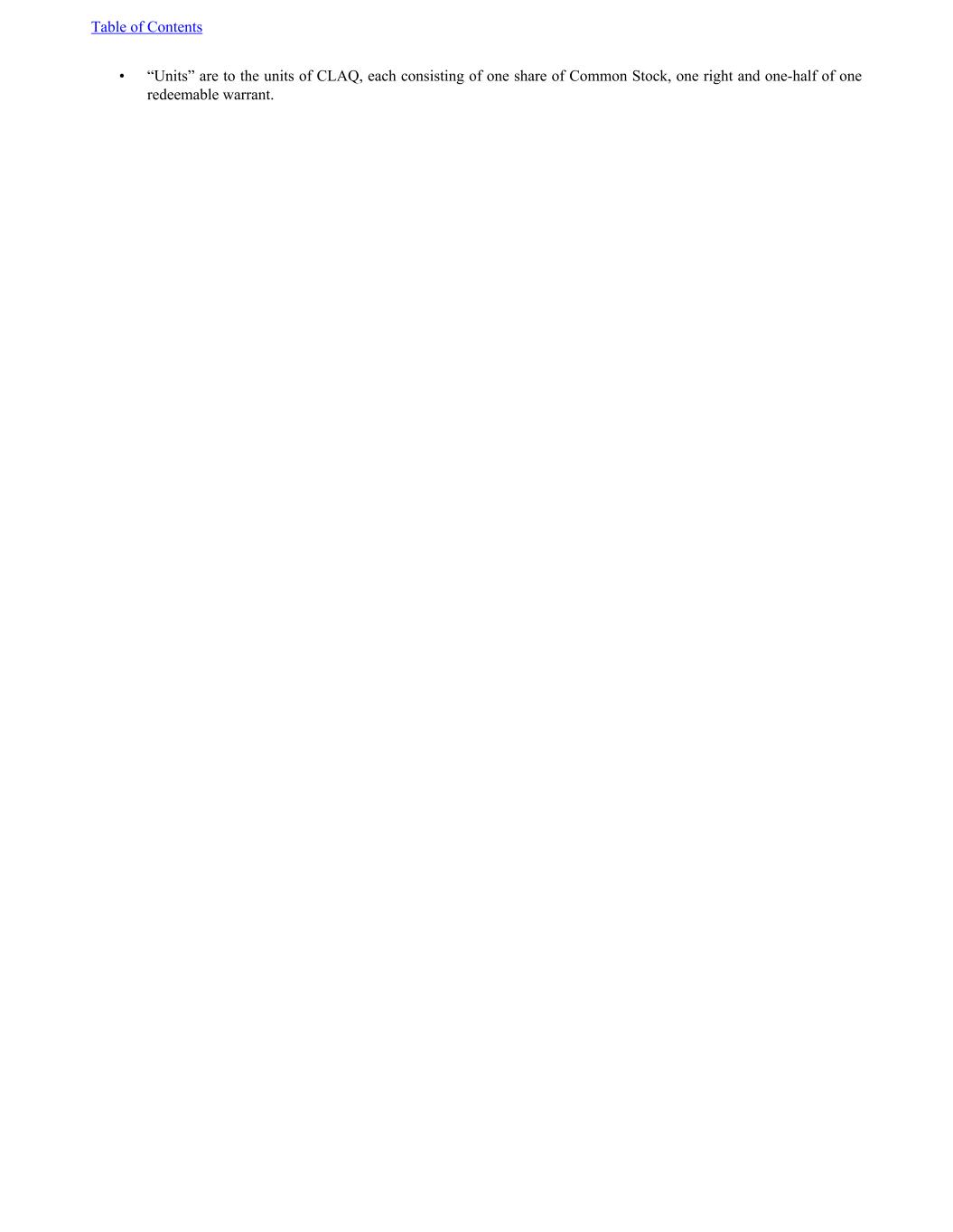 • “Units” are to the units of CLAQ, each consisting of one share of Common Stock, one right and one-half of one redeemable warrant. Table of Contents