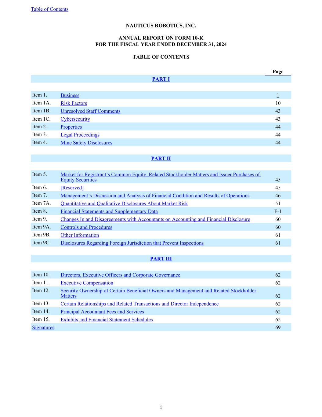 NAUTICUS ROBOTICS, INC. ANNUAL REPORT ON FORM 10-K FOR THE FISCAL YEAR ENDED DECEMBER 31, 2024 TABLE OF CONTENTS Page PART I Item 1. Business 1 Item 1A. Risk Factors 10 Item 1B. Unresolved Staff Comments 43 Item 1C. Cybersecurity 43 Item 2. Properties 44 Item 3. Legal Proceedings 44 Item 4. Mine Safety Disclosures 44 PART II Item 5. Market for Registrant’s Common Equity, Related Stockholder Matters and Issuer Purchases of Equity Securities 45 Item 6. [Reserved] 45 Item 7. Management’s Discussion and Analysis of Financial Condition and Results of Operations 46 Item 7A. Quantitative and Qualitative Disclosures About Market Risk 51 Item 8. Financial Statements and Supplementary Data F-1 Item 9. Changes In and Disagreements with Accountants on Accounting and Financial Disclosure 60 Item 9A. Controls and Procedures 60 Item 9B. Other Information 61 Item 9C. Disclosures Regarding Foreign Jurisdiction that Prevent Inspections 61 PART III Item 10. Directors, Executive Officers and Corporate Governance 62 Item 11. Executive Compensation 62 Item 12. Security Ownership of Certain Beneficial Owners and Management and Related Stockholder Matters 62 Item 13. Certain Relationships and Related Transactions and Director Independence 62 Item 14. Principal Accountant Fees and Services 62 Item 15. Exhibits and Financial Statement Schedules 62 Signatures 69 Table of Contents i