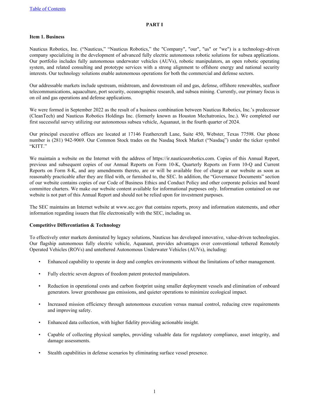 PART I Item 1. Business Nauticus Robotics, Inc. (“Nauticus,” “Nauticus Robotics,” the "Company", "our", "us" or "we") is a technology-driven company specializing in the development of advanced fully electric autonomous robotic solutions for subsea applications. Our portfolio includes fully autonomous underwater vehicles (AUVs), robotic manipulators, an open robotic operating system, and related consulting and prototype services with a strong alignment to offshore energy and national security interests. Our technology solutions enable autonomous operations for both the commercial and defense sectors. Our addressable markets include upstream, midstream, and downstream oil and gas, defense, offshore renewables, seafloor telecommunications, aquaculture, port security, oceanographic research, and subsea mining. Currently, our primary focus is on oil and gas operations and defense applications. We were formed in September 2022 as the result of a business combination between Nauticus Robotics, Inc.’s predecessor (CleanTech) and Nauticus Robotics Holdings Inc. (formerly known as Houston Mechatronics, Inc.). We completed our first successful survey utilizing our autonomous subsea vehicle, Aquanaut, in the fourth quarter of 2024. Our principal executive offices are located at 17146 Feathercraft Lane, Suite 450, Webster, Texas 77598. Our phone number is (281) 942-9069. Our Common Stock trades on the Nasdaq Stock Market (“Nasdaq”) under the ticker symbol “KITT.” We maintain a website on the Internet with the address of https://ir.nauticusrobotics.com. Copies of this Annual Report, previous and subsequent copies of our Annual Reports on Form 10-K, Quarterly Reports on Form 10-Q and Current Reports on Form 8-K, and any amendments thereto, are or will be available free of charge at our website as soon as reasonably practicable after they are filed with, or furnished to, the SEC. In addition, the “Governance Documents” section of our website contains copies of our Code of Business Ethics and Conduct Policy and other corporate policies and board committee charters. We make our website content available for informational purposes only. Information contained on our website is not part of this Annual Report and should not be relied upon for investment purposes. The SEC maintains an Internet website at www.sec.gov that contains reports, proxy and information statements, and other information regarding issuers that file electronically with the SEC, including us. Competitive Differentiation & Technology To effectively enter markets dominated by legacy solutions, Nauticus has developed innovative, value-driven technologies. Our flagship autonomous fully electric vehicle, Aquanaut, provides advantages over conventional tethered Remotely Operated Vehicles (ROVs) and untethered Autonomous Underwater Vehicles (AUVs), including: • Enhanced capability to operate in deep and complex environments without the limitations of tether management. • Fully electric seven degrees of freedom patent protected manipulators. • Reduction in operational costs and carbon footprint using smaller deployment vessels and elimination of onboard generators. lower greenhouse gas emissions, and quieter operations to minimize ecological impact. • Increased mission efficiency through autonomous execution versus manual control, reducing crew requirements and improving safety. • Enhanced data collection, with higher fidelity providing actionable insight. • Capable of collecting physical samples, providing valuable data for regulatory compliance, asset integrity, and damage assessments. • Stealth capabilities in defense scenarios by eliminating surface vessel presence. Table of Contents 1