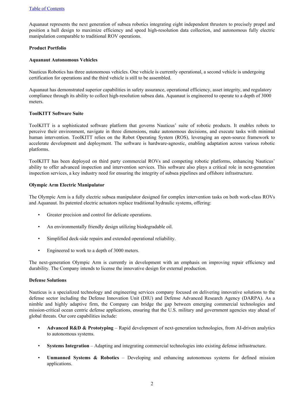 Aquanaut represents the next generation of subsea robotics integrating eight independent thrusters to precisely propel and position a hull design to maximize efficiency and speed high-resolution data collection, and autonomous fully electric manipulation comparable to traditional ROV operations. Product Portfolio Aquanaut Autonomous Vehicles Nauticus Robotics has three autonomous vehicles. One vehicle is currently operational, a second vehicle is undergoing certification for operations and the third vehicle is still to be assembled. Aquanaut has demonstrated superior capabilities in safety assurance, operational efficiency, asset integrity, and regulatory compliance through its ability to collect high-resolution subsea data. Aquanaut is engineered to operate to a depth of 3000 meters. ToolKITT Software Suite ToolKITT is a sophisticated software platform that governs Nauticus’ suite of robotic products. It enables robots to perceive their environment, navigate in three dimensions, make autonomous decisions, and execute tasks with minimal human intervention. ToolKITT relies on the Robot Operating System (ROS), leveraging an open-source framework to accelerate development and deployment. The software is hardware-agnostic, enabling adaptation across various robotic platforms. ToolKITT has been deployed on third party commercial ROVs and competing robotic platforms, enhancing Nauticus’ ability to offer advanced inspection and intervention services. This software also plays a critical role in next-generation inspection services, a key industry need for ensuring the integrity of subsea pipelines and offshore infrastructure. Olympic Arm Electric Manipulator The Olympic Arm is a fully electric subsea manipulator designed for complex intervention tasks on both work-class ROVs and Aquanaut. Its patented electric actuators replace traditional hydraulic systems, offering: • Greater precision and control for delicate operations. • An environmentally friendly design utilizing biodegradable oil. • Simplified deck-side repairs and extended operational reliability. • Engineered to work to a depth of 3000 meters. The next-generation Olympic Arm is currently in development with an emphasis on improving repair efficiency and durability. The Company intends to license the innovative design for external production. Defense Solutions Nauticus is a specialized technology and engineering services company focused on delivering innovative solutions to the defense sector including the Defense Innovation Unit (DIU) and Defense Advanced Research Agency (DARPA). As a nimble and highly adaptive firm, the Company can bridge the gap between emerging commercial technologies and mission-critical ocean centric defense applications, ensuring that the U.S. military and government agencies stay ahead of global threats. Our core capabilities include: • Advanced R&D & Prototyping – Rapid development of next-generation technologies, from AI-driven analytics to autonomous systems. • Systems Integration – Adapting and integrating commercial technologies into existing defense infrastructure. • Unmanned Systems & Robotics – Developing and enhancing autonomous systems for defined mission applications. Table of Contents 2