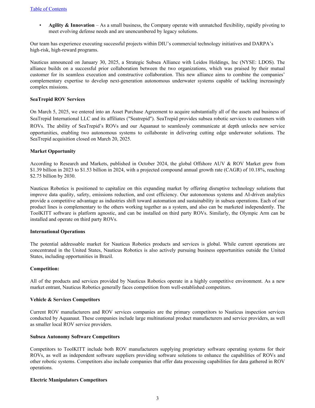 • Agility & Innovation – As a small business, the Company operate with unmatched flexibility, rapidly pivoting to meet evolving defense needs and are unencumbered by legacy solutions. Our team has experience executing successful projects within DIU’s commercial technology initiatives and DARPA’s high-risk, high-reward programs. Nauticus announced on January 30, 2025, a Strategic Subsea Alliance with Leidos Holdings, Inc (NYSE: LDOS). The alliance builds on a successful prior collaboration between the two organizations, which was praised by their mutual customer for its seamless execution and constructive collaboration. This new alliance aims to combine the companies’ complementary expertise to develop next-generation autonomous underwater systems capable of tackling increasingly complex missions. SeaTrepid ROV Services On March 5, 2025, we entered into an Asset Purchase Agreement to acquire substantially all of the assets and business of SeaTrepid International LLC and its affiliates ("Seatrepid"). SeaTrepid provides subsea robotic services to customers with ROVs. The ability of SeaTrepid’s ROVs and our Aquanaut to seamlessly communicate at depth unlocks new service opportunities, enabling two autonomous systems to collaborate in delivering cutting edge underwater solutions. The SeaTrepid acquisition closed on March 20, 2025. Market Opportunity According to Research and Markets, published in October 2024, the global Offshore AUV & ROV Market grew from $1.39 billion in 2023 to $1.53 billion in 2024, with a projected compound annual growth rate (CAGR) of 10.18%, reaching $2.75 billion by 2030. Nauticus Robotics is positioned to capitalize on this expanding market by offering disruptive technology solutions that improve data quality, safety, emissions reduction, and cost efficiency. Our autonomous systems and AI-driven analytics provide a competitive advantage as industries shift toward automation and sustainability in subsea operations. Each of our product lines is complementary to the others working together as a system, and also can be marketed independently. The ToolKITT software is platform agnostic, and can be installed on third party ROVs. Similarly, the Olympic Arm can be installed and operate on third party ROVs. International Operations The potential addressable market for Nauticus Robotics products and services is global. While current operations are concentrated in the United States, Nauticus Robotics is also actively pursuing business opportunities outside the United States, including opportunities in Brazil. Competition: All of the products and services provided by Nauticus Robotics operate in a highly competitive environment. As a new market entrant, Nauticus Robotics generally faces competition from well-established competitors. Vehicle & Services Competitors Current ROV manufacturers and ROV services companies are the primary competitors to Nauticus inspection services conducted by Aquanaut. These companies include large multinational product manufacturers and service providers, as well as smaller local ROV service providers. Subsea Autonomy Software Competitors Competitors to ToolKITT include both ROV manufacturers supplying proprietary software operating systems for their ROVs, as well as independent software suppliers providing software solutions to enhance the capabilities of ROVs and other robotic systems. Competitors also include companies that offer data processing capabilities for data gathered in ROV operations. Electric Manipulators Competitors Table of Contents 3