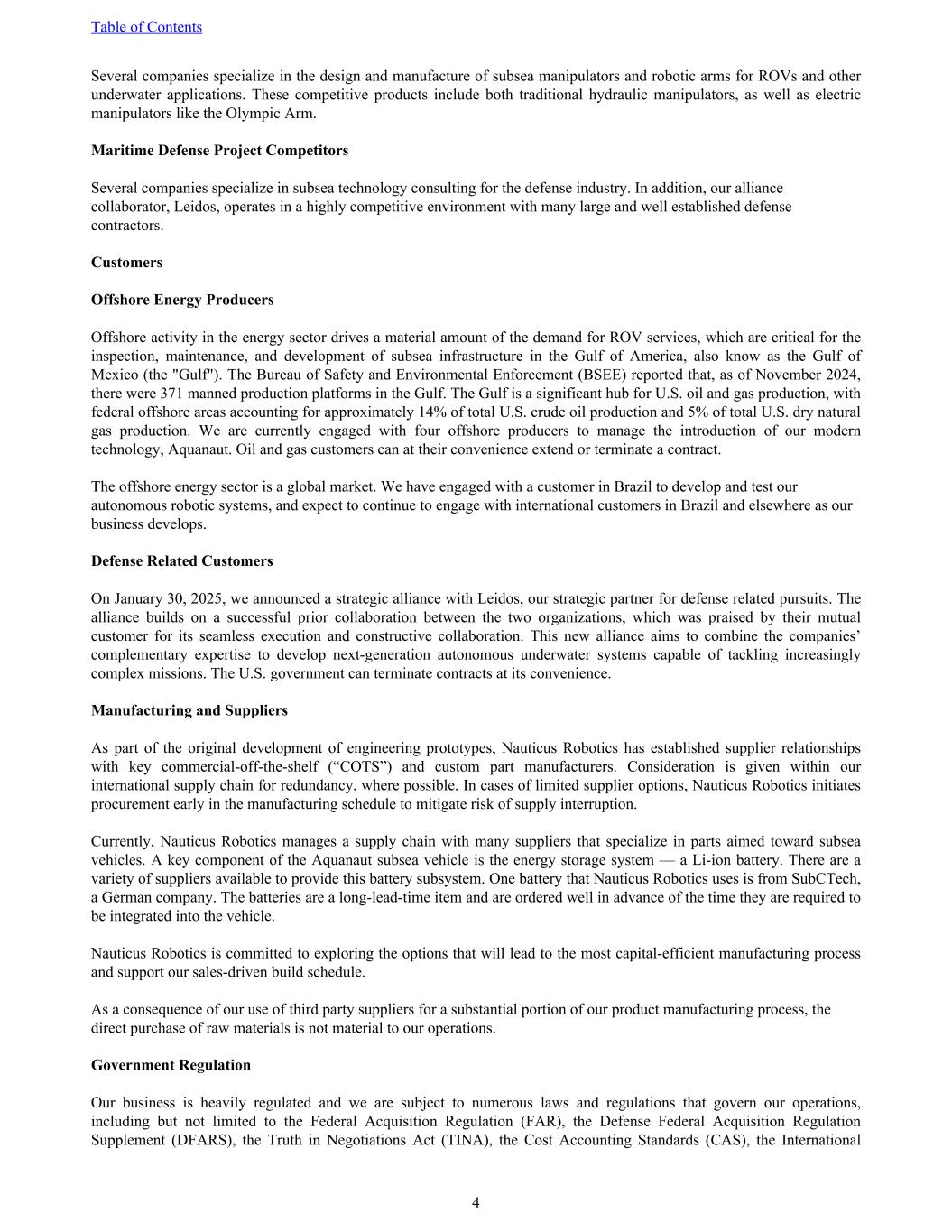 Several companies specialize in the design and manufacture of subsea manipulators and robotic arms for ROVs and other underwater applications. These competitive products include both traditional hydraulic manipulators, as well as electric manipulators like the Olympic Arm. Maritime Defense Project Competitors Several companies specialize in subsea technology consulting for the defense industry. In addition, our alliance collaborator, Leidos, operates in a highly competitive environment with many large and well established defense contractors. Customers Offshore Energy Producers Offshore activity in the energy sector drives a material amount of the demand for ROV services, which are critical for the inspection, maintenance, and development of subsea infrastructure in the Gulf of America, also know as the Gulf of Mexico (the "Gulf"). The Bureau of Safety and Environmental Enforcement (BSEE) reported that, as of November 2024, there were 371 manned production platforms in the Gulf. The Gulf is a significant hub for U.S. oil and gas production, with federal offshore areas accounting for approximately 14% of total U.S. crude oil production and 5% of total U.S. dry natural gas production. We are currently engaged with four offshore producers to manage the introduction of our modern technology, Aquanaut. Oil and gas customers can at their convenience extend or terminate a contract. The offshore energy sector is a global market. We have engaged with a customer in Brazil to develop and test our autonomous robotic systems, and expect to continue to engage with international customers in Brazil and elsewhere as our business develops. Defense Related Customers On January 30, 2025, we announced a strategic alliance with Leidos, our strategic partner for defense related pursuits. The alliance builds on a successful prior collaboration between the two organizations, which was praised by their mutual customer for its seamless execution and constructive collaboration. This new alliance aims to combine the companies’ complementary expertise to develop next-generation autonomous underwater systems capable of tackling increasingly complex missions. The U.S. government can terminate contracts at its convenience. Manufacturing and Suppliers As part of the original development of engineering prototypes, Nauticus Robotics has established supplier relationships with key commercial-off-the-shelf (“COTS”) and custom part manufacturers. Consideration is given within our international supply chain for redundancy, where possible. In cases of limited supplier options, Nauticus Robotics initiates procurement early in the manufacturing schedule to mitigate risk of supply interruption. Currently, Nauticus Robotics manages a supply chain with many suppliers that specialize in parts aimed toward subsea vehicles. A key component of the Aquanaut subsea vehicle is the energy storage system — a Li-ion battery. There are a variety of suppliers available to provide this battery subsystem. One battery that Nauticus Robotics uses is from SubCTech, a German company. The batteries are a long-lead-time item and are ordered well in advance of the time they are required to be integrated into the vehicle. Nauticus Robotics is committed to exploring the options that will lead to the most capital-efficient manufacturing process and support our sales-driven build schedule. As a consequence of our use of third party suppliers for a substantial portion of our product manufacturing process, the direct purchase of raw materials is not material to our operations. Government Regulation Our business is heavily regulated and we are subject to numerous laws and regulations that govern our operations, including but not limited to the Federal Acquisition Regulation (FAR), the Defense Federal Acquisition Regulation Supplement (DFARS), the Truth in Negotiations Act (TINA), the Cost Accounting Standards (CAS), the International Table of Contents 4