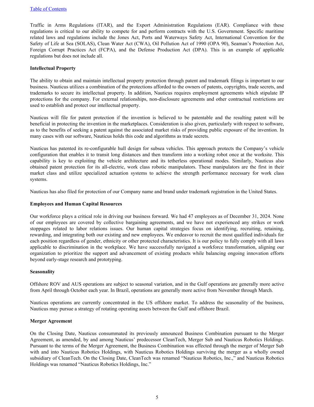 Traffic in Arms Regulations (ITAR), and the Export Administration Regulations (EAR). Compliance with these regulations is critical to our ability to compete for and perform contracts with the U.S. Government. Specific maritime related laws and regulations include the Jones Act, Ports and Waterways Safety Act, International Convention for the Safety of Life at Sea (SOLAS), Clean Water Act (CWA), Oil Pollution Act of 1990 (OPA 90), Seaman’s Protection Act, Foreign Corrupt Practices Act (FCPA), and the Defense Production Act (DPA). This is an example of applicable regulations but does not include all. Intellectual Property The ability to obtain and maintain intellectual property protection through patent and trademark filings is important to our business. Nauticus utilizes a combination of the protections afforded to the owners of patents, copyrights, trade secrets, and trademarks to secure its intellectual property. In addition, Nauticus requires employment agreements which stipulate IP protections for the company. For external relationships, non-disclosure agreements and other contractual restrictions are used to establish and protect our intellectual property. Nauticus will file for patent protection if the invention is believed to be patentable and the resulting patent will be beneficial in protecting the invention in the marketplaces. Consideration is also given, particularly with respect to software, as to the benefits of seeking a patent against the associated market risks of providing public exposure of the invention. In many cases with our software, Nauticus holds this code and algorithms as trade secrets. Nauticus has patented its re-configurable hull design for subsea vehicles. This approach protects the Company’s vehicle configuration that enables it to transit long distances and then transform into a working robot once at the worksite. This capability is key to exploiting the vehicle architecture and its tetherless operational modes. Similarly, Nauticus also obtained patent protection for its all-electric, work class robotic manipulators. These manipulators are the first in their market class and utilize specialized actuation systems to achieve the strength performance necessary for work class systems. Nauticus has also filed for protection of our Company name and brand under trademark registration in the United States. Employees and Human Capital Resources Our workforce plays a critical role in driving our business forward. We had 47 employees as of December 31, 2024. None of our employees are covered by collective bargaining agreements, and we have not experienced any strikes or work stoppages related to labor relations issues. Our human capital strategies focus on identifying, recruiting, retaining, rewarding, and integrating both our existing and new employees. We endeavor to recruit the most qualified individuals for each position regardless of gender, ethnicity or other protected characteristics. It is our policy to fully comply with all laws applicable to discrimination in the workplace. We have successfully navigated a workforce transformation, aligning our organization to prioritize the support and advancement of existing products while balancing ongoing innovation efforts beyond early-stage research and prototyping. Seasonality Offshore ROV and AUS operations are subject to seasonal variation, and in the Gulf operations are generally more active from April through October each year. In Brazil, operations are generally more active from November through March. Nauticus operations are currently concentrated in the US offshore market. To address the seasonality of the business, Nauticus may pursue a strategy of rotating operating assets between the Gulf and offshore Brazil. Merger Agreement On the Closing Date, Nauticus consummated its previously announced Business Combination pursuant to the Merger Agreement, as amended, by and among Nauticus’ predecessor CleanTech, Merger Sub and Nauticus Robotics Holdings. Pursuant to the terms of the Merger Agreement, the Business Combination was effected through the merger of Merger Sub with and into Nauticus Robotics Holdings, with Nauticus Robotics Holdings surviving the merger as a wholly owned subsidiary of CleanTech. On the Closing Date, CleanTech was renamed “Nauticus Robotics, Inc.,” and Nauticus Robotics Holdings was renamed “Nauticus Robotics Holdings, Inc.” Table of Contents 5