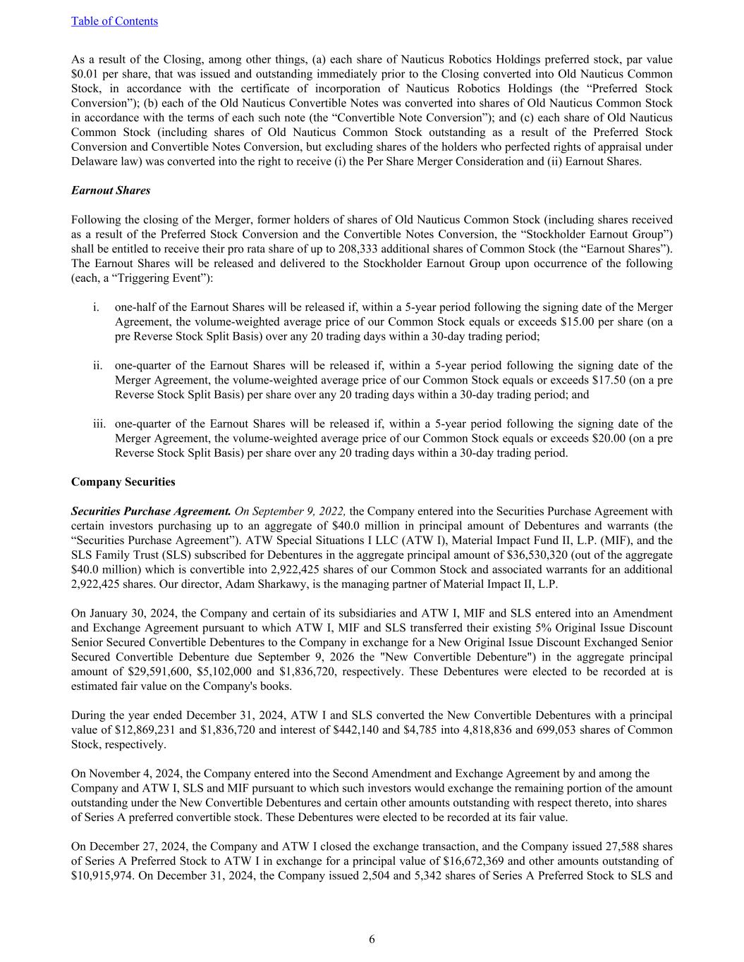 As a result of the Closing, among other things, (a) each share of Nauticus Robotics Holdings preferred stock, par value $0.01 per share, that was issued and outstanding immediately prior to the Closing converted into Old Nauticus Common Stock, in accordance with the certificate of incorporation of Nauticus Robotics Holdings (the “Preferred Stock Conversion”); (b) each of the Old Nauticus Convertible Notes was converted into shares of Old Nauticus Common Stock in accordance with the terms of each such note (the “Convertible Note Conversion”); and (c) each share of Old Nauticus Common Stock (including shares of Old Nauticus Common Stock outstanding as a result of the Preferred Stock Conversion and Convertible Notes Conversion, but excluding shares of the holders who perfected rights of appraisal under Delaware law) was converted into the right to receive (i) the Per Share Merger Consideration and (ii) Earnout Shares. Earnout Shares Following the closing of the Merger, former holders of shares of Old Nauticus Common Stock (including shares received as a result of the Preferred Stock Conversion and the Convertible Notes Conversion, the “Stockholder Earnout Group”) shall be entitled to receive their pro rata share of up to 208,333 additional shares of Common Stock (the “Earnout Shares”). The Earnout Shares will be released and delivered to the Stockholder Earnout Group upon occurrence of the following (each, a “Triggering Event”): i. one-half of the Earnout Shares will be released if, within a 5-year period following the signing date of the Merger Agreement, the volume-weighted average price of our Common Stock equals or exceeds $15.00 per share (on a pre Reverse Stock Split Basis) over any 20 trading days within a 30-day trading period; ii. one-quarter of the Earnout Shares will be released if, within a 5-year period following the signing date of the Merger Agreement, the volume-weighted average price of our Common Stock equals or exceeds $17.50 (on a pre Reverse Stock Split Basis) per share over any 20 trading days within a 30-day trading period; and iii. one-quarter of the Earnout Shares will be released if, within a 5-year period following the signing date of the Merger Agreement, the volume-weighted average price of our Common Stock equals or exceeds $20.00 (on a pre Reverse Stock Split Basis) per share over any 20 trading days within a 30-day trading period. Company Securities Securities Purchase Agreement. On September 9, 2022, the Company entered into the Securities Purchase Agreement with certain investors purchasing up to an aggregate of $40.0 million in principal amount of Debentures and warrants (the “Securities Purchase Agreement”). ATW Special Situations I LLC (ATW I), Material Impact Fund II, L.P. (MIF), and the SLS Family Trust (SLS) subscribed for Debentures in the aggregate principal amount of $36,530,320 (out of the aggregate $40.0 million) which is convertible into 2,922,425 shares of our Common Stock and associated warrants for an additional 2,922,425 shares. Our director, Adam Sharkawy, is the managing partner of Material Impact II, L.P. On January 30, 2024, the Company and certain of its subsidiaries and ATW I, MIF and SLS entered into an Amendment and Exchange Agreement pursuant to which ATW I, MIF and SLS transferred their existing 5% Original Issue Discount Senior Secured Convertible Debentures to the Company in exchange for a New Original Issue Discount Exchanged Senior Secured Convertible Debenture due September 9, 2026 the "New Convertible Debenture") in the aggregate principal amount of $29,591,600, $5,102,000 and $1,836,720, respectively. These Debentures were elected to be recorded at is estimated fair value on the Company's books. During the year ended December 31, 2024, ATW I and SLS converted the New Convertible Debentures with a principal value of $12,869,231 and $1,836,720 and interest of $442,140 and $4,785 into 4,818,836 and 699,053 shares of Common Stock, respectively. On November 4, 2024, the Company entered into the Second Amendment and Exchange Agreement by and among the Company and ATW I, SLS and MIF pursuant to which such investors would exchange the remaining portion of the amount outstanding under the New Convertible Debentures and certain other amounts outstanding with respect thereto, into shares of Series A preferred convertible stock. These Debentures were elected to be recorded at its fair value. On December 27, 2024, the Company and ATW I closed the exchange transaction, and the Company issued 27,588 shares of Series A Preferred Stock to ATW I in exchange for a principal value of $16,672,369 and other amounts outstanding of $10,915,974. On December 31, 2024, the Company issued 2,504 and 5,342 shares of Series A Preferred Stock to SLS and Table of Contents 6