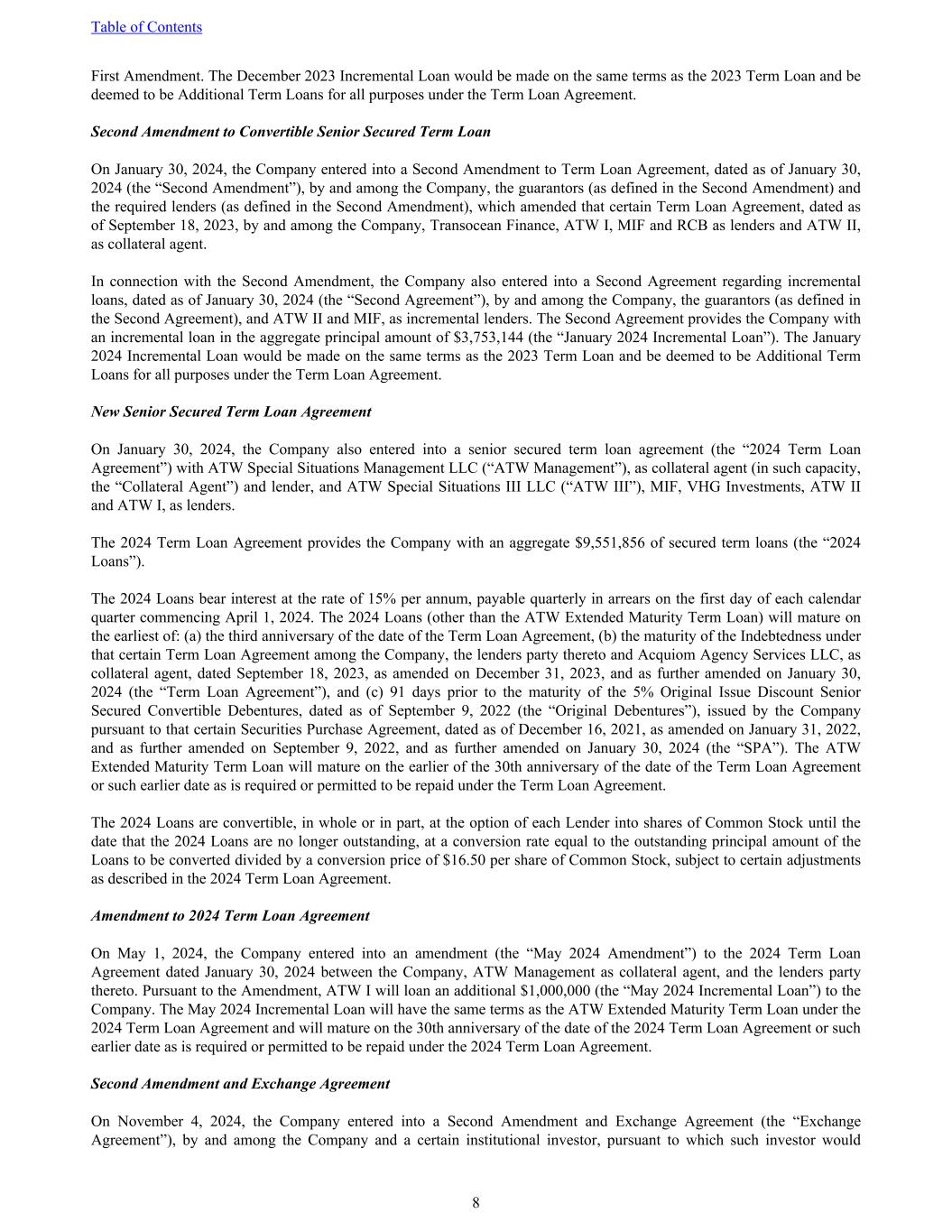 First Amendment. The December 2023 Incremental Loan would be made on the same terms as the 2023 Term Loan and be deemed to be Additional Term Loans for all purposes under the Term Loan Agreement. Second Amendment to Convertible Senior Secured Term Loan On January 30, 2024, the Company entered into a Second Amendment to Term Loan Agreement, dated as of January 30, 2024 (the “Second Amendment”), by and among the Company, the guarantors (as defined in the Second Amendment) and the required lenders (as defined in the Second Amendment), which amended that certain Term Loan Agreement, dated as of September 18, 2023, by and among the Company, Transocean Finance, ATW I, MIF and RCB as lenders and ATW II, as collateral agent. In connection with the Second Amendment, the Company also entered into a Second Agreement regarding incremental loans, dated as of January 30, 2024 (the “Second Agreement”), by and among the Company, the guarantors (as defined in the Second Agreement), and ATW II and MIF, as incremental lenders. The Second Agreement provides the Company with an incremental loan in the aggregate principal amount of $3,753,144 (the “January 2024 Incremental Loan”). The January 2024 Incremental Loan would be made on the same terms as the 2023 Term Loan and be deemed to be Additional Term Loans for all purposes under the Term Loan Agreement. New Senior Secured Term Loan Agreement On January 30, 2024, the Company also entered into a senior secured term loan agreement (the “2024 Term Loan Agreement”) with ATW Special Situations Management LLC (“ATW Management”), as collateral agent (in such capacity, the “Collateral Agent”) and lender, and ATW Special Situations III LLC (“ATW III”), MIF, VHG Investments, ATW II and ATW I, as lenders. The 2024 Term Loan Agreement provides the Company with an aggregate $9,551,856 of secured term loans (the “2024 Loans”). The 2024 Loans bear interest at the rate of 15% per annum, payable quarterly in arrears on the first day of each calendar quarter commencing April 1, 2024. The 2024 Loans (other than the ATW Extended Maturity Term Loan) will mature on the earliest of: (a) the third anniversary of the date of the Term Loan Agreement, (b) the maturity of the Indebtedness under that certain Term Loan Agreement among the Company, the lenders party thereto and Acquiom Agency Services LLC, as collateral agent, dated September 18, 2023, as amended on December 31, 2023, and as further amended on January 30, 2024 (the “Term Loan Agreement”), and (c) 91 days prior to the maturity of the 5% Original Issue Discount Senior Secured Convertible Debentures, dated as of September 9, 2022 (the “Original Debentures”), issued by the Company pursuant to that certain Securities Purchase Agreement, dated as of December 16, 2021, as amended on January 31, 2022, and as further amended on September 9, 2022, and as further amended on January 30, 2024 (the “SPA”). The ATW Extended Maturity Term Loan will mature on the earlier of the 30th anniversary of the date of the Term Loan Agreement or such earlier date as is required or permitted to be repaid under the Term Loan Agreement. The 2024 Loans are convertible, in whole or in part, at the option of each Lender into shares of Common Stock until the date that the 2024 Loans are no longer outstanding, at a conversion rate equal to the outstanding principal amount of the Loans to be converted divided by a conversion price of $16.50 per share of Common Stock, subject to certain adjustments as described in the 2024 Term Loan Agreement. Amendment to 2024 Term Loan Agreement On May 1, 2024, the Company entered into an amendment (the “May 2024 Amendment”) to the 2024 Term Loan Agreement dated January 30, 2024 between the Company, ATW Management as collateral agent, and the lenders party thereto. Pursuant to the Amendment, ATW I will loan an additional $1,000,000 (the “May 2024 Incremental Loan”) to the Company. The May 2024 Incremental Loan will have the same terms as the ATW Extended Maturity Term Loan under the 2024 Term Loan Agreement and will mature on the 30th anniversary of the date of the 2024 Term Loan Agreement or such earlier date as is required or permitted to be repaid under the 2024 Term Loan Agreement. Second Amendment and Exchange Agreement On November 4, 2024, the Company entered into a Second Amendment and Exchange Agreement (the “Exchange Agreement”), by and among the Company and a certain institutional investor, pursuant to which such investor would Table of Contents 8