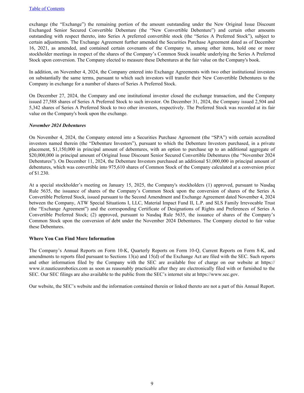 exchange (the “Exchange”) the remaining portion of the amount outstanding under the New Original Issue Discount Exchanged Senior Secured Convertible Debenture (the “New Convertible Debenture”) and certain other amounts outstanding with respect thereto, into Series A preferred convertible stock (the “Series A Preferred Stock”), subject to certain adjustments. The Exchange Agreement further amended the Securities Purchase Agreement dated as of December 16, 2021, as amended, and contained certain covenants of the Company to, among other items, hold one or more stockholder meetings in respect of the shares of the Company’s Common Stock issuable underlying the Series A Preferred Stock upon conversion. The Company elected to measure these Debentures at the fair value on the Company's book. In addition, on November 4, 2024, the Company entered into Exchange Agreements with two other institutional investors on substantially the same terms, pursuant to which such investors will transfer their New Convertible Debentures to the Company in exchange for a number of shares of Series A Preferred Stock. On December 27, 2024, the Company and one institutional investor closed the exchange transaction, and the Company issued 27,588 shares of Series A Preferred Stock to such investor. On December 31, 2024, the Company issued 2,504 and 5,342 shares of Series A Preferred Stock to two other investors, respectively. The Preferred Stock was recorded at its fair value on the Company's book upon the exchange. November 2024 Debentures On November 4, 2024, the Company entered into a Securities Purchase Agreement (the “SPA”) with certain accredited investors named therein (the “Debenture Investors”), pursuant to which the Debenture Investors purchased, in a private placement, $1,150,000 in principal amount of debentures, with an option to purchase up to an additional aggregate of $20,000,000 in principal amount of Original Issue Discount Senior Secured Convertible Debentures (the “November 2024 Debentures”). On December 11, 2024, the Debenture Investors purchased an additional $1,000,000 in principal amount of debentures, which was convertible into 975,610 shares of Common Stock of the Company calculated at a conversion price of $1.230. At a special stockholder’s meeting on January 15, 2025, the Company's stockholders (1) approved, pursuant to Nasdaq Rule 5635, the issuance of shares of the Company’s Common Stock upon the conversion of shares of the Series A Convertible Preferred Stock, issued pursuant to the Second Amendment and Exchange Agreement dated November 4, 2024 between the Company, ATW Special Situations I, LLC, Material Impact Fund II, L.P. and SLS Family Irrevocable Trust (the “Exchange Agreement”) and the corresponding Certificate of Designations of Rights and Preferences of Series A Convertible Preferred Stock; (2) approved, pursuant to Nasdaq Rule 5635, the issuance of shares of the Company’s Common Stock upon the conversion of debt under the November 2024 Debentures. The Company elected to fair value these Debentures. Where You Can Find More Information The Company’s Annual Reports on Form 10-K, Quarterly Reports on Form 10-Q, Current Reports on Form 8-K, and amendments to reports filed pursuant to Sections 13(a) and 15(d) of the Exchange Act are filed with the SEC. Such reports and other information filed by the Company with the SEC are available free of charge on our website at https:// www.ir.nauticusrobotics.com as soon as reasonably practicable after they are electronically filed with or furnished to the SEC. Our SEC filings are also available to the public from the SEC’s internet site at https://www.sec.gov. Our website, the SEC’s website and the information contained therein or linked thereto are not a part of this Annual Report. Table of Contents 9