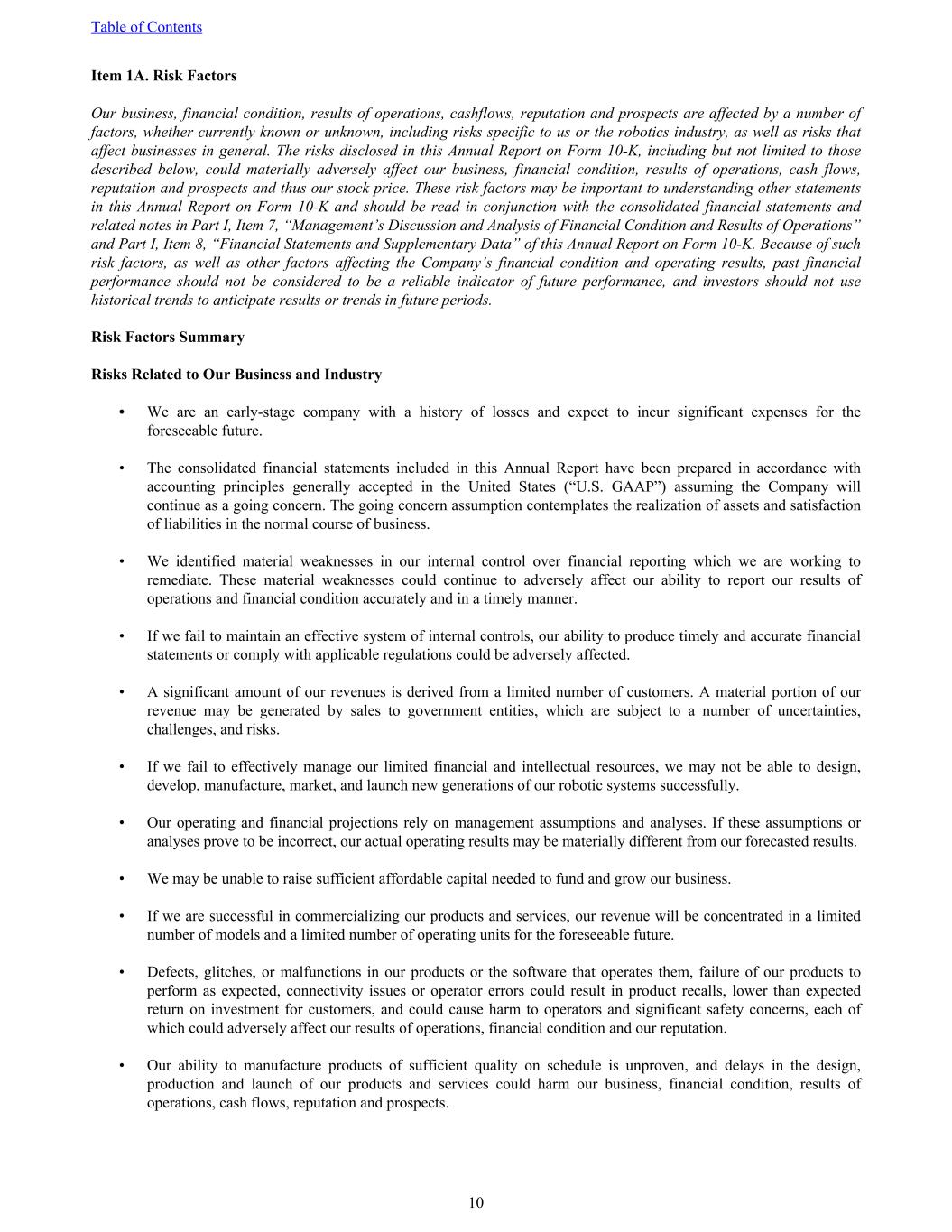 Item 1A. Risk Factors Our business, financial condition, results of operations, cashflows, reputation and prospects are affected by a number of factors, whether currently known or unknown, including risks specific to us or the robotics industry, as well as risks that affect businesses in general. The risks disclosed in this Annual Report on Form 10-K, including but not limited to those described below, could materially adversely affect our business, financial condition, results of operations, cash flows, reputation and prospects and thus our stock price. These risk factors may be important to understanding other statements in this Annual Report on Form 10-K and should be read in conjunction with the consolidated financial statements and related notes in Part I, Item 7, “Management’s Discussion and Analysis of Financial Condition and Results of Operations” and Part I, Item 8, “Financial Statements and Supplementary Data” of this Annual Report on Form 10-K. Because of such risk factors, as well as other factors affecting the Company’s financial condition and operating results, past financial performance should not be considered to be a reliable indicator of future performance, and investors should not use historical trends to anticipate results or trends in future periods. Risk Factors Summary Risks Related to Our Business and Industry • We are an early-stage company with a history of losses and expect to incur significant expenses for the foreseeable future. • The consolidated financial statements included in this Annual Report have been prepared in accordance with accounting principles generally accepted in the United States (“U.S. GAAP”) assuming the Company will continue as a going concern. The going concern assumption contemplates the realization of assets and satisfaction of liabilities in the normal course of business. • We identified material weaknesses in our internal control over financial reporting which we are working to remediate. These material weaknesses could continue to adversely affect our ability to report our results of operations and financial condition accurately and in a timely manner. • If we fail to maintain an effective system of internal controls, our ability to produce timely and accurate financial statements or comply with applicable regulations could be adversely affected. • A significant amount of our revenues is derived from a limited number of customers. A material portion of our revenue may be generated by sales to government entities, which are subject to a number of uncertainties, challenges, and risks. • If we fail to effectively manage our limited financial and intellectual resources, we may not be able to design, develop, manufacture, market, and launch new generations of our robotic systems successfully. • Our operating and financial projections rely on management assumptions and analyses. If these assumptions or analyses prove to be incorrect, our actual operating results may be materially different from our forecasted results. • We may be unable to raise sufficient affordable capital needed to fund and grow our business. • If we are successful in commercializing our products and services, our revenue will be concentrated in a limited number of models and a limited number of operating units for the foreseeable future. • Defects, glitches, or malfunctions in our products or the software that operates them, failure of our products to perform as expected, connectivity issues or operator errors could result in product recalls, lower than expected return on investment for customers, and could cause harm to operators and significant safety concerns, each of which could adversely affect our results of operations, financial condition and our reputation. • Our ability to manufacture products of sufficient quality on schedule is unproven, and delays in the design, production and launch of our products and services could harm our business, financial condition, results of operations, cash flows, reputation and prospects. Table of Contents 10