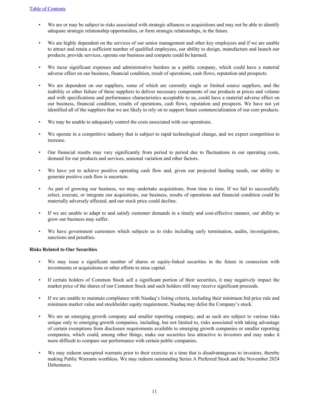 • We are or may be subject to risks associated with strategic alliances or acquisitions and may not be able to identify adequate strategic relationship opportunities, or form strategic relationships, in the future. • We are highly dependent on the services of our senior management and other key employees and if we are unable to attract and retain a sufficient number of qualified employees, our ability to design, manufacture and launch our products, provide services, operate our business and compete could be harmed. • We incur significant expenses and administrative burdens as a public company, which could have a material adverse effect on our business, financial condition, result of operations, cash flows, reputation and prospects. • We are dependent on our suppliers, some of which are currently single or limited source suppliers, and the inability or other failure of these suppliers to deliver necessary components of our products at prices and volume and with specifications and performance characteristics acceptable to us, could have a material adverse effect on our business, financial condition, results of operations, cash flows, reputation and prospects. We have not yet identified all of the suppliers that we are likely to rely on to support future commercialization of our core products. • We may be unable to adequately control the costs associated with our operations. • We operate in a competitive industry that is subject to rapid technological change, and we expect competition to increase. • Our financial results may vary significantly from period to period due to fluctuations in our operating costs, demand for our products and services, seasonal variation and other factors. • We have yet to achieve positive operating cash flow and, given our projected funding needs, our ability to generate positive cash flow is uncertain. • As part of growing our business, we may undertake acquisitions, from time to time. If we fail to successfully select, execute, or integrate our acquisitions, our business, results of operations and financial condition could be materially adversely affected, and our stock price could decline. • If we are unable to adapt to and satisfy customer demands in a timely and cost-effective manner, our ability to grow our business may suffer. • We have government customers which subjects us to risks including early termination, audits, investigations, sanctions and penalties. Risks Related to Our Securities • We may issue a significant number of shares or equity-linked securities in the future in connection with investments or acquisitions or other efforts to raise capital. • If certain holders of Common Stock sell a significant portion of their securities, it may negatively impact the market price of the shares of our Common Stock and such holders still may receive significant proceeds. • If we are unable to maintain compliance with Nasdaq’s listing criteria, including their minimum bid price rule and minimum market value and stockholder equity requirement, Nasdaq may delist the Company’s stock. • We are an emerging growth company and smaller reporting company, and as such are subject to various risks unique only to emerging growth companies, including, but not limited to, risks associated with taking advantage of certain exemptions from disclosure requirements available to emerging growth companies or smaller reporting companies, which could, among other things, make our securities less attractive to investors and may make it more difficult to compare our performance with certain public companies. • We may redeem unexpired warrants prior to their exercise at a time that is disadvantageous to investors, thereby making Public Warrants worthless. We may redeem outstanding Series A Preferred Stock and the November 2024 Debentures. Table of Contents 11