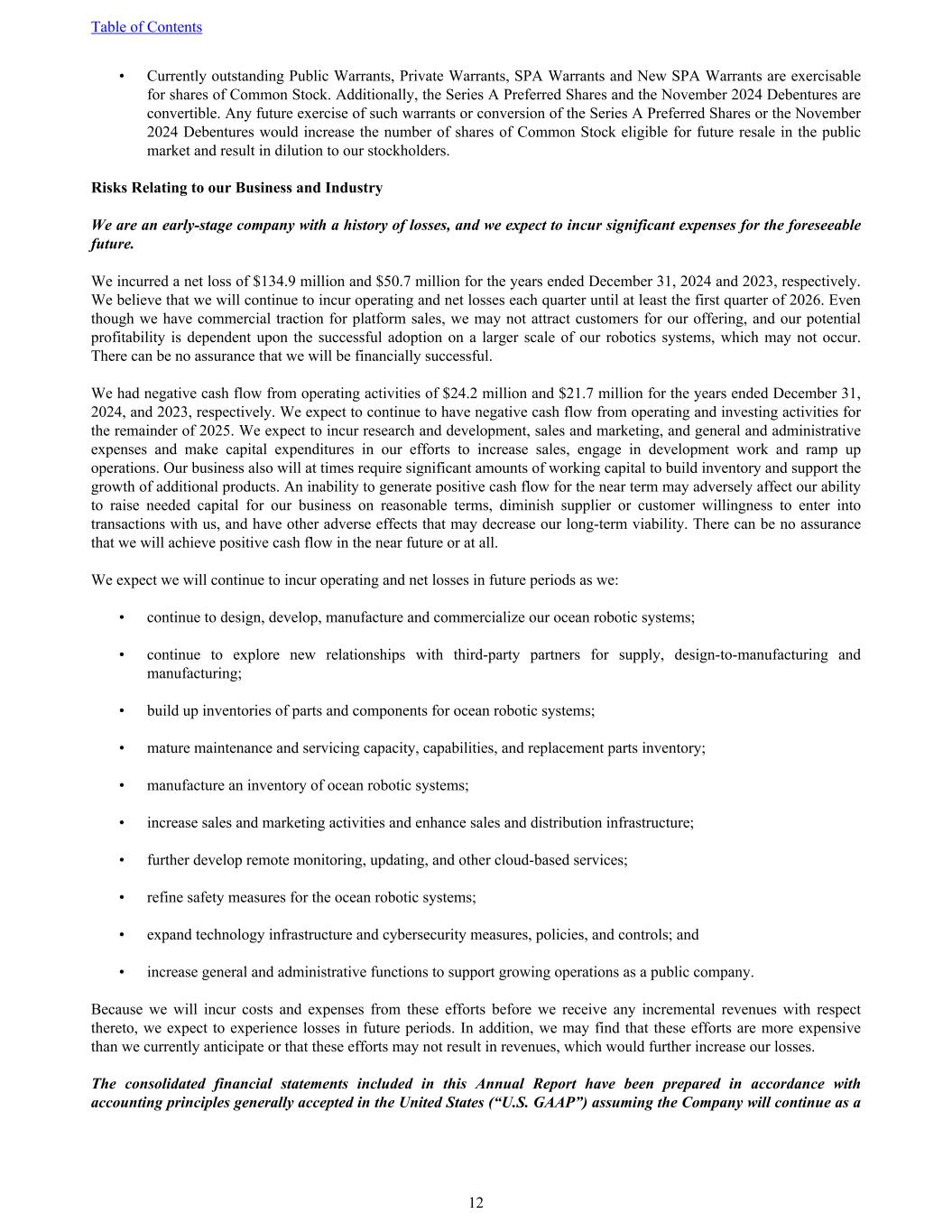 • Currently outstanding Public Warrants, Private Warrants, SPA Warrants and New SPA Warrants are exercisable for shares of Common Stock. Additionally, the Series A Preferred Shares and the November 2024 Debentures are convertible. Any future exercise of such warrants or conversion of the Series A Preferred Shares or the November 2024 Debentures would increase the number of shares of Common Stock eligible for future resale in the public market and result in dilution to our stockholders. Risks Relating to our Business and Industry We are an early-stage company with a history of losses, and we expect to incur significant expenses for the foreseeable future. We incurred a net loss of $134.9 million and $50.7 million for the years ended December 31, 2024 and 2023, respectively. We believe that we will continue to incur operating and net losses each quarter until at least the first quarter of 2026. Even though we have commercial traction for platform sales, we may not attract customers for our offering, and our potential profitability is dependent upon the successful adoption on a larger scale of our robotics systems, which may not occur. There can be no assurance that we will be financially successful. We had negative cash flow from operating activities of $24.2 million and $21.7 million for the years ended December 31, 2024, and 2023, respectively. We expect to continue to have negative cash flow from operating and investing activities for the remainder of 2025. We expect to incur research and development, sales and marketing, and general and administrative expenses and make capital expenditures in our efforts to increase sales, engage in development work and ramp up operations. Our business also will at times require significant amounts of working capital to build inventory and support the growth of additional products. An inability to generate positive cash flow for the near term may adversely affect our ability to raise needed capital for our business on reasonable terms, diminish supplier or customer willingness to enter into transactions with us, and have other adverse effects that may decrease our long-term viability. There can be no assurance that we will achieve positive cash flow in the near future or at all. We expect we will continue to incur operating and net losses in future periods as we: • continue to design, develop, manufacture and commercialize our ocean robotic systems; • continue to explore new relationships with third-party partners for supply, design-to-manufacturing and manufacturing; • build up inventories of parts and components for ocean robotic systems; • mature maintenance and servicing capacity, capabilities, and replacement parts inventory; • manufacture an inventory of ocean robotic systems; • increase sales and marketing activities and enhance sales and distribution infrastructure; • further develop remote monitoring, updating, and other cloud-based services; • refine safety measures for the ocean robotic systems; • expand technology infrastructure and cybersecurity measures, policies, and controls; and • increase general and administrative functions to support growing operations as a public company. Because we will incur costs and expenses from these efforts before we receive any incremental revenues with respect thereto, we expect to experience losses in future periods. In addition, we may find that these efforts are more expensive than we currently anticipate or that these efforts may not result in revenues, which would further increase our losses. The consolidated financial statements included in this Annual Report have been prepared in accordance with accounting principles generally accepted in the United States (“U.S. GAAP”) assuming the Company will continue as a Table of Contents 12