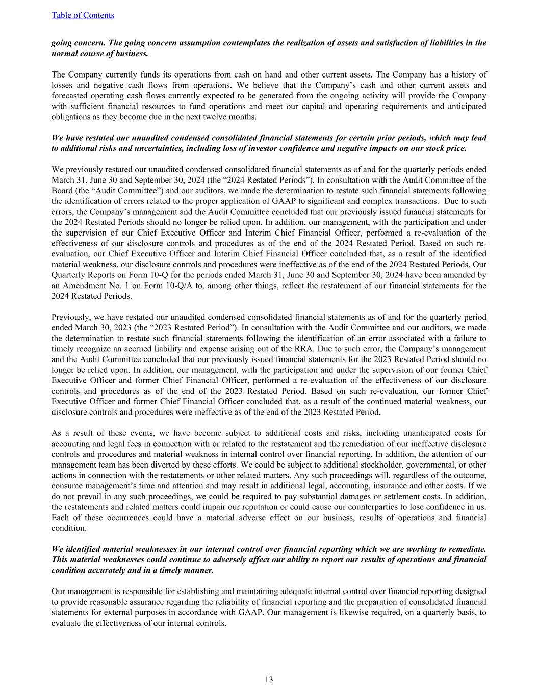 going concern. The going concern assumption contemplates the realization of assets and satisfaction of liabilities in the normal course of business. The Company currently funds its operations from cash on hand and other current assets. The Company has a history of losses and negative cash flows from operations. We believe that the Company’s cash and other current assets and forecasted operating cash flows currently expected to be generated from the ongoing activity will provide the Company with sufficient financial resources to fund operations and meet our capital and operating requirements and anticipated obligations as they become due in the next twelve months. We have restated our unaudited condensed consolidated financial statements for certain prior periods, which may lead to additional risks and uncertainties, including loss of investor confidence and negative impacts on our stock price. We previously restated our unaudited condensed consolidated financial statements as of and for the quarterly periods ended March 31, June 30 and September 30, 2024 (the “2024 Restated Periods”). In consultation with the Audit Committee of the Board (the “Audit Committee”) and our auditors, we made the determination to restate such financial statements following the identification of errors related to the proper application of GAAP to significant and complex transactions. Due to such errors, the Company’s management and the Audit Committee concluded that our previously issued financial statements for the 2024 Restated Periods should no longer be relied upon. In addition, our management, with the participation and under the supervision of our Chief Executive Officer and Interim Chief Financial Officer, performed a re-evaluation of the effectiveness of our disclosure controls and procedures as of the end of the 2024 Restated Period. Based on such re- evaluation, our Chief Executive Officer and Interim Chief Financial Officer concluded that, as a result of the identified material weakness, our disclosure controls and procedures were ineffective as of the end of the 2024 Restated Periods. Our Quarterly Reports on Form 10-Q for the periods ended March 31, June 30 and September 30, 2024 have been amended by an Amendment No. 1 on Form 10-Q/A to, among other things, reflect the restatement of our financial statements for the 2024 Restated Periods. Previously, we have restated our unaudited condensed consolidated financial statements as of and for the quarterly period ended March 30, 2023 (the “2023 Restated Period”). In consultation with the Audit Committee and our auditors, we made the determination to restate such financial statements following the identification of an error associated with a failure to timely recognize an accrued liability and expense arising out of the RRA. Due to such error, the Company’s management and the Audit Committee concluded that our previously issued financial statements for the 2023 Restated Period should no longer be relied upon. In addition, our management, with the participation and under the supervision of our former Chief Executive Officer and former Chief Financial Officer, performed a re-evaluation of the effectiveness of our disclosure controls and procedures as of the end of the 2023 Restated Period. Based on such re-evaluation, our former Chief Executive Officer and former Chief Financial Officer concluded that, as a result of the continued material weakness, our disclosure controls and procedures were ineffective as of the end of the 2023 Restated Period. As a result of these events, we have become subject to additional costs and risks, including unanticipated costs for accounting and legal fees in connection with or related to the restatement and the remediation of our ineffective disclosure controls and procedures and material weakness in internal control over financial reporting. In addition, the attention of our management team has been diverted by these efforts. We could be subject to additional stockholder, governmental, or other actions in connection with the restatements or other related matters. Any such proceedings will, regardless of the outcome, consume management’s time and attention and may result in additional legal, accounting, insurance and other costs. If we do not prevail in any such proceedings, we could be required to pay substantial damages or settlement costs. In addition, the restatements and related matters could impair our reputation or could cause our counterparties to lose confidence in us. Each of these occurrences could have a material adverse effect on our business, results of operations and financial condition. We identified material weaknesses in our internal control over financial reporting which we are working to remediate. This material weaknesses could continue to adversely affect our ability to report our results of operations and financial condition accurately and in a timely manner. Our management is responsible for establishing and maintaining adequate internal control over financial reporting designed to provide reasonable assurance regarding the reliability of financial reporting and the preparation of consolidated financial statements for external purposes in accordance with GAAP. Our management is likewise required, on a quarterly basis, to evaluate the effectiveness of our internal controls. Table of Contents 13