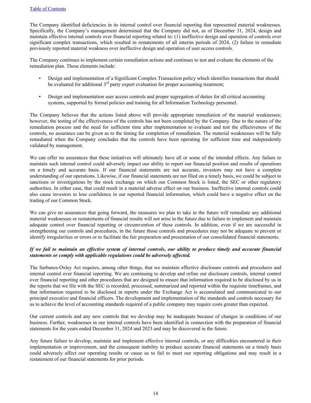 The Company identified deficiencies in its internal control over financial reporting that represented material weaknesses. Specifically, the Company’s management determined that the Company did not, as of December 31, 2024, design and maintain effective internal controls over financial reporting related to: (1) ineffective design and operation of controls over significant complex transactions, which resulted in restatements of all interim periods of 2024, (2) failure to remediate previously reported material weakness over ineffective design and operation of user access controls. The Company continues to implement certain remediation actions and continues to test and evaluate the elements of the remediation plan. These elements include: • Design and implementation of a Significant Complex Transaction policy which identifies transactions that should be evaluated for additional 3rd party expert evaluation for proper accounting treatment; • Design and implementation user access controls and proper segregation of duties for all critical accounting systems, supported by formal policies and training for all Information Technology personnel. The Company believes that the actions listed above will provide appropriate remediation of the material weaknesses; however, the testing of the effectiveness of the controls has not been completed by the Company. Due to the nature of the remediation process and the need for sufficient time after implementation to evaluate and test the effectiveness of the controls, no assurance can be given as to the timing for completion of remediation. The material weaknesses will be fully remediated when the Company concludes that the controls have been operating for sufficient time and independently validated by management. We can offer no assurances that these initiatives will ultimately have all or some of the intended effects. Any failure to maintain such internal control could adversely impact our ability to report our financial position and results of operations on a timely and accurate basis. If our financial statements are not accurate, investors may not have a complete understanding of our operations. Likewise, if our financial statements are not filed on a timely basis, we could be subject to sanctions or investigations by the stock exchange on which our Common Stock is listed, the SEC or other regulatory authorities. In either case, that could result in a material adverse effect on our business. Ineffective internal controls could also cause investors to lose confidence in our reported financial information, which could have a negative effect on the trading of our Common Stock. We can give no assurances that going forward, the measures we plan to take in the future will remediate any additional material weaknesses or restatements of financial results will not arise in the future due to failure to implement and maintain adequate control over financial reporting or circumvention of these controls. In addition, even if we are successful in strengthening our controls and procedures, in the future those controls and procedures may not be adequate to prevent or identify irregularities or errors or to facilitate the fair preparation and presentation of our consolidated financial statements. If we fail to maintain an effective system of internal controls, our ability to produce timely and accurate financial statements or comply with applicable regulations could be adversely affected. The Sarbanes-Oxley Act requires, among other things, that we maintain effective disclosure controls and procedures and internal control over financial reporting. We are continuing to develop and refine our disclosure controls, internal control over financial reporting and other procedures that are designed to ensure that information required to be disclosed by us in the reports that we file with the SEC is recorded, processed, summarized and reported within the requisite timeframes, and that information required to be disclosed in reports under the Exchange Act is accumulated and communicated to our principal executive and financial officers. The development and implementation of the standards and controls necessary for us to achieve the level of accounting standards required of a public company may require costs greater than expected. Our current controls and any new controls that we develop may be inadequate because of changes in conditions of our business. Further, weaknesses in our internal controls have been identified in connection with the preparation of financial statements for the years ended December 31, 2024 and 2023 and may be discovered in the future. Any future failure to develop, maintain and implement effective internal controls, or any difficulties encountered in their implementation or improvement, and the consequent inability to produce accurate financial statements on a timely basis could adversely affect our operating results or cause us to fail to meet our reporting obligations and may result in a restatement of our financial statements for prior periods. Table of Contents 14
