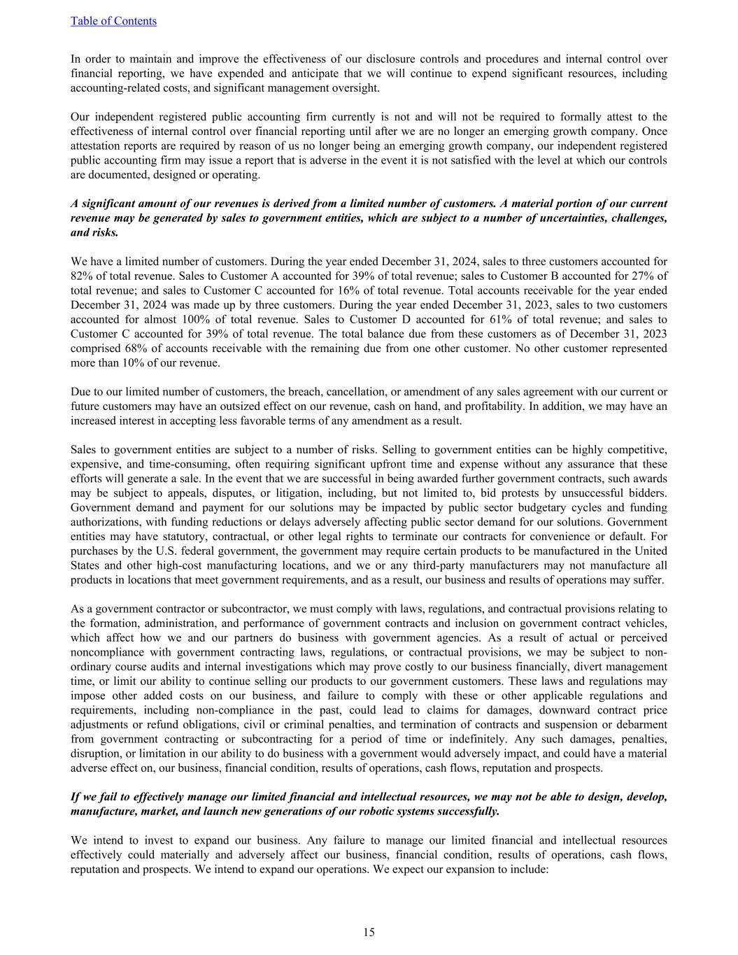 In order to maintain and improve the effectiveness of our disclosure controls and procedures and internal control over financial reporting, we have expended and anticipate that we will continue to expend significant resources, including accounting-related costs, and significant management oversight. Our independent registered public accounting firm currently is not and will not be required to formally attest to the effectiveness of internal control over financial reporting until after we are no longer an emerging growth company. Once attestation reports are required by reason of us no longer being an emerging growth company, our independent registered public accounting firm may issue a report that is adverse in the event it is not satisfied with the level at which our controls are documented, designed or operating. A significant amount of our revenues is derived from a limited number of customers. A material portion of our current revenue may be generated by sales to government entities, which are subject to a number of uncertainties, challenges, and risks. We have a limited number of customers. During the year ended December 31, 2024, sales to three customers accounted for 82% of total revenue. Sales to Customer A accounted for 39% of total revenue; sales to Customer B accounted for 27% of total revenue; and sales to Customer C accounted for 16% of total revenue. Total accounts receivable for the year ended December 31, 2024 was made up by three customers. During the year ended December 31, 2023, sales to two customers accounted for almost 100% of total revenue. Sales to Customer D accounted for 61% of total revenue; and sales to Customer C accounted for 39% of total revenue. The total balance due from these customers as of December 31, 2023 comprised 68% of accounts receivable with the remaining due from one other customer. No other customer represented more than 10% of our revenue. Due to our limited number of customers, the breach, cancellation, or amendment of any sales agreement with our current or future customers may have an outsized effect on our revenue, cash on hand, and profitability. In addition, we may have an increased interest in accepting less favorable terms of any amendment as a result. Sales to government entities are subject to a number of risks. Selling to government entities can be highly competitive, expensive, and time-consuming, often requiring significant upfront time and expense without any assurance that these efforts will generate a sale. In the event that we are successful in being awarded further government contracts, such awards may be subject to appeals, disputes, or litigation, including, but not limited to, bid protests by unsuccessful bidders. Government demand and payment for our solutions may be impacted by public sector budgetary cycles and funding authorizations, with funding reductions or delays adversely affecting public sector demand for our solutions. Government entities may have statutory, contractual, or other legal rights to terminate our contracts for convenience or default. For purchases by the U.S. federal government, the government may require certain products to be manufactured in the United States and other high-cost manufacturing locations, and we or any third-party manufacturers may not manufacture all products in locations that meet government requirements, and as a result, our business and results of operations may suffer. As a government contractor or subcontractor, we must comply with laws, regulations, and contractual provisions relating to the formation, administration, and performance of government contracts and inclusion on government contract vehicles, which affect how we and our partners do business with government agencies. As a result of actual or perceived noncompliance with government contracting laws, regulations, or contractual provisions, we may be subject to non- ordinary course audits and internal investigations which may prove costly to our business financially, divert management time, or limit our ability to continue selling our products to our government customers. These laws and regulations may impose other added costs on our business, and failure to comply with these or other applicable regulations and requirements, including non-compliance in the past, could lead to claims for damages, downward contract price adjustments or refund obligations, civil or criminal penalties, and termination of contracts and suspension or debarment from government contracting or subcontracting for a period of time or indefinitely. Any such damages, penalties, disruption, or limitation in our ability to do business with a government would adversely impact, and could have a material adverse effect on, our business, financial condition, results of operations, cash flows, reputation and prospects. If we fail to effectively manage our limited financial and intellectual resources, we may not be able to design, develop, manufacture, market, and launch new generations of our robotic systems successfully. We intend to invest to expand our business. Any failure to manage our limited financial and intellectual resources effectively could materially and adversely affect our business, financial condition, results of operations, cash flows, reputation and prospects. We intend to expand our operations. We expect our expansion to include: Table of Contents 15
