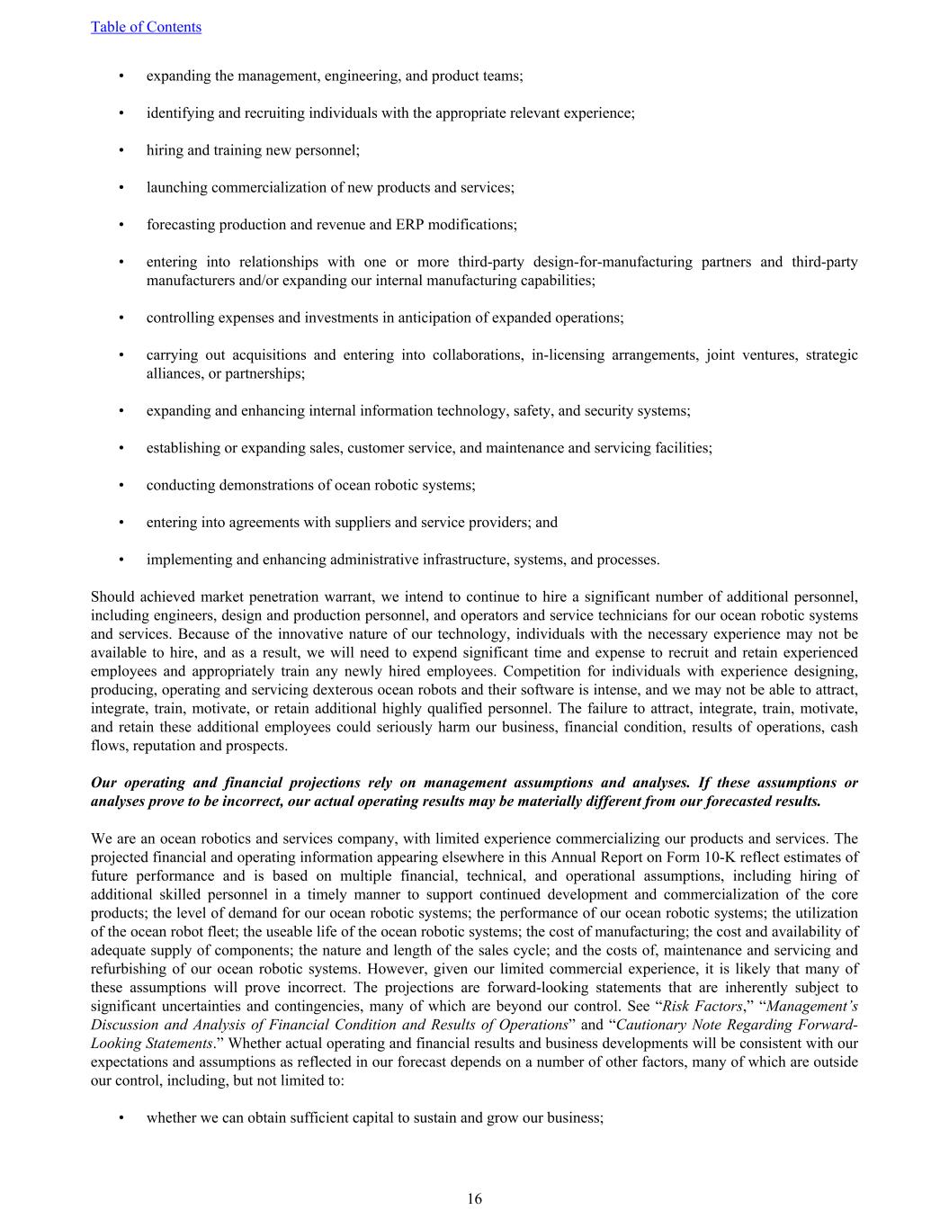 • expanding the management, engineering, and product teams; • identifying and recruiting individuals with the appropriate relevant experience; • hiring and training new personnel; • launching commercialization of new products and services; • forecasting production and revenue and ERP modifications; • entering into relationships with one or more third-party design-for-manufacturing partners and third-party manufacturers and/or expanding our internal manufacturing capabilities; • controlling expenses and investments in anticipation of expanded operations; • carrying out acquisitions and entering into collaborations, in-licensing arrangements, joint ventures, strategic alliances, or partnerships; • expanding and enhancing internal information technology, safety, and security systems; • establishing or expanding sales, customer service, and maintenance and servicing facilities; • conducting demonstrations of ocean robotic systems; • entering into agreements with suppliers and service providers; and • implementing and enhancing administrative infrastructure, systems, and processes. Should achieved market penetration warrant, we intend to continue to hire a significant number of additional personnel, including engineers, design and production personnel, and operators and service technicians for our ocean robotic systems and services. Because of the innovative nature of our technology, individuals with the necessary experience may not be available to hire, and as a result, we will need to expend significant time and expense to recruit and retain experienced employees and appropriately train any newly hired employees. Competition for individuals with experience designing, producing, operating and servicing dexterous ocean robots and their software is intense, and we may not be able to attract, integrate, train, motivate, or retain additional highly qualified personnel. The failure to attract, integrate, train, motivate, and retain these additional employees could seriously harm our business, financial condition, results of operations, cash flows, reputation and prospects. Our operating and financial projections rely on management assumptions and analyses. If these assumptions or analyses prove to be incorrect, our actual operating results may be materially different from our forecasted results. We are an ocean robotics and services company, with limited experience commercializing our products and services. The projected financial and operating information appearing elsewhere in this Annual Report on Form 10-K reflect estimates of future performance and is based on multiple financial, technical, and operational assumptions, including hiring of additional skilled personnel in a timely manner to support continued development and commercialization of the core products; the level of demand for our ocean robotic systems; the performance of our ocean robotic systems; the utilization of the ocean robot fleet; the useable life of the ocean robotic systems; the cost of manufacturing; the cost and availability of adequate supply of components; the nature and length of the sales cycle; and the costs of, maintenance and servicing and refurbishing of our ocean robotic systems. However, given our limited commercial experience, it is likely that many of these assumptions will prove incorrect. The projections are forward-looking statements that are inherently subject to significant uncertainties and contingencies, many of which are beyond our control. See “Risk Factors,” “Management’s Discussion and Analysis of Financial Condition and Results of Operations” and “Cautionary Note Regarding Forward- Looking Statements.” Whether actual operating and financial results and business developments will be consistent with our expectations and assumptions as reflected in our forecast depends on a number of other factors, many of which are outside our control, including, but not limited to: • whether we can obtain sufficient capital to sustain and grow our business; Table of Contents 16