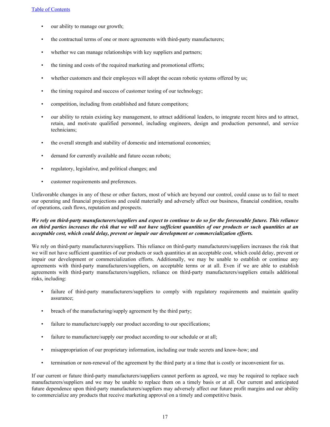 • our ability to manage our growth; • the contractual terms of one or more agreements with third-party manufacturers; • whether we can manage relationships with key suppliers and partners; • the timing and costs of the required marketing and promotional efforts; • whether customers and their employees will adopt the ocean robotic systems offered by us; • the timing required and success of customer testing of our technology; • competition, including from established and future competitors; • our ability to retain existing key management, to attract additional leaders, to integrate recent hires and to attract, retain, and motivate qualified personnel, including engineers, design and production personnel, and service technicians; • the overall strength and stability of domestic and international economies; • demand for currently available and future ocean robots; • regulatory, legislative, and political changes; and • customer requirements and preferences. Unfavorable changes in any of these or other factors, most of which are beyond our control, could cause us to fail to meet our operating and financial projections and could materially and adversely affect our business, financial condition, results of operations, cash flows, reputation and prospects. We rely on third-party manufacturers/suppliers and expect to continue to do so for the foreseeable future. This reliance on third parties increases the risk that we will not have sufficient quantities of our products or such quantities at an acceptable cost, which could delay, prevent or impair our development or commercialization efforts. We rely on third-party manufacturers/suppliers. This reliance on third-party manufacturers/suppliers increases the risk that we will not have sufficient quantities of our products or such quantities at an acceptable cost, which could delay, prevent or impair our development or commercialization efforts. Additionally, we may be unable to establish or continue any agreements with third-party manufacturers/suppliers, on acceptable terms or at all. Even if we are able to establish agreements with third-party manufacturers/suppliers, reliance on third-party manufacturers/suppliers entails additional risks, including: • failure of third-party manufacturers/suppliers to comply with regulatory requirements and maintain quality assurance; • breach of the manufacturing/supply agreement by the third party; • failure to manufacture/supply our product according to our specifications; • failure to manufacture/supply our product according to our schedule or at all; • misappropriation of our proprietary information, including our trade secrets and know-how; and • termination or non-renewal of the agreement by the third party at a time that is costly or inconvenient for us. If our current or future third-party manufacturers/suppliers cannot perform as agreed, we may be required to replace such manufacturers/suppliers and we may be unable to replace them on a timely basis or at all. Our current and anticipated future dependence upon third-party manufacturers/suppliers may adversely affect our future profit margins and our ability to commercialize any products that receive marketing approval on a timely and competitive basis. Table of Contents 17