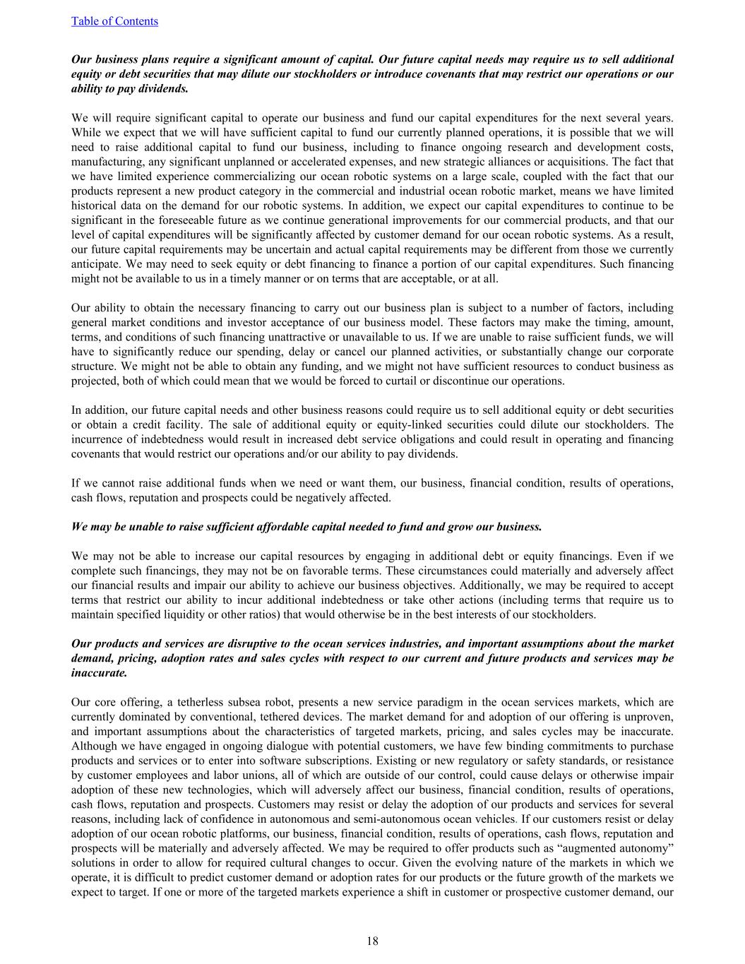 Our business plans require a significant amount of capital. Our future capital needs may require us to sell additional equity or debt securities that may dilute our stockholders or introduce covenants that may restrict our operations or our ability to pay dividends. We will require significant capital to operate our business and fund our capital expenditures for the next several years. While we expect that we will have sufficient capital to fund our currently planned operations, it is possible that we will need to raise additional capital to fund our business, including to finance ongoing research and development costs, manufacturing, any significant unplanned or accelerated expenses, and new strategic alliances or acquisitions. The fact that we have limited experience commercializing our ocean robotic systems on a large scale, coupled with the fact that our products represent a new product category in the commercial and industrial ocean robotic market, means we have limited historical data on the demand for our robotic systems. In addition, we expect our capital expenditures to continue to be significant in the foreseeable future as we continue generational improvements for our commercial products, and that our level of capital expenditures will be significantly affected by customer demand for our ocean robotic systems. As a result, our future capital requirements may be uncertain and actual capital requirements may be different from those we currently anticipate. We may need to seek equity or debt financing to finance a portion of our capital expenditures. Such financing might not be available to us in a timely manner or on terms that are acceptable, or at all. Our ability to obtain the necessary financing to carry out our business plan is subject to a number of factors, including general market conditions and investor acceptance of our business model. These factors may make the timing, amount, terms, and conditions of such financing unattractive or unavailable to us. If we are unable to raise sufficient funds, we will have to significantly reduce our spending, delay or cancel our planned activities, or substantially change our corporate structure. We might not be able to obtain any funding, and we might not have sufficient resources to conduct business as projected, both of which could mean that we would be forced to curtail or discontinue our operations. In addition, our future capital needs and other business reasons could require us to sell additional equity or debt securities or obtain a credit facility. The sale of additional equity or equity-linked securities could dilute our stockholders. The incurrence of indebtedness would result in increased debt service obligations and could result in operating and financing covenants that would restrict our operations and/or our ability to pay dividends. If we cannot raise additional funds when we need or want them, our business, financial condition, results of operations, cash flows, reputation and prospects could be negatively affected. We may be unable to raise sufficient affordable capital needed to fund and grow our business. We may not be able to increase our capital resources by engaging in additional debt or equity financings. Even if we complete such financings, they may not be on favorable terms. These circumstances could materially and adversely affect our financial results and impair our ability to achieve our business objectives. Additionally, we may be required to accept terms that restrict our ability to incur additional indebtedness or take other actions (including terms that require us to maintain specified liquidity or other ratios) that would otherwise be in the best interests of our stockholders. Our products and services are disruptive to the ocean services industries, and important assumptions about the market demand, pricing, adoption rates and sales cycles with respect to our current and future products and services may be inaccurate. Our core offering, a tetherless subsea robot, presents a new service paradigm in the ocean services markets, which are currently dominated by conventional, tethered devices. The market demand for and adoption of our offering is unproven, and important assumptions about the characteristics of targeted markets, pricing, and sales cycles may be inaccurate. Although we have engaged in ongoing dialogue with potential customers, we have few binding commitments to purchase products and services or to enter into software subscriptions. Existing or new regulatory or safety standards, or resistance by customer employees and labor unions, all of which are outside of our control, could cause delays or otherwise impair adoption of these new technologies, which will adversely affect our business, financial condition, results of operations, cash flows, reputation and prospects. Customers may resist or delay the adoption of our products and services for several reasons, including lack of confidence in autonomous and semi-autonomous ocean vehicles. If our customers resist or delay adoption of our ocean robotic platforms, our business, financial condition, results of operations, cash flows, reputation and prospects will be materially and adversely affected. We may be required to offer products such as “augmented autonomy” solutions in order to allow for required cultural changes to occur. Given the evolving nature of the markets in which we operate, it is difficult to predict customer demand or adoption rates for our products or the future growth of the markets we expect to target. If one or more of the targeted markets experience a shift in customer or prospective customer demand, our Table of Contents 18