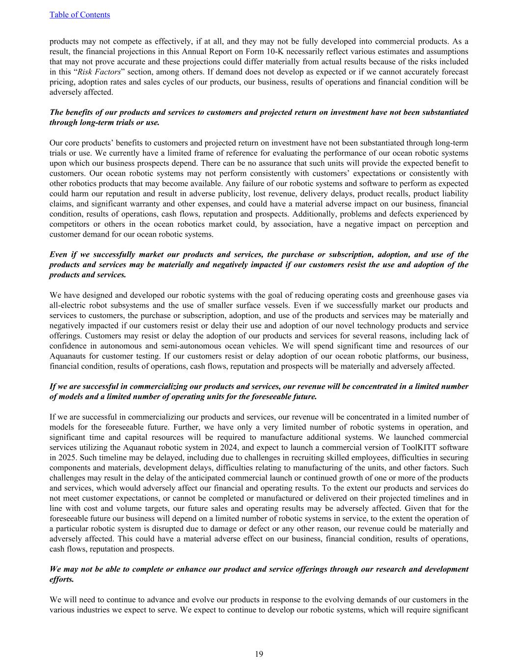 products may not compete as effectively, if at all, and they may not be fully developed into commercial products. As a result, the financial projections in this Annual Report on Form 10-K necessarily reflect various estimates and assumptions that may not prove accurate and these projections could differ materially from actual results because of the risks included in this “Risk Factors” section, among others. If demand does not develop as expected or if we cannot accurately forecast pricing, adoption rates and sales cycles of our products, our business, results of operations and financial condition will be adversely affected. The benefits of our products and services to customers and projected return on investment have not been substantiated through long-term trials or use. Our core products’ benefits to customers and projected return on investment have not been substantiated through long-term trials or use. We currently have a limited frame of reference for evaluating the performance of our ocean robotic systems upon which our business prospects depend. There can be no assurance that such units will provide the expected benefit to customers. Our ocean robotic systems may not perform consistently with customers’ expectations or consistently with other robotics products that may become available. Any failure of our robotic systems and software to perform as expected could harm our reputation and result in adverse publicity, lost revenue, delivery delays, product recalls, product liability claims, and significant warranty and other expenses, and could have a material adverse impact on our business, financial condition, results of operations, cash flows, reputation and prospects. Additionally, problems and defects experienced by competitors or others in the ocean robotics market could, by association, have a negative impact on perception and customer demand for our ocean robotic systems. Even if we successfully market our products and services, the purchase or subscription, adoption, and use of the products and services may be materially and negatively impacted if our customers resist the use and adoption of the products and services. We have designed and developed our robotic systems with the goal of reducing operating costs and greenhouse gases via all-electric robot subsystems and the use of smaller surface vessels. Even if we successfully market our products and services to customers, the purchase or subscription, adoption, and use of the products and services may be materially and negatively impacted if our customers resist or delay their use and adoption of our novel technology products and service offerings. Customers may resist or delay the adoption of our products and services for several reasons, including lack of confidence in autonomous and semi-autonomous ocean vehicles. We will spend significant time and resources of our Aquanauts for customer testing. If our customers resist or delay adoption of our ocean robotic platforms, our business, financial condition, results of operations, cash flows, reputation and prospects will be materially and adversely affected. If we are successful in commercializing our products and services, our revenue will be concentrated in a limited number of models and a limited number of operating units for the foreseeable future. If we are successful in commercializing our products and services, our revenue will be concentrated in a limited number of models for the foreseeable future. Further, we have only a very limited number of robotic systems in operation, and significant time and capital resources will be required to manufacture additional systems. We launched commercial services utilizing the Aquanaut robotic system in 2024, and expect to launch a commercial version of ToolKITT software in 2025. Such timeline may be delayed, including due to challenges in recruiting skilled employees, difficulties in securing components and materials, development delays, difficulties relating to manufacturing of the units, and other factors. Such challenges may result in the delay of the anticipated commercial launch or continued growth of one or more of the products and services, which would adversely affect our financial and operating results. To the extent our products and services do not meet customer expectations, or cannot be completed or manufactured or delivered on their projected timelines and in line with cost and volume targets, our future sales and operating results may be adversely affected. Given that for the foreseeable future our business will depend on a limited number of robotic systems in service, to the extent the operation of a particular robotic system is disrupted due to damage or defect or any other reason, our revenue could be materially and adversely affected. This could have a material adverse effect on our business, financial condition, results of operations, cash flows, reputation and prospects. We may not be able to complete or enhance our product and service offerings through our research and development efforts. We will need to continue to advance and evolve our products in response to the evolving demands of our customers in the various industries we expect to serve. We expect to continue to develop our robotic systems, which will require significant Table of Contents 19