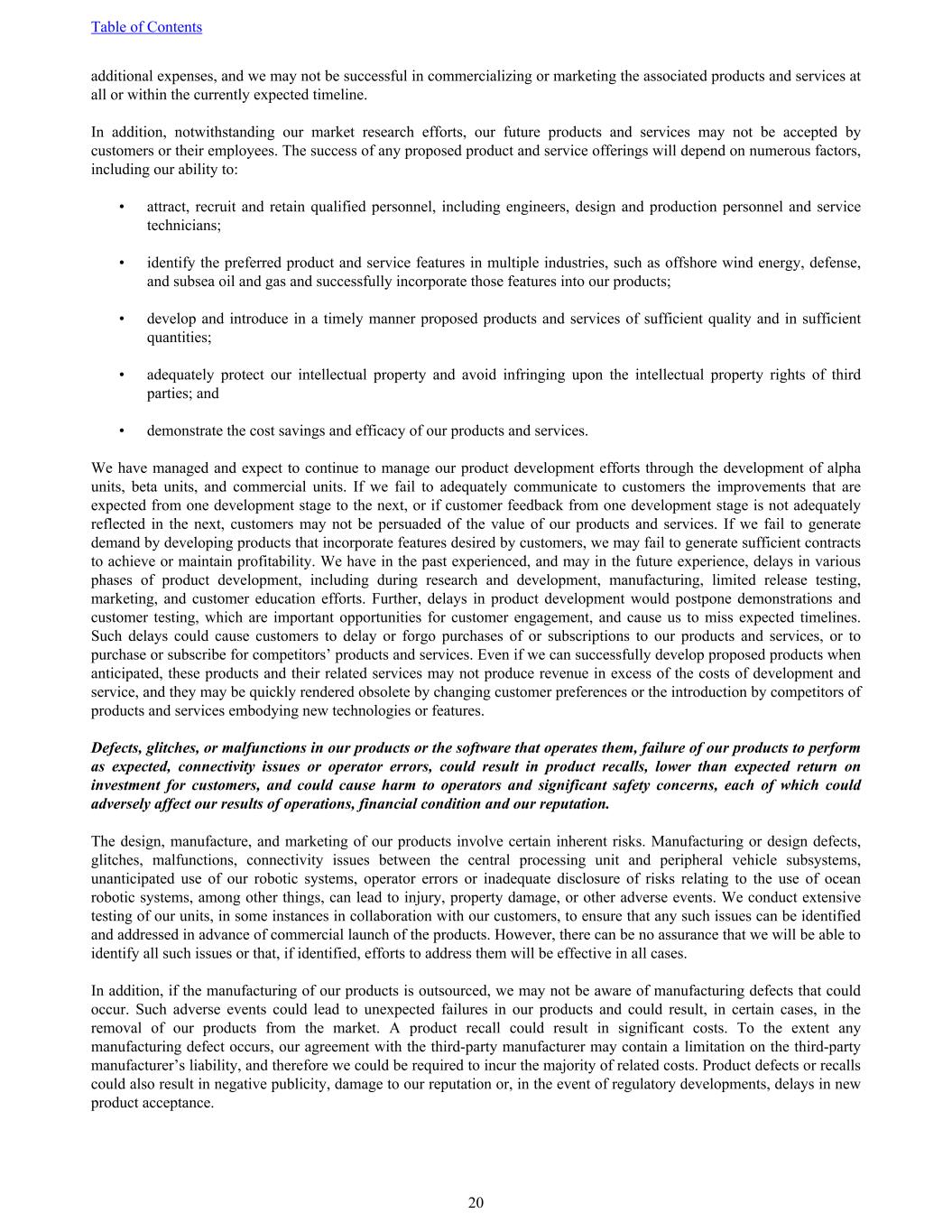 additional expenses, and we may not be successful in commercializing or marketing the associated products and services at all or within the currently expected timeline. In addition, notwithstanding our market research efforts, our future products and services may not be accepted by customers or their employees. The success of any proposed product and service offerings will depend on numerous factors, including our ability to: • attract, recruit and retain qualified personnel, including engineers, design and production personnel and service technicians; • identify the preferred product and service features in multiple industries, such as offshore wind energy, defense, and subsea oil and gas and successfully incorporate those features into our products; • develop and introduce in a timely manner proposed products and services of sufficient quality and in sufficient quantities; • adequately protect our intellectual property and avoid infringing upon the intellectual property rights of third parties; and • demonstrate the cost savings and efficacy of our products and services. We have managed and expect to continue to manage our product development efforts through the development of alpha units, beta units, and commercial units. If we fail to adequately communicate to customers the improvements that are expected from one development stage to the next, or if customer feedback from one development stage is not adequately reflected in the next, customers may not be persuaded of the value of our products and services. If we fail to generate demand by developing products that incorporate features desired by customers, we may fail to generate sufficient contracts to achieve or maintain profitability. We have in the past experienced, and may in the future experience, delays in various phases of product development, including during research and development, manufacturing, limited release testing, marketing, and customer education efforts. Further, delays in product development would postpone demonstrations and customer testing, which are important opportunities for customer engagement, and cause us to miss expected timelines. Such delays could cause customers to delay or forgo purchases of or subscriptions to our products and services, or to purchase or subscribe for competitors’ products and services. Even if we can successfully develop proposed products when anticipated, these products and their related services may not produce revenue in excess of the costs of development and service, and they may be quickly rendered obsolete by changing customer preferences or the introduction by competitors of products and services embodying new technologies or features. Defects, glitches, or malfunctions in our products or the software that operates them, failure of our products to perform as expected, connectivity issues or operator errors, could result in product recalls, lower than expected return on investment for customers, and could cause harm to operators and significant safety concerns, each of which could adversely affect our results of operations, financial condition and our reputation. The design, manufacture, and marketing of our products involve certain inherent risks. Manufacturing or design defects, glitches, malfunctions, connectivity issues between the central processing unit and peripheral vehicle subsystems, unanticipated use of our robotic systems, operator errors or inadequate disclosure of risks relating to the use of ocean robotic systems, among other things, can lead to injury, property damage, or other adverse events. We conduct extensive testing of our units, in some instances in collaboration with our customers, to ensure that any such issues can be identified and addressed in advance of commercial launch of the products. However, there can be no assurance that we will be able to identify all such issues or that, if identified, efforts to address them will be effective in all cases. In addition, if the manufacturing of our products is outsourced, we may not be aware of manufacturing defects that could occur. Such adverse events could lead to unexpected failures in our products and could result, in certain cases, in the removal of our products from the market. A product recall could result in significant costs. To the extent any manufacturing defect occurs, our agreement with the third-party manufacturer may contain a limitation on the third-party manufacturer’s liability, and therefore we could be required to incur the majority of related costs. Product defects or recalls could also result in negative publicity, damage to our reputation or, in the event of regulatory developments, delays in new product acceptance. Table of Contents 20
