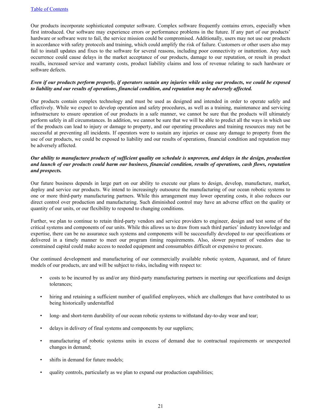 Our products incorporate sophisticated computer software. Complex software frequently contains errors, especially when first introduced. Our software may experience errors or performance problems in the future. If any part of our products’ hardware or software were to fail, the service mission could be compromised. Additionally, users may not use our products in accordance with safety protocols and training, which could amplify the risk of failure. Customers or other users also may fail to install updates and fixes to the software for several reasons, including poor connectivity or inattention. Any such occurrence could cause delays in the market acceptance of our products, damage to our reputation, or result in product recalls, increased service and warranty costs, product liability claims and loss of revenue relating to such hardware or software defects. Even if our products perform properly, if operators sustain any injuries while using our products, we could be exposed to liability and our results of operations, financial condition, and reputation may be adversely affected. Our products contain complex technology and must be used as designed and intended in order to operate safely and effectively. While we expect to develop operation and safety procedures, as well as a training, maintenance and servicing infrastructure to ensure operation of our products in a safe manner, we cannot be sure that the products will ultimately perform safely in all circumstances. In addition, we cannot be sure that we will be able to predict all the ways in which use of the products can lead to injury or damage to property, and our operating procedures and training resources may not be successful at preventing all incidents. If operators were to sustain any injuries or cause any damage to property from the use of our products, we could be exposed to liability and our results of operations, financial condition and reputation may be adversely affected. Our ability to manufacture products of sufficient quality on schedule is unproven, and delays in the design, production and launch of our products could harm our business, financial condition, results of operations, cash flows, reputation and prospects. Our future business depends in large part on our ability to execute our plans to design, develop, manufacture, market, deploy and service our products. We intend to increasingly outsource the manufacturing of our ocean robotic systems to one or more third-party manufacturing partners. While this arrangement may lower operating costs, it also reduces our direct control over production and manufacturing. Such diminished control may have an adverse effect on the quality or quantity of our units, or our flexibility to respond to changing conditions. Further, we plan to continue to retain third-party vendors and service providers to engineer, design and test some of the critical systems and components of our units. While this allows us to draw from such third parties’ industry knowledge and expertise, there can be no assurance such systems and components will be successfully developed to our specifications or delivered in a timely manner to meet our program timing requirements. Also, slower payment of vendors due to constrained capital could make access to needed equipment and consumables difficult or expensive to procure. Our continued development and manufacturing of our commercially available robotic system, Aquanaut, and of future models of our products, are and will be subject to risks, including with respect to: • costs to be incurred by us and/or any third-party manufacturing partners in meeting our specifications and design tolerances; • hiring and retaining a sufficient number of qualified employees, which are challenges that have contributed to us being historically understaffed • long- and short-term durability of our ocean robotic systems to withstand day-to-day wear and tear; • delays in delivery of final systems and components by our suppliers; • manufacturing of robotic systems units in excess of demand due to contractual requirements or unexpected changes in demand; • shifts in demand for future models; • quality controls, particularly as we plan to expand our production capabilities; Table of Contents 21