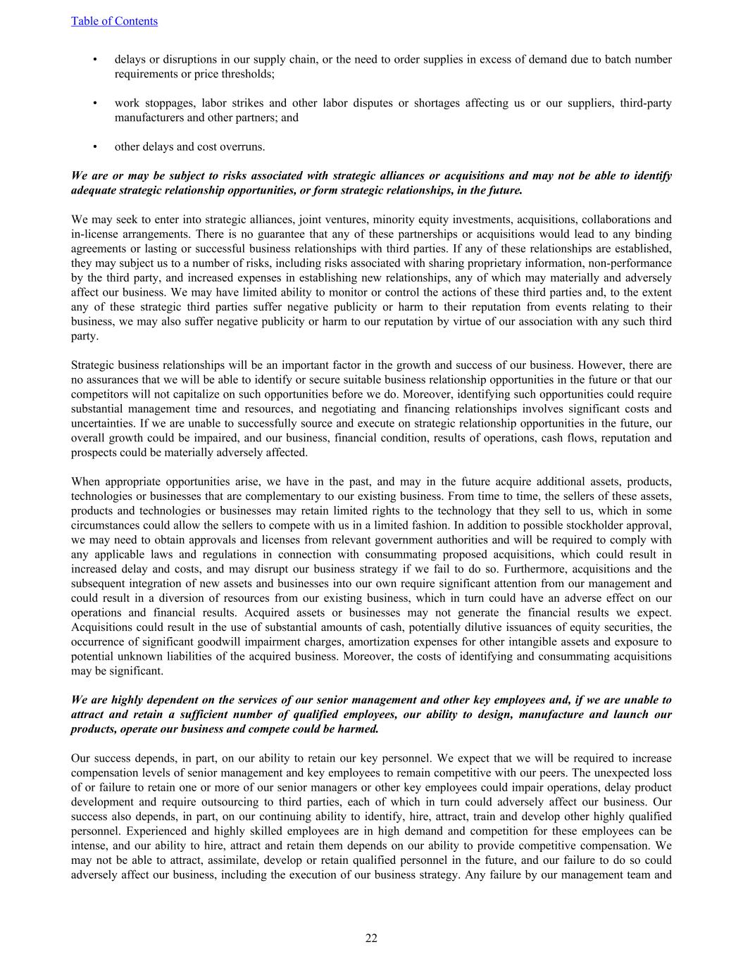 • delays or disruptions in our supply chain, or the need to order supplies in excess of demand due to batch number requirements or price thresholds; • work stoppages, labor strikes and other labor disputes or shortages affecting us or our suppliers, third-party manufacturers and other partners; and • other delays and cost overruns. We are or may be subject to risks associated with strategic alliances or acquisitions and may not be able to identify adequate strategic relationship opportunities, or form strategic relationships, in the future. We may seek to enter into strategic alliances, joint ventures, minority equity investments, acquisitions, collaborations and in-license arrangements. There is no guarantee that any of these partnerships or acquisitions would lead to any binding agreements or lasting or successful business relationships with third parties. If any of these relationships are established, they may subject us to a number of risks, including risks associated with sharing proprietary information, non-performance by the third party, and increased expenses in establishing new relationships, any of which may materially and adversely affect our business. We may have limited ability to monitor or control the actions of these third parties and, to the extent any of these strategic third parties suffer negative publicity or harm to their reputation from events relating to their business, we may also suffer negative publicity or harm to our reputation by virtue of our association with any such third party. Strategic business relationships will be an important factor in the growth and success of our business. However, there are no assurances that we will be able to identify or secure suitable business relationship opportunities in the future or that our competitors will not capitalize on such opportunities before we do. Moreover, identifying such opportunities could require substantial management time and resources, and negotiating and financing relationships involves significant costs and uncertainties. If we are unable to successfully source and execute on strategic relationship opportunities in the future, our overall growth could be impaired, and our business, financial condition, results of operations, cash flows, reputation and prospects could be materially adversely affected. When appropriate opportunities arise, we have in the past, and may in the future acquire additional assets, products, technologies or businesses that are complementary to our existing business. From time to time, the sellers of these assets, products and technologies or businesses may retain limited rights to the technology that they sell to us, which in some circumstances could allow the sellers to compete with us in a limited fashion. In addition to possible stockholder approval, we may need to obtain approvals and licenses from relevant government authorities and will be required to comply with any applicable laws and regulations in connection with consummating proposed acquisitions, which could result in increased delay and costs, and may disrupt our business strategy if we fail to do so. Furthermore, acquisitions and the subsequent integration of new assets and businesses into our own require significant attention from our management and could result in a diversion of resources from our existing business, which in turn could have an adverse effect on our operations and financial results. Acquired assets or businesses may not generate the financial results we expect. Acquisitions could result in the use of substantial amounts of cash, potentially dilutive issuances of equity securities, the occurrence of significant goodwill impairment charges, amortization expenses for other intangible assets and exposure to potential unknown liabilities of the acquired business. Moreover, the costs of identifying and consummating acquisitions may be significant. We are highly dependent on the services of our senior management and other key employees and, if we are unable to attract and retain a sufficient number of qualified employees, our ability to design, manufacture and launch our products, operate our business and compete could be harmed. Our success depends, in part, on our ability to retain our key personnel. We expect that we will be required to increase compensation levels of senior management and key employees to remain competitive with our peers. The unexpected loss of or failure to retain one or more of our senior managers or other key employees could impair operations, delay product development and require outsourcing to third parties, each of which in turn could adversely affect our business. Our success also depends, in part, on our continuing ability to identify, hire, attract, train and develop other highly qualified personnel. Experienced and highly skilled employees are in high demand and competition for these employees can be intense, and our ability to hire, attract and retain them depends on our ability to provide competitive compensation. We may not be able to attract, assimilate, develop or retain qualified personnel in the future, and our failure to do so could adversely affect our business, including the execution of our business strategy. Any failure by our management team and Table of Contents 22