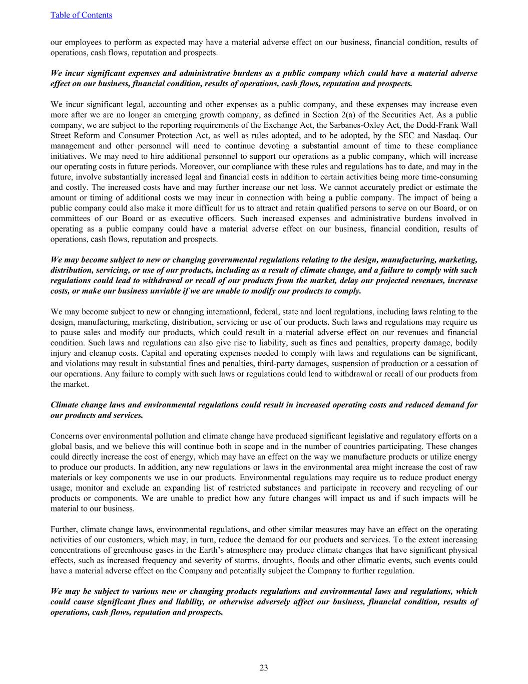 our employees to perform as expected may have a material adverse effect on our business, financial condition, results of operations, cash flows, reputation and prospects. We incur significant expenses and administrative burdens as a public company which could have a material adverse effect on our business, financial condition, results of operations, cash flows, reputation and prospects. We incur significant legal, accounting and other expenses as a public company, and these expenses may increase even more after we are no longer an emerging growth company, as defined in Section 2(a) of the Securities Act. As a public company, we are subject to the reporting requirements of the Exchange Act, the Sarbanes-Oxley Act, the Dodd-Frank Wall Street Reform and Consumer Protection Act, as well as rules adopted, and to be adopted, by the SEC and Nasdaq. Our management and other personnel will need to continue devoting a substantial amount of time to these compliance initiatives. We may need to hire additional personnel to support our operations as a public company, which will increase our operating costs in future periods. Moreover, our compliance with these rules and regulations has to date, and may in the future, involve substantially increased legal and financial costs in addition to certain activities being more time-consuming and costly. The increased costs have and may further increase our net loss. We cannot accurately predict or estimate the amount or timing of additional costs we may incur in connection with being a public company. The impact of being a public company could also make it more difficult for us to attract and retain qualified persons to serve on our Board, or on committees of our Board or as executive officers. Such increased expenses and administrative burdens involved in operating as a public company could have a material adverse effect on our business, financial condition, results of operations, cash flows, reputation and prospects. We may become subject to new or changing governmental regulations relating to the design, manufacturing, marketing, distribution, servicing, or use of our products, including as a result of climate change, and a failure to comply with such regulations could lead to withdrawal or recall of our products from the market, delay our projected revenues, increase costs, or make our business unviable if we are unable to modify our products to comply. We may become subject to new or changing international, federal, state and local regulations, including laws relating to the design, manufacturing, marketing, distribution, servicing or use of our products. Such laws and regulations may require us to pause sales and modify our products, which could result in a material adverse effect on our revenues and financial condition. Such laws and regulations can also give rise to liability, such as fines and penalties, property damage, bodily injury and cleanup costs. Capital and operating expenses needed to comply with laws and regulations can be significant, and violations may result in substantial fines and penalties, third-party damages, suspension of production or a cessation of our operations. Any failure to comply with such laws or regulations could lead to withdrawal or recall of our products from the market. Climate change laws and environmental regulations could result in increased operating costs and reduced demand for our products and services. Concerns over environmental pollution and climate change have produced significant legislative and regulatory efforts on a global basis, and we believe this will continue both in scope and in the number of countries participating. These changes could directly increase the cost of energy, which may have an effect on the way we manufacture products or utilize energy to produce our products. In addition, any new regulations or laws in the environmental area might increase the cost of raw materials or key components we use in our products. Environmental regulations may require us to reduce product energy usage, monitor and exclude an expanding list of restricted substances and participate in recovery and recycling of our products or components. We are unable to predict how any future changes will impact us and if such impacts will be material to our business. Further, climate change laws, environmental regulations, and other similar measures may have an effect on the operating activities of our customers, which may, in turn, reduce the demand for our products and services. To the extent increasing concentrations of greenhouse gases in the Earth’s atmosphere may produce climate changes that have significant physical effects, such as increased frequency and severity of storms, droughts, floods and other climatic events, such events could have a material adverse effect on the Company and potentially subject the Company to further regulation. We may be subject to various new or changing products regulations and environmental laws and regulations, which could cause significant fines and liability, or otherwise adversely affect our business, financial condition, results of operations, cash flows, reputation and prospects. Table of Contents 23