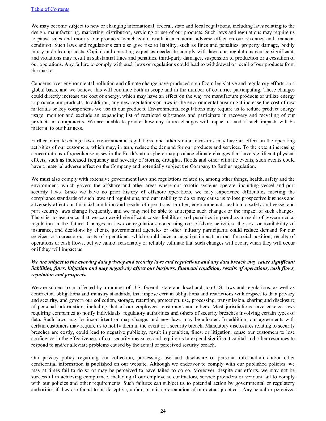 We may become subject to new or changing international, federal, state and local regulations, including laws relating to the design, manufacturing, marketing, distribution, servicing or use of our products. Such laws and regulations may require us to pause sales and modify our products, which could result in a material adverse effect on our revenues and financial condition. Such laws and regulations can also give rise to liability, such as fines and penalties, property damage, bodily injury and cleanup costs. Capital and operating expenses needed to comply with laws and regulations can be significant, and violations may result in substantial fines and penalties, third-party damages, suspension of production or a cessation of our operations. Any failure to comply with such laws or regulations could lead to withdrawal or recall of our products from the market. Concerns over environmental pollution and climate change have produced significant legislative and regulatory efforts on a global basis, and we believe this will continue both in scope and in the number of countries participating. These changes could directly increase the cost of energy, which may have an effect on the way we manufacture products or utilize energy to produce our products. In addition, any new regulations or laws in the environmental area might increase the cost of raw materials or key components we use in our products. Environmental regulations may require us to reduce product energy usage, monitor and exclude an expanding list of restricted substances and participate in recovery and recycling of our products or components. We are unable to predict how any future changes will impact us and if such impacts will be material to our business. Further, climate change laws, environmental regulations, and other similar measures may have an effect on the operating activities of our customers, which may, in turn, reduce the demand for our products and services. To the extent increasing concentrations of greenhouse gases in the Earth’s atmosphere may produce climate changes that have significant physical effects, such as increased frequency and severity of storms, droughts, floods and other climatic events, such events could have a material adverse effect on the Company and potentially subject the Company to further regulation. We must also comply with extensive government laws and regulations related to, among other things, health, safety and the environment, which govern the offshore and other areas where our robotic systems operate, including vessel and port security laws. Since we have no prior history of offshore operations, we may experience difficulties meeting the compliance standards of such laws and regulations, and our inability to do so may cause us to lose prospective business and adversely affect our financial condition and results of operations. Further, environmental, health and safety and vessel and port security laws change frequently, and we may not be able to anticipate such changes or the impact of such changes. There is no assurance that we can avoid significant costs, liabilities and penalties imposed as a result of governmental regulation in the future. Changes in laws or regulations concerning our offshore activities, the cost or availability of insurance, and decisions by clients, governmental agencies or other industry participants could reduce demand for our services or increase our costs of operations, which could have a negative impact on our financial position, results of operations or cash flows, but we cannot reasonably or reliably estimate that such changes will occur, when they will occur or if they will impact us. We are subject to the evolving data privacy and security laws and regulations and any data breach may cause significant liabilities, fines, litigation and may negatively affect our business, financial condition, results of operations, cash flows, reputation and prospects. We are subject to or affected by a number of U.S. federal, state and local and non-U.S. laws and regulations, as well as contractual obligations and industry standards, that impose certain obligations and restrictions with respect to data privacy and security, and govern our collection, storage, retention, protection, use, processing, transmission, sharing and disclosure of personal information, including that of our employees, customers and others. Most jurisdictions have enacted laws requiring companies to notify individuals, regulatory authorities and others of security breaches involving certain types of data. Such laws may be inconsistent or may change, and new laws may be adopted. In addition, our agreements with certain customers may require us to notify them in the event of a security breach. Mandatory disclosures relating to security breaches are costly, could lead to negative publicity, result in penalties, fines, or litigation, cause our customers to lose confidence in the effectiveness of our security measures and require us to expend significant capital and other resources to respond to and/or alleviate problems caused by the actual or perceived security breach. Our privacy policy regarding our collection, processing, use and disclosure of personal information and/or other confidential information is published on our website. Although we endeavor to comply with our published policies, we may at times fail to do so or may be perceived to have failed to do so. Moreover, despite our efforts, we may not be successful in achieving compliance, including if our employees, contractors, service providers or vendors fail to comply with our policies and other requirements. Such failures can subject us to potential action by governmental or regulatory authorities if they are found to be deceptive, unfair, or misrepresentation of our actual practices. Any actual or perceived Table of Contents 24
