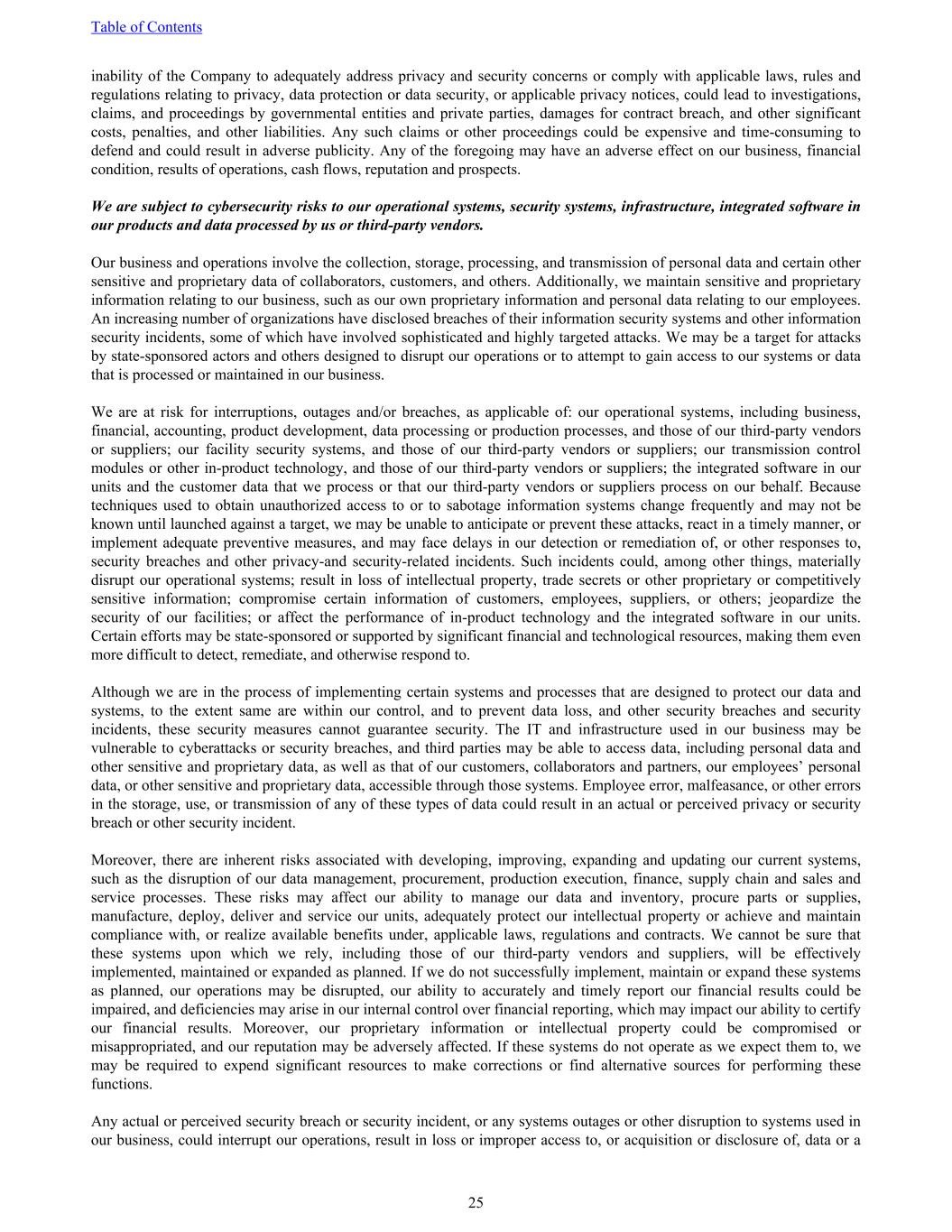 inability of the Company to adequately address privacy and security concerns or comply with applicable laws, rules and regulations relating to privacy, data protection or data security, or applicable privacy notices, could lead to investigations, claims, and proceedings by governmental entities and private parties, damages for contract breach, and other significant costs, penalties, and other liabilities. Any such claims or other proceedings could be expensive and time-consuming to defend and could result in adverse publicity. Any of the foregoing may have an adverse effect on our business, financial condition, results of operations, cash flows, reputation and prospects. We are subject to cybersecurity risks to our operational systems, security systems, infrastructure, integrated software in our products and data processed by us or third-party vendors. Our business and operations involve the collection, storage, processing, and transmission of personal data and certain other sensitive and proprietary data of collaborators, customers, and others. Additionally, we maintain sensitive and proprietary information relating to our business, such as our own proprietary information and personal data relating to our employees. An increasing number of organizations have disclosed breaches of their information security systems and other information security incidents, some of which have involved sophisticated and highly targeted attacks. We may be a target for attacks by state-sponsored actors and others designed to disrupt our operations or to attempt to gain access to our systems or data that is processed or maintained in our business. We are at risk for interruptions, outages and/or breaches, as applicable of: our operational systems, including business, financial, accounting, product development, data processing or production processes, and those of our third-party vendors or suppliers; our facility security systems, and those of our third-party vendors or suppliers; our transmission control modules or other in-product technology, and those of our third-party vendors or suppliers; the integrated software in our units and the customer data that we process or that our third-party vendors or suppliers process on our behalf. Because techniques used to obtain unauthorized access to or to sabotage information systems change frequently and may not be known until launched against a target, we may be unable to anticipate or prevent these attacks, react in a timely manner, or implement adequate preventive measures, and may face delays in our detection or remediation of, or other responses to, security breaches and other privacy-and security-related incidents. Such incidents could, among other things, materially disrupt our operational systems; result in loss of intellectual property, trade secrets or other proprietary or competitively sensitive information; compromise certain information of customers, employees, suppliers, or others; jeopardize the security of our facilities; or affect the performance of in-product technology and the integrated software in our units. Certain efforts may be state-sponsored or supported by significant financial and technological resources, making them even more difficult to detect, remediate, and otherwise respond to. Although we are in the process of implementing certain systems and processes that are designed to protect our data and systems, to the extent same are within our control, and to prevent data loss, and other security breaches and security incidents, these security measures cannot guarantee security. The IT and infrastructure used in our business may be vulnerable to cyberattacks or security breaches, and third parties may be able to access data, including personal data and other sensitive and proprietary data, as well as that of our customers, collaborators and partners, our employees’ personal data, or other sensitive and proprietary data, accessible through those systems. Employee error, malfeasance, or other errors in the storage, use, or transmission of any of these types of data could result in an actual or perceived privacy or security breach or other security incident. Moreover, there are inherent risks associated with developing, improving, expanding and updating our current systems, such as the disruption of our data management, procurement, production execution, finance, supply chain and sales and service processes. These risks may affect our ability to manage our data and inventory, procure parts or supplies, manufacture, deploy, deliver and service our units, adequately protect our intellectual property or achieve and maintain compliance with, or realize available benefits under, applicable laws, regulations and contracts. We cannot be sure that these systems upon which we rely, including those of our third-party vendors and suppliers, will be effectively implemented, maintained or expanded as planned. If we do not successfully implement, maintain or expand these systems as planned, our operations may be disrupted, our ability to accurately and timely report our financial results could be impaired, and deficiencies may arise in our internal control over financial reporting, which may impact our ability to certify our financial results. Moreover, our proprietary information or intellectual property could be compromised or misappropriated, and our reputation may be adversely affected. If these systems do not operate as we expect them to, we may be required to expend significant resources to make corrections or find alternative sources for performing these functions. Any actual or perceived security breach or security incident, or any systems outages or other disruption to systems used in our business, could interrupt our operations, result in loss or improper access to, or acquisition or disclosure of, data or a Table of Contents 25