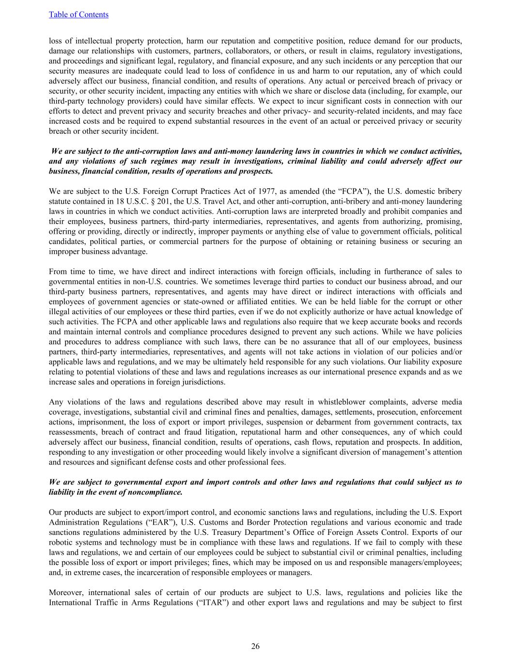loss of intellectual property protection, harm our reputation and competitive position, reduce demand for our products, damage our relationships with customers, partners, collaborators, or others, or result in claims, regulatory investigations, and proceedings and significant legal, regulatory, and financial exposure, and any such incidents or any perception that our security measures are inadequate could lead to loss of confidence in us and harm to our reputation, any of which could adversely affect our business, financial condition, and results of operations. Any actual or perceived breach of privacy or security, or other security incident, impacting any entities with which we share or disclose data (including, for example, our third-party technology providers) could have similar effects. We expect to incur significant costs in connection with our efforts to detect and prevent privacy and security breaches and other privacy- and security-related incidents, and may face increased costs and be required to expend substantial resources in the event of an actual or perceived privacy or security breach or other security incident. We are subject to the anti-corruption laws and anti-money laundering laws in countries in which we conduct activities, and any violations of such regimes may result in investigations, criminal liability and could adversely affect our business, financial condition, results of operations and prospects. We are subject to the U.S. Foreign Corrupt Practices Act of 1977, as amended (the “FCPA”), the U.S. domestic bribery statute contained in 18 U.S.C. § 201, the U.S. Travel Act, and other anti-corruption, anti-bribery and anti-money laundering laws in countries in which we conduct activities. Anti-corruption laws are interpreted broadly and prohibit companies and their employees, business partners, third-party intermediaries, representatives, and agents from authorizing, promising, offering or providing, directly or indirectly, improper payments or anything else of value to government officials, political candidates, political parties, or commercial partners for the purpose of obtaining or retaining business or securing an improper business advantage. From time to time, we have direct and indirect interactions with foreign officials, including in furtherance of sales to governmental entities in non-U.S. countries. We sometimes leverage third parties to conduct our business abroad, and our third-party business partners, representatives, and agents may have direct or indirect interactions with officials and employees of government agencies or state-owned or affiliated entities. We can be held liable for the corrupt or other illegal activities of our employees or these third parties, even if we do not explicitly authorize or have actual knowledge of such activities. The FCPA and other applicable laws and regulations also require that we keep accurate books and records and maintain internal controls and compliance procedures designed to prevent any such actions. While we have policies and procedures to address compliance with such laws, there can be no assurance that all of our employees, business partners, third-party intermediaries, representatives, and agents will not take actions in violation of our policies and/or applicable laws and regulations, and we may be ultimately held responsible for any such violations. Our liability exposure relating to potential violations of these and laws and regulations increases as our international presence expands and as we increase sales and operations in foreign jurisdictions. Any violations of the laws and regulations described above may result in whistleblower complaints, adverse media coverage, investigations, substantial civil and criminal fines and penalties, damages, settlements, prosecution, enforcement actions, imprisonment, the loss of export or import privileges, suspension or debarment from government contracts, tax reassessments, breach of contract and fraud litigation, reputational harm and other consequences, any of which could adversely affect our business, financial condition, results of operations, cash flows, reputation and prospects. In addition, responding to any investigation or other proceeding would likely involve a significant diversion of management’s attention and resources and significant defense costs and other professional fees. We are subject to governmental export and import controls and other laws and regulations that could subject us to liability in the event of noncompliance. Our products are subject to export/import control, and economic sanctions laws and regulations, including the U.S. Export Administration Regulations (“EAR”), U.S. Customs and Border Protection regulations and various economic and trade sanctions regulations administered by the U.S. Treasury Department’s Office of Foreign Assets Control. Exports of our robotic systems and technology must be in compliance with these laws and regulations. If we fail to comply with these laws and regulations, we and certain of our employees could be subject to substantial civil or criminal penalties, including the possible loss of export or import privileges; fines, which may be imposed on us and responsible managers/employees; and, in extreme cases, the incarceration of responsible employees or managers. Moreover, international sales of certain of our products are subject to U.S. laws, regulations and policies like the International Traffic in Arms Regulations (“ITAR”) and other export laws and regulations and may be subject to first Table of Contents 26