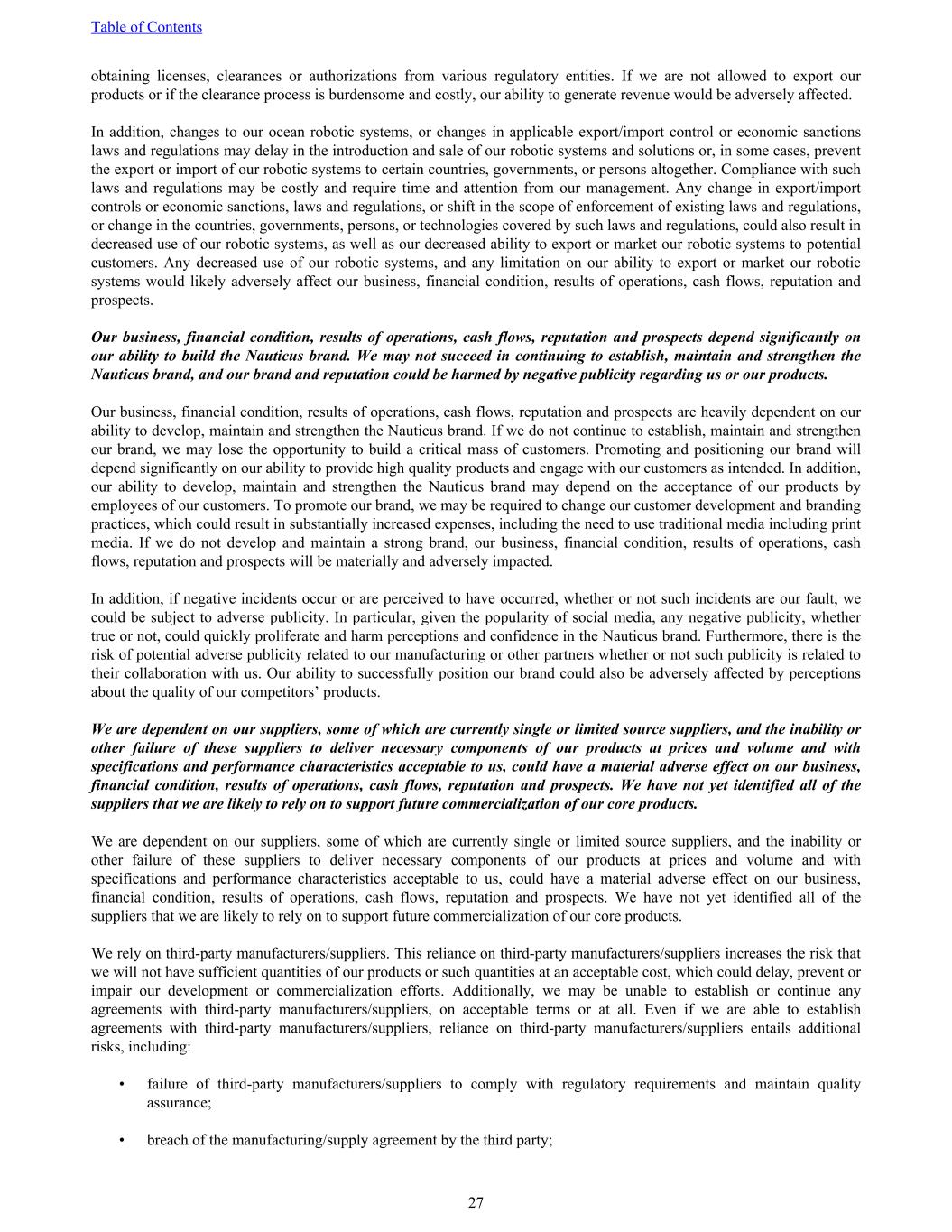 obtaining licenses, clearances or authorizations from various regulatory entities. If we are not allowed to export our products or if the clearance process is burdensome and costly, our ability to generate revenue would be adversely affected. In addition, changes to our ocean robotic systems, or changes in applicable export/import control or economic sanctions laws and regulations may delay in the introduction and sale of our robotic systems and solutions or, in some cases, prevent the export or import of our robotic systems to certain countries, governments, or persons altogether. Compliance with such laws and regulations may be costly and require time and attention from our management. Any change in export/import controls or economic sanctions, laws and regulations, or shift in the scope of enforcement of existing laws and regulations, or change in the countries, governments, persons, or technologies covered by such laws and regulations, could also result in decreased use of our robotic systems, as well as our decreased ability to export or market our robotic systems to potential customers. Any decreased use of our robotic systems, and any limitation on our ability to export or market our robotic systems would likely adversely affect our business, financial condition, results of operations, cash flows, reputation and prospects. Our business, financial condition, results of operations, cash flows, reputation and prospects depend significantly on our ability to build the Nauticus brand. We may not succeed in continuing to establish, maintain and strengthen the Nauticus brand, and our brand and reputation could be harmed by negative publicity regarding us or our products. Our business, financial condition, results of operations, cash flows, reputation and prospects are heavily dependent on our ability to develop, maintain and strengthen the Nauticus brand. If we do not continue to establish, maintain and strengthen our brand, we may lose the opportunity to build a critical mass of customers. Promoting and positioning our brand will depend significantly on our ability to provide high quality products and engage with our customers as intended. In addition, our ability to develop, maintain and strengthen the Nauticus brand may depend on the acceptance of our products by employees of our customers. To promote our brand, we may be required to change our customer development and branding practices, which could result in substantially increased expenses, including the need to use traditional media including print media. If we do not develop and maintain a strong brand, our business, financial condition, results of operations, cash flows, reputation and prospects will be materially and adversely impacted. In addition, if negative incidents occur or are perceived to have occurred, whether or not such incidents are our fault, we could be subject to adverse publicity. In particular, given the popularity of social media, any negative publicity, whether true or not, could quickly proliferate and harm perceptions and confidence in the Nauticus brand. Furthermore, there is the risk of potential adverse publicity related to our manufacturing or other partners whether or not such publicity is related to their collaboration with us. Our ability to successfully position our brand could also be adversely affected by perceptions about the quality of our competitors’ products. We are dependent on our suppliers, some of which are currently single or limited source suppliers, and the inability or other failure of these suppliers to deliver necessary components of our products at prices and volume and with specifications and performance characteristics acceptable to us, could have a material adverse effect on our business, financial condition, results of operations, cash flows, reputation and prospects. We have not yet identified all of the suppliers that we are likely to rely on to support future commercialization of our core products. We are dependent on our suppliers, some of which are currently single or limited source suppliers, and the inability or other failure of these suppliers to deliver necessary components of our products at prices and volume and with specifications and performance characteristics acceptable to us, could have a material adverse effect on our business, financial condition, results of operations, cash flows, reputation and prospects. We have not yet identified all of the suppliers that we are likely to rely on to support future commercialization of our core products. We rely on third-party manufacturers/suppliers. This reliance on third-party manufacturers/suppliers increases the risk that we will not have sufficient quantities of our products or such quantities at an acceptable cost, which could delay, prevent or impair our development or commercialization efforts. Additionally, we may be unable to establish or continue any agreements with third-party manufacturers/suppliers, on acceptable terms or at all. Even if we are able to establish agreements with third-party manufacturers/suppliers, reliance on third-party manufacturers/suppliers entails additional risks, including: • failure of third-party manufacturers/suppliers to comply with regulatory requirements and maintain quality assurance; • breach of the manufacturing/supply agreement by the third party; Table of Contents 27