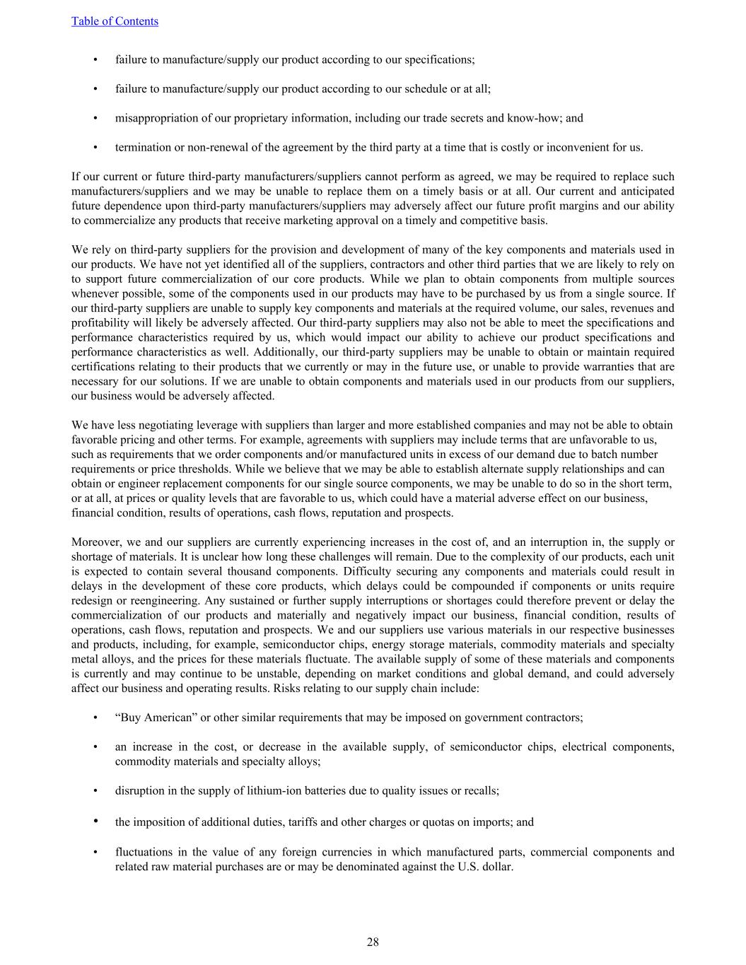 • failure to manufacture/supply our product according to our specifications; • failure to manufacture/supply our product according to our schedule or at all; • misappropriation of our proprietary information, including our trade secrets and know-how; and • termination or non-renewal of the agreement by the third party at a time that is costly or inconvenient for us. If our current or future third-party manufacturers/suppliers cannot perform as agreed, we may be required to replace such manufacturers/suppliers and we may be unable to replace them on a timely basis or at all. Our current and anticipated future dependence upon third-party manufacturers/suppliers may adversely affect our future profit margins and our ability to commercialize any products that receive marketing approval on a timely and competitive basis. We rely on third-party suppliers for the provision and development of many of the key components and materials used in our products. We have not yet identified all of the suppliers, contractors and other third parties that we are likely to rely on to support future commercialization of our core products. While we plan to obtain components from multiple sources whenever possible, some of the components used in our products may have to be purchased by us from a single source. If our third-party suppliers are unable to supply key components and materials at the required volume, our sales, revenues and profitability will likely be adversely affected. Our third-party suppliers may also not be able to meet the specifications and performance characteristics required by us, which would impact our ability to achieve our product specifications and performance characteristics as well. Additionally, our third-party suppliers may be unable to obtain or maintain required certifications relating to their products that we currently or may in the future use, or unable to provide warranties that are necessary for our solutions. If we are unable to obtain components and materials used in our products from our suppliers, our business would be adversely affected. We have less negotiating leverage with suppliers than larger and more established companies and may not be able to obtain favorable pricing and other terms. For example, agreements with suppliers may include terms that are unfavorable to us, such as requirements that we order components and/or manufactured units in excess of our demand due to batch number requirements or price thresholds. While we believe that we may be able to establish alternate supply relationships and can obtain or engineer replacement components for our single source components, we may be unable to do so in the short term, or at all, at prices or quality levels that are favorable to us, which could have a material adverse effect on our business, financial condition, results of operations, cash flows, reputation and prospects. Moreover, we and our suppliers are currently experiencing increases in the cost of, and an interruption in, the supply or shortage of materials. It is unclear how long these challenges will remain. Due to the complexity of our products, each unit is expected to contain several thousand components. Difficulty securing any components and materials could result in delays in the development of these core products, which delays could be compounded if components or units require redesign or reengineering. Any sustained or further supply interruptions or shortages could therefore prevent or delay the commercialization of our products and materially and negatively impact our business, financial condition, results of operations, cash flows, reputation and prospects. We and our suppliers use various materials in our respective businesses and products, including, for example, semiconductor chips, energy storage materials, commodity materials and specialty metal alloys, and the prices for these materials fluctuate. The available supply of some of these materials and components is currently and may continue to be unstable, depending on market conditions and global demand, and could adversely affect our business and operating results. Risks relating to our supply chain include: • “Buy American” or other similar requirements that may be imposed on government contractors; • an increase in the cost, or decrease in the available supply, of semiconductor chips, electrical components, commodity materials and specialty alloys; • disruption in the supply of lithium-ion batteries due to quality issues or recalls; • the imposition of additional duties, tariffs and other charges or quotas on imports; and • fluctuations in the value of any foreign currencies in which manufactured parts, commercial components and related raw material purchases are or may be denominated against the U.S. dollar. Table of Contents 28