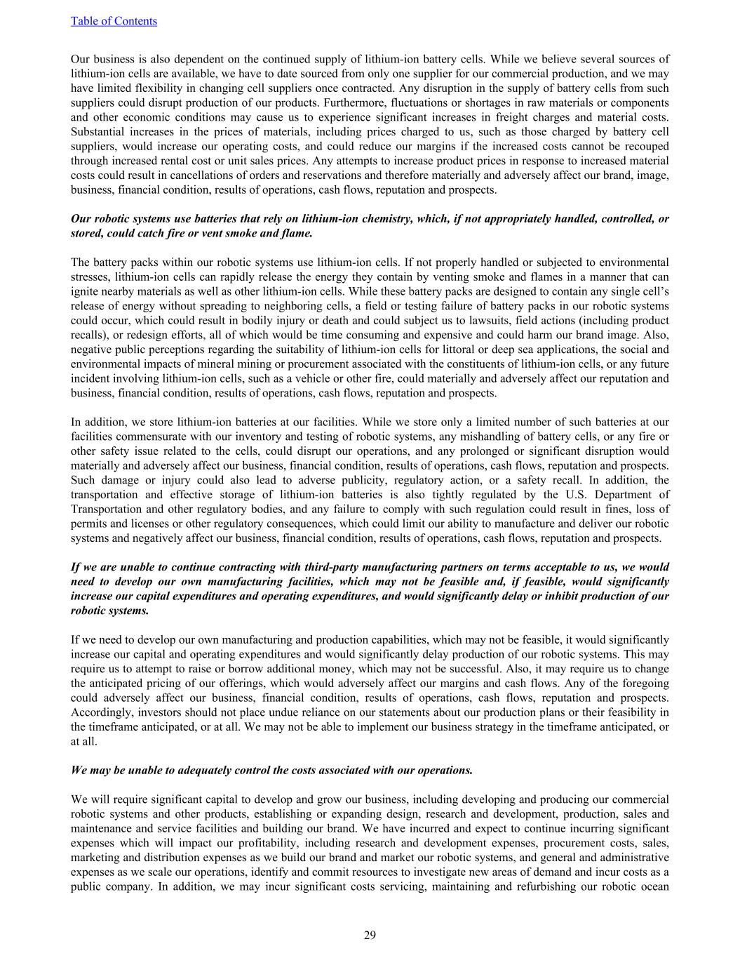 Our business is also dependent on the continued supply of lithium-ion battery cells. While we believe several sources of lithium-ion cells are available, we have to date sourced from only one supplier for our commercial production, and we may have limited flexibility in changing cell suppliers once contracted. Any disruption in the supply of battery cells from such suppliers could disrupt production of our products. Furthermore, fluctuations or shortages in raw materials or components and other economic conditions may cause us to experience significant increases in freight charges and material costs. Substantial increases in the prices of materials, including prices charged to us, such as those charged by battery cell suppliers, would increase our operating costs, and could reduce our margins if the increased costs cannot be recouped through increased rental cost or unit sales prices. Any attempts to increase product prices in response to increased material costs could result in cancellations of orders and reservations and therefore materially and adversely affect our brand, image, business, financial condition, results of operations, cash flows, reputation and prospects. Our robotic systems use batteries that rely on lithium-ion chemistry, which, if not appropriately handled, controlled, or stored, could catch fire or vent smoke and flame. The battery packs within our robotic systems use lithium-ion cells. If not properly handled or subjected to environmental stresses, lithium-ion cells can rapidly release the energy they contain by venting smoke and flames in a manner that can ignite nearby materials as well as other lithium-ion cells. While these battery packs are designed to contain any single cell’s release of energy without spreading to neighboring cells, a field or testing failure of battery packs in our robotic systems could occur, which could result in bodily injury or death and could subject us to lawsuits, field actions (including product recalls), or redesign efforts, all of which would be time consuming and expensive and could harm our brand image. Also, negative public perceptions regarding the suitability of lithium-ion cells for littoral or deep sea applications, the social and environmental impacts of mineral mining or procurement associated with the constituents of lithium-ion cells, or any future incident involving lithium-ion cells, such as a vehicle or other fire, could materially and adversely affect our reputation and business, financial condition, results of operations, cash flows, reputation and prospects. In addition, we store lithium-ion batteries at our facilities. While we store only a limited number of such batteries at our facilities commensurate with our inventory and testing of robotic systems, any mishandling of battery cells, or any fire or other safety issue related to the cells, could disrupt our operations, and any prolonged or significant disruption would materially and adversely affect our business, financial condition, results of operations, cash flows, reputation and prospects. Such damage or injury could also lead to adverse publicity, regulatory action, or a safety recall. In addition, the transportation and effective storage of lithium-ion batteries is also tightly regulated by the U.S. Department of Transportation and other regulatory bodies, and any failure to comply with such regulation could result in fines, loss of permits and licenses or other regulatory consequences, which could limit our ability to manufacture and deliver our robotic systems and negatively affect our business, financial condition, results of operations, cash flows, reputation and prospects. If we are unable to continue contracting with third-party manufacturing partners on terms acceptable to us, we would need to develop our own manufacturing facilities, which may not be feasible and, if feasible, would significantly increase our capital expenditures and operating expenditures, and would significantly delay or inhibit production of our robotic systems. If we need to develop our own manufacturing and production capabilities, which may not be feasible, it would significantly increase our capital and operating expenditures and would significantly delay production of our robotic systems. This may require us to attempt to raise or borrow additional money, which may not be successful. Also, it may require us to change the anticipated pricing of our offerings, which would adversely affect our margins and cash flows. Any of the foregoing could adversely affect our business, financial condition, results of operations, cash flows, reputation and prospects. Accordingly, investors should not place undue reliance on our statements about our production plans or their feasibility in the timeframe anticipated, or at all. We may not be able to implement our business strategy in the timeframe anticipated, or at all. We may be unable to adequately control the costs associated with our operations. We will require significant capital to develop and grow our business, including developing and producing our commercial robotic systems and other products, establishing or expanding design, research and development, production, sales and maintenance and service facilities and building our brand. We have incurred and expect to continue incurring significant expenses which will impact our profitability, including research and development expenses, procurement costs, sales, marketing and distribution expenses as we build our brand and market our robotic systems, and general and administrative expenses as we scale our operations, identify and commit resources to investigate new areas of demand and incur costs as a public company. In addition, we may incur significant costs servicing, maintaining and refurbishing our robotic ocean Table of Contents 29